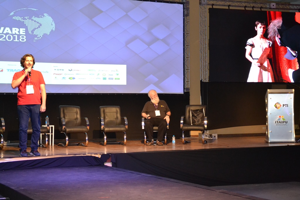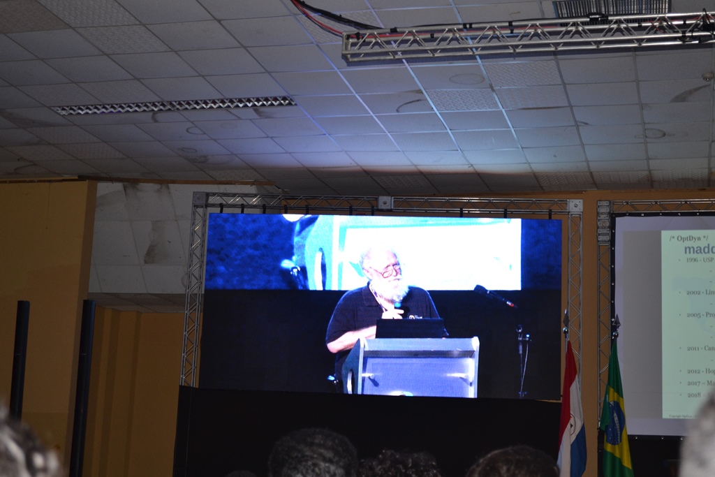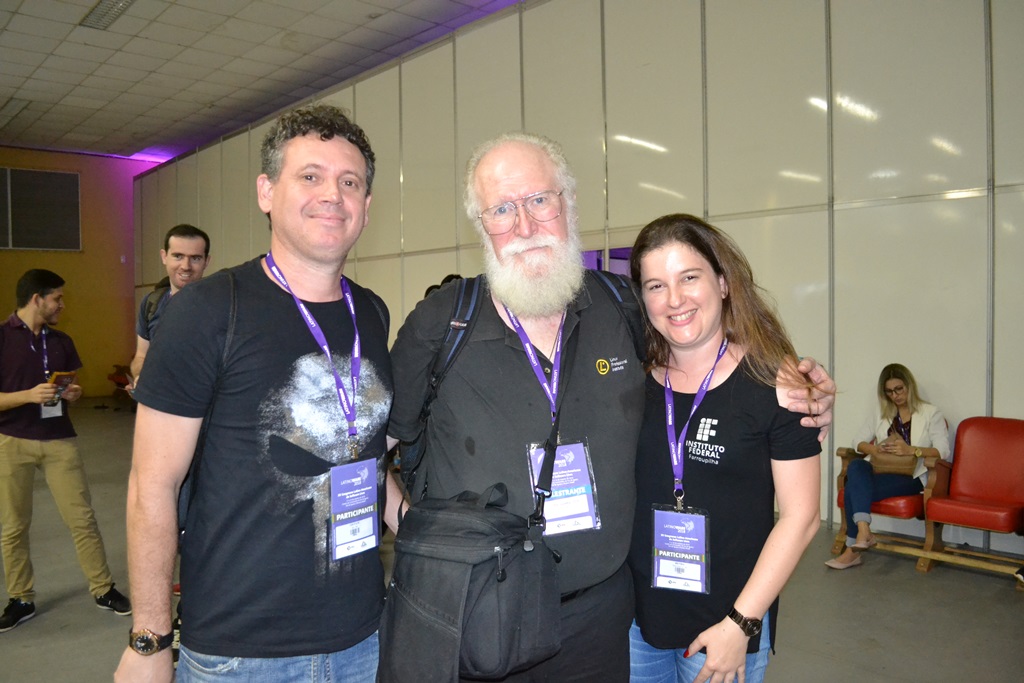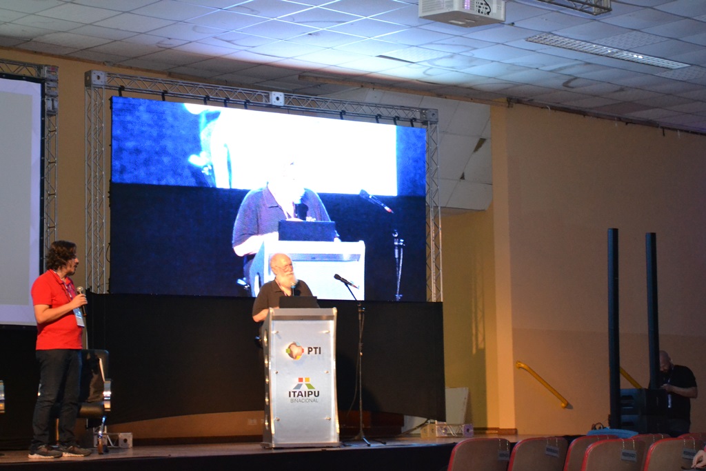 Figura já carimbada do evento, John “Maddog” Hall, em sua palestra traçou uma breve linha do tempo com análises e críticas ao desenvolvimento da tecnologia desde 1969, ano de origem do Linux, até a atualidade; identificando desafios, competências, falhas e riscos para posteridade.