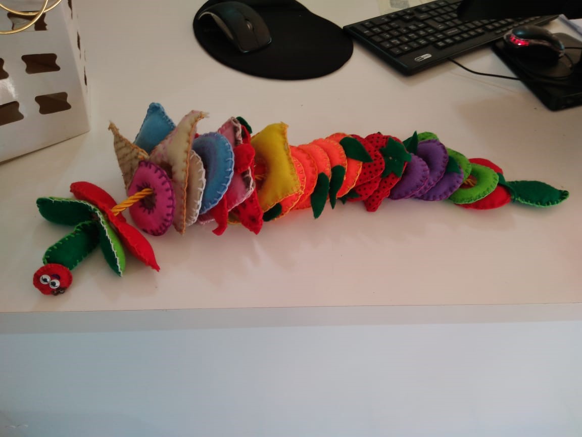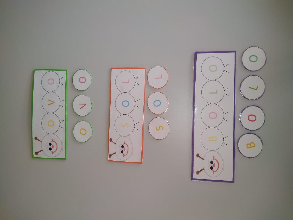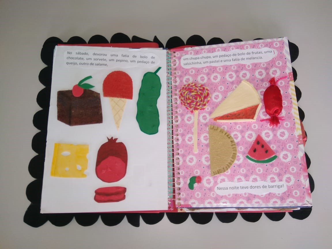 A partir disso, a turma começou a buscar exemplos de atividades, que poderiam ser desenvolvidas a partir da história da “Lagarta Comilona”, e que atenderiam ao público daquela turma. “Como a professora Cleunice não tinha o exemplar do livro, um dos grupos ficou encarregado de construir a história em tamanho maior, com textura e cores vibrantes. Outros grupos ficaram encarregados de construírem materiais de montar conforme a ordem de números, encaixar, de trabalhar as diferentes formas, de formar palavras, e montar conforme a ordem dos fatos”.