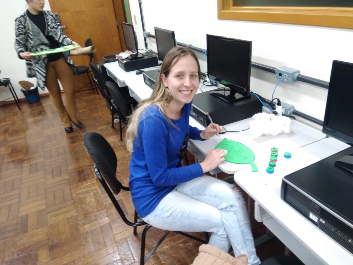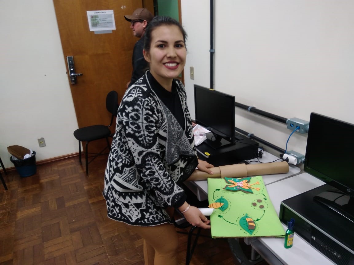 A entrega dos materiais didáticos para a equipe da APAE de Santo Augusto, feitos a partir da história da “Lagarta Comilona”, aconteceu no dia 24 de outubro, e contou com a participação, além da professora Camila, também de alguns estudantes da Licenciatura em Ciências Biológicas.