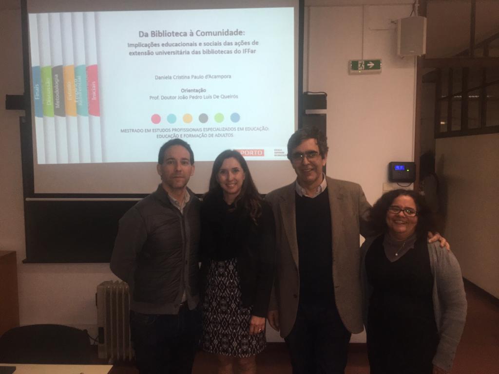 A bibliotecária, Daniela Cristina Paulo d’Acampora, defendeu a dissertação “Da biblioteca à comunidade: implicações educacionais e sociais das ações de extensão universitária das bibliotecas do IFFar”, tendo na banca os professores, Dr. Luís Rothes (presidente), Drª. Ivaneide Dias Pereira Mendes (arguente) e Dr.João Pedro Luís de Queirós (orientador).