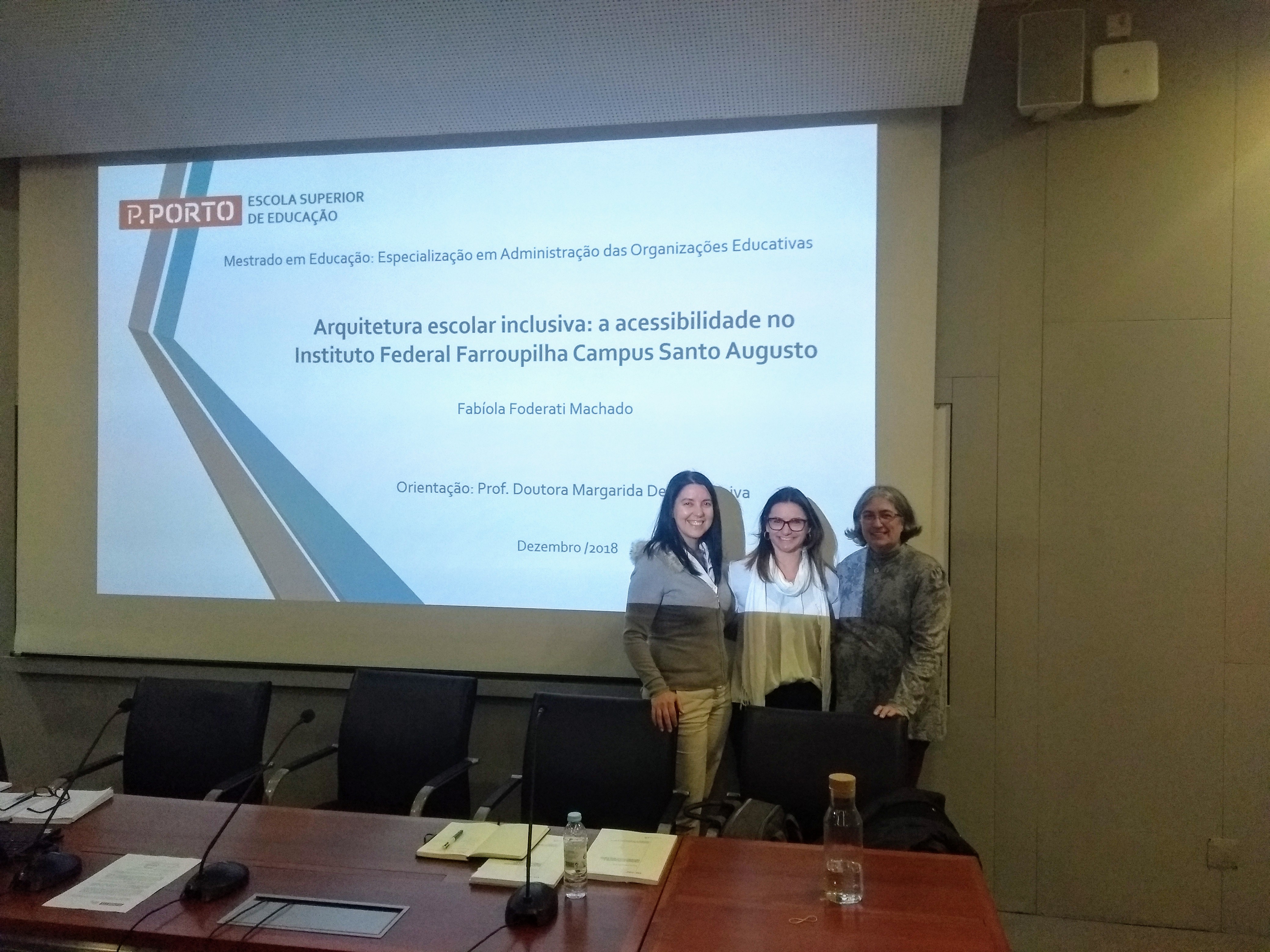 A arquiteta, Fabíola Machado, defendeu a dissertação “Arquitetura escolar inclusiva: a acessibilidade no Instituto Federal Farroupilha Campus Santo Augusto”, tendo na banca os professores, Drª. Maria José Freitas Borges de Araújo (presidente), Drª. Paula Cristina Romão Pereira (arguente) e Drª. Margarida Maria Delgado Paiva (orientadora).