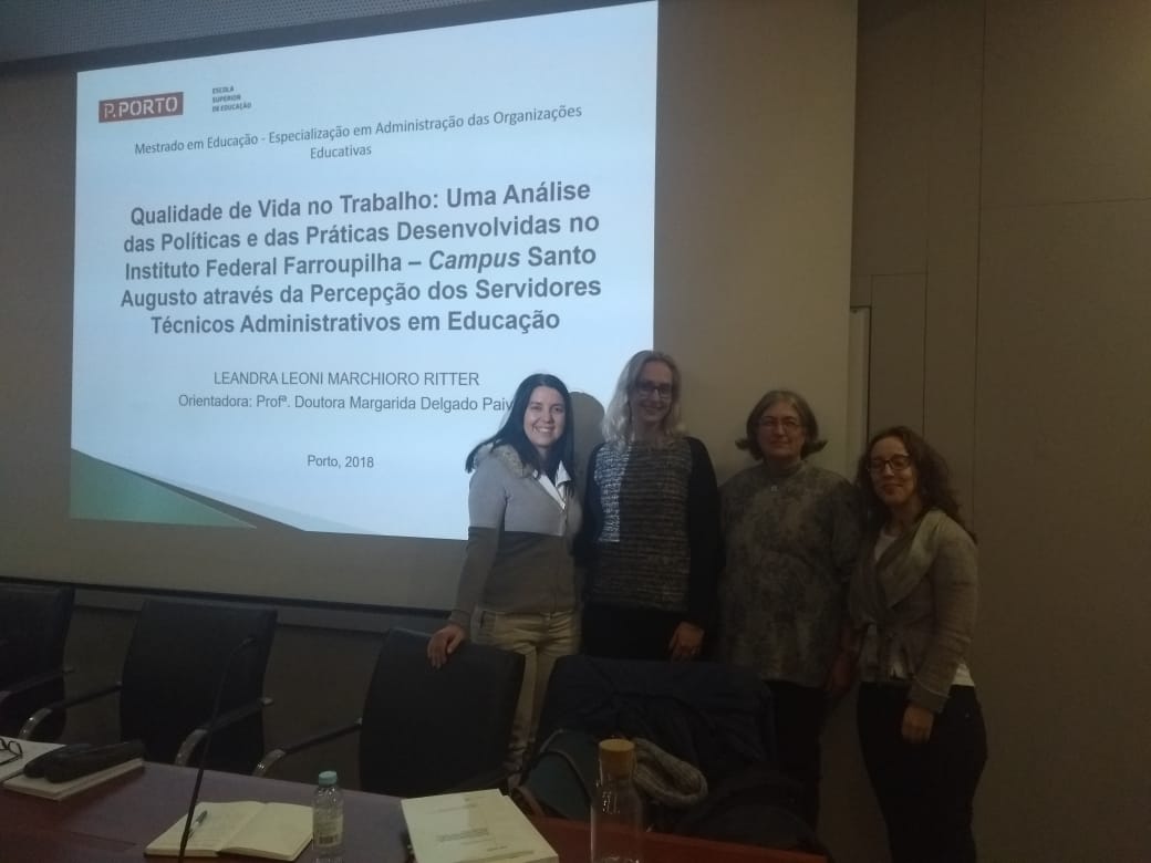 A Diretora de Administração, Leandra Leoni Ritter, defendeu a dissertação “Qualidade de Vida no Trabalho: Uma análise das políticas e das práticas desenvolvidas no IFFar - Campus Santo Augusto através da percepção dos servidores técnicos administrativos em educação”, tendo na banca os professores, Drª. Paula Cristina Romão Pereira (presidente), Drª. Carina Moreira Coelho (arguente) e Drª. Margarida Delgado Paiva (orientadora).