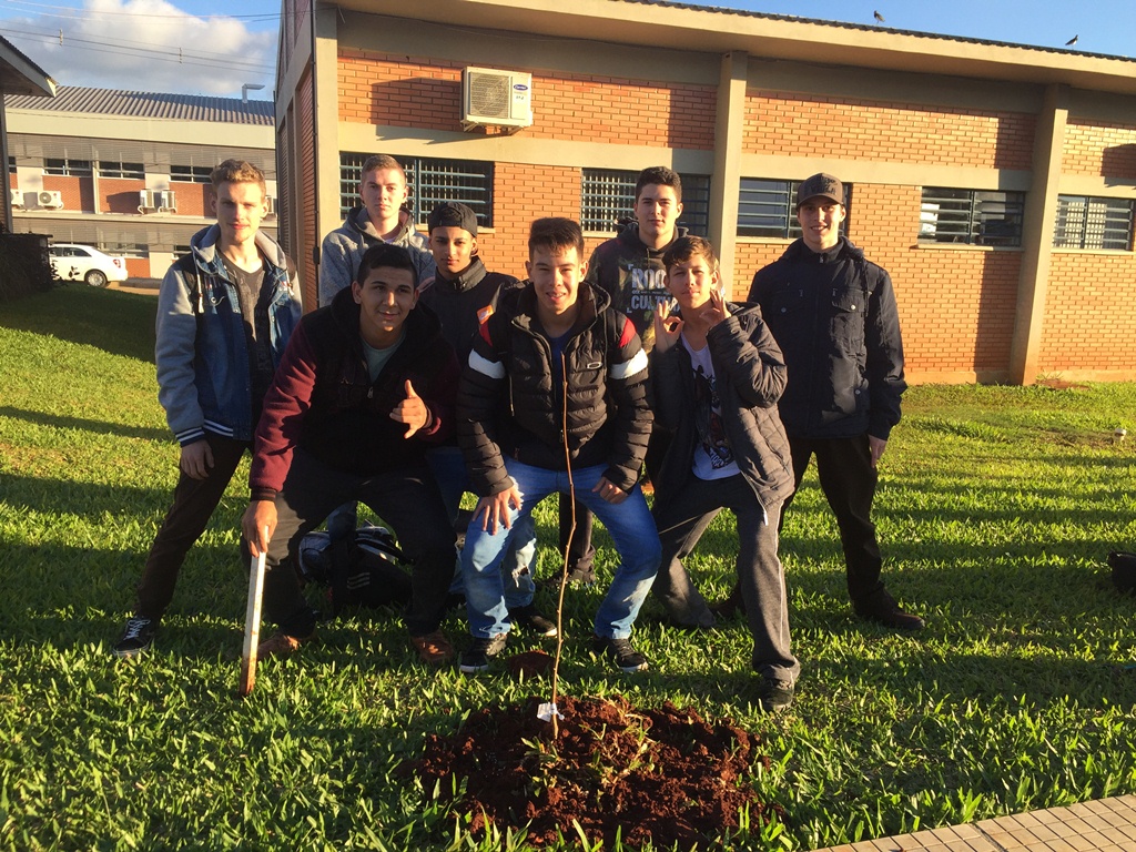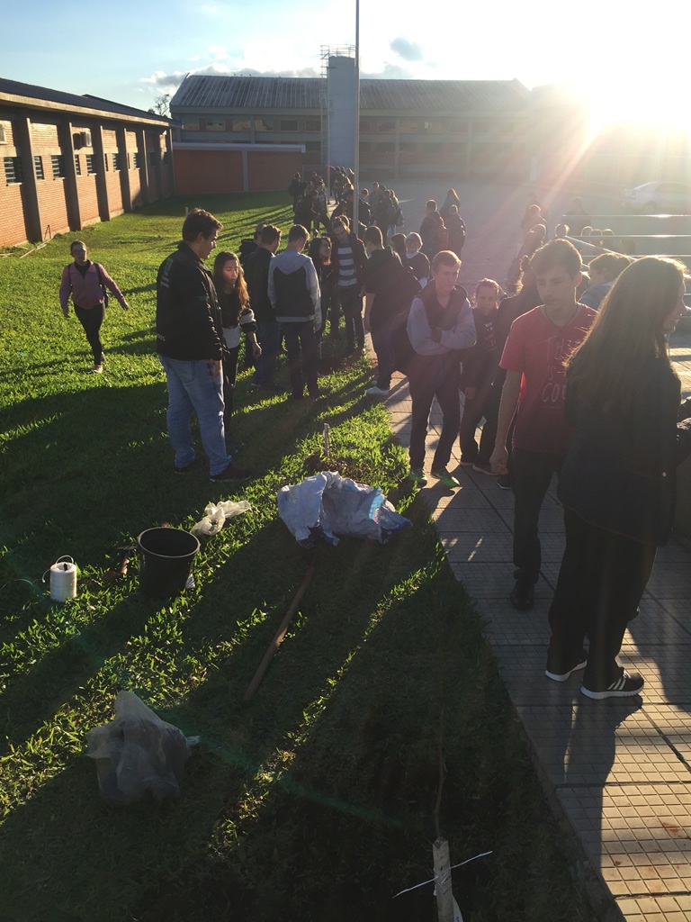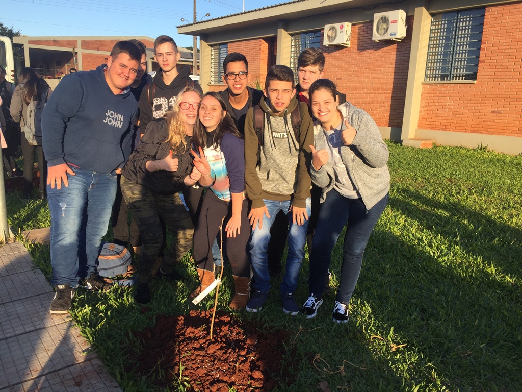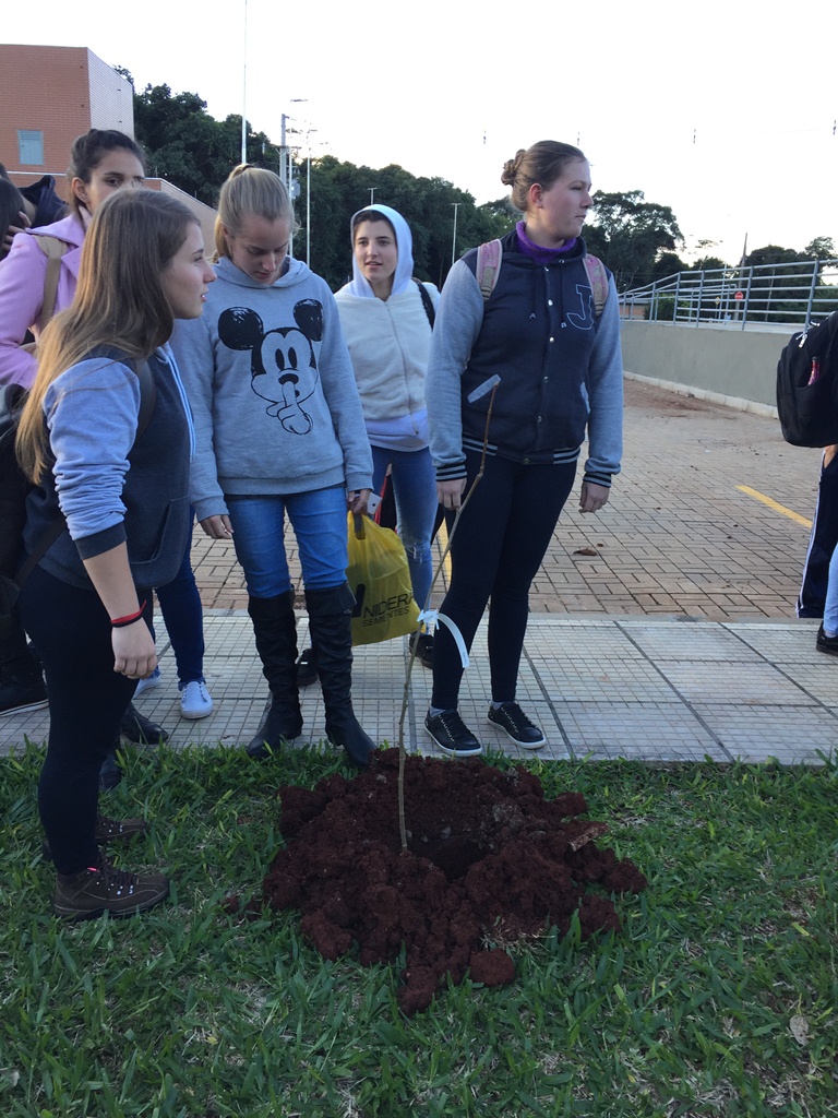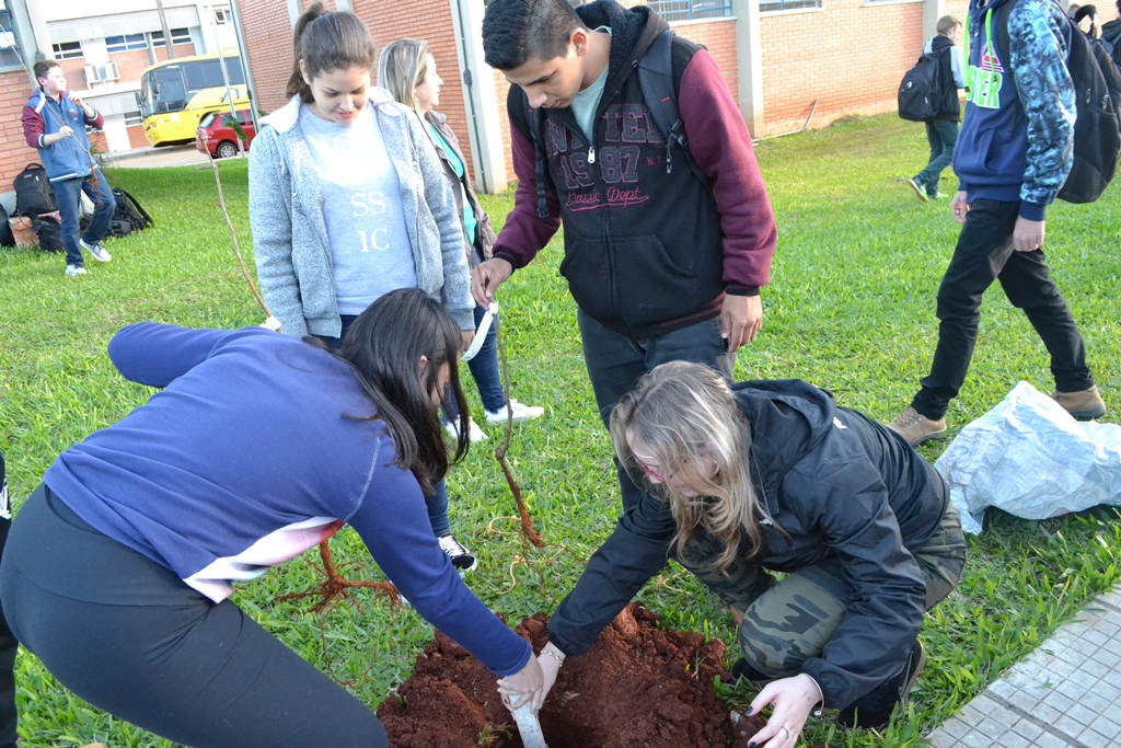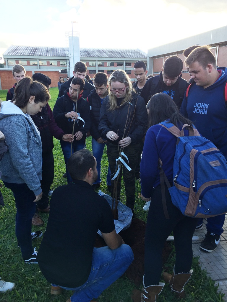 Após a palestra, os estudantes, acompanhados pelos professores Clarinês Hames, Franciele de Oliveira e Ricardo Paraginski, realizaram no gramado que fica ao lado do estacionamento da biblioteca, o plantio de 11 mudas de plátano, doadas pelo estudante do 1º ano, Giovani Weber, filho de Décio Weber, proprietário dos Viveiros Weber, do município de Crissiumal-RS.