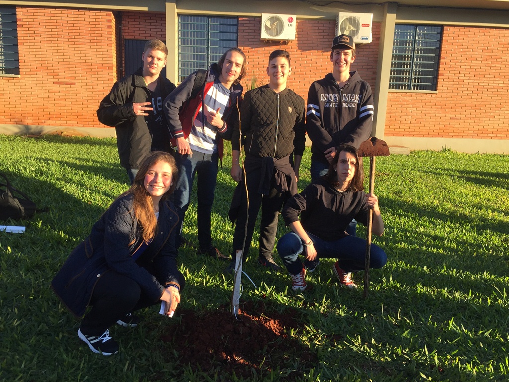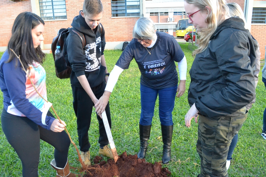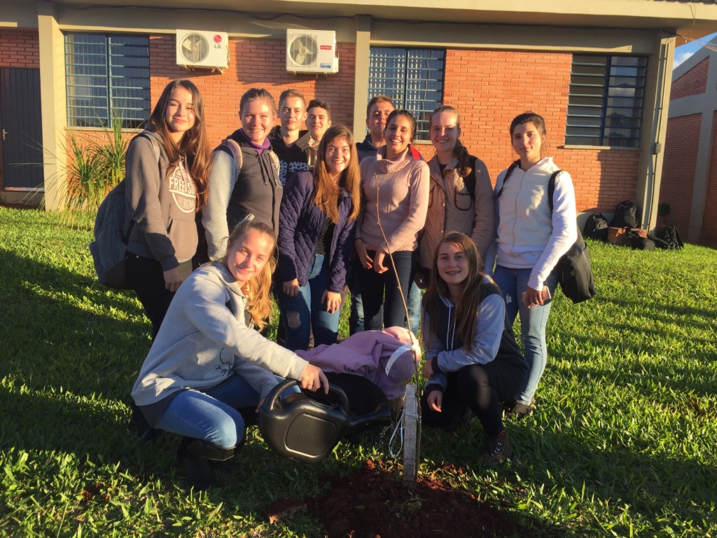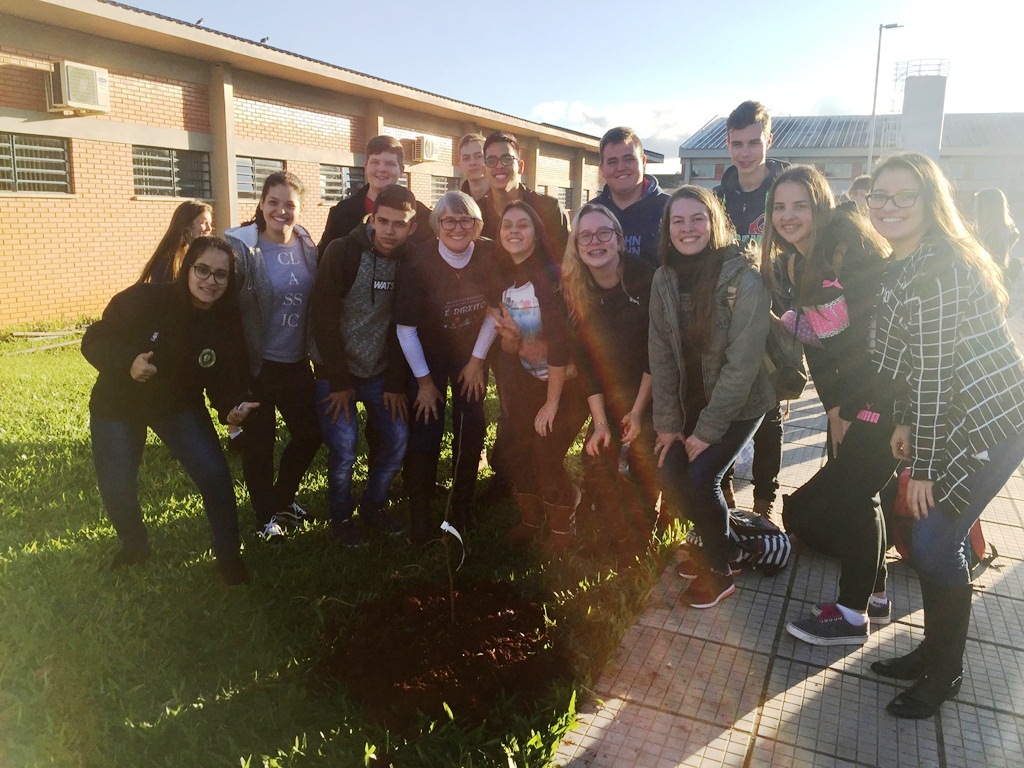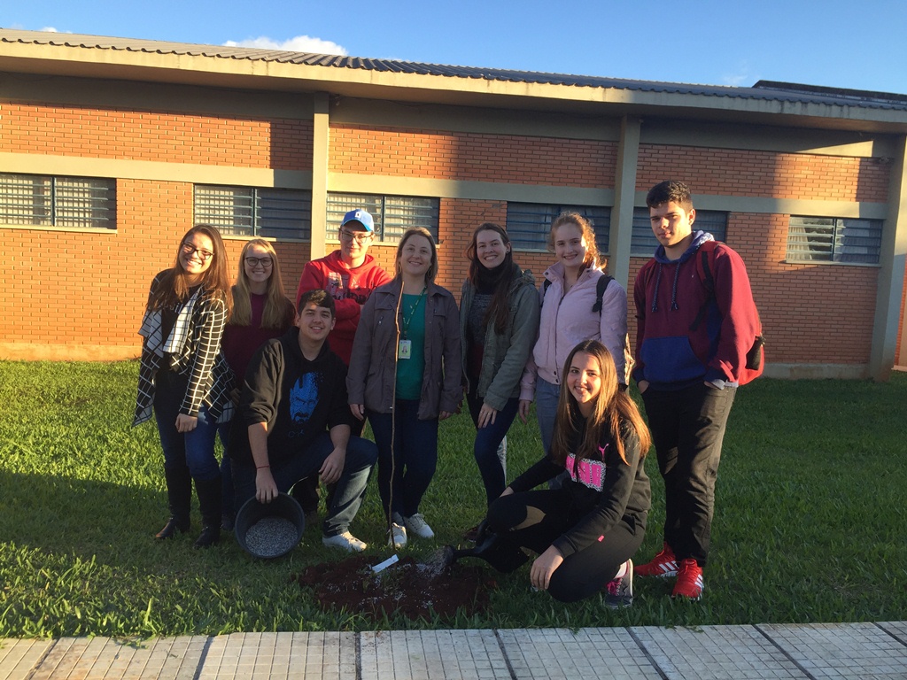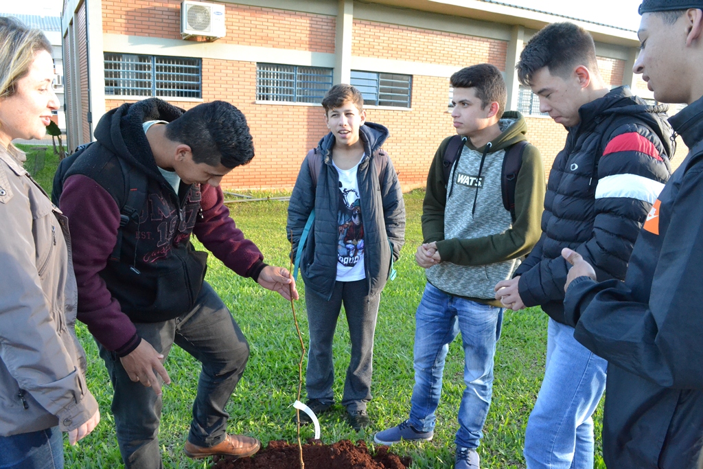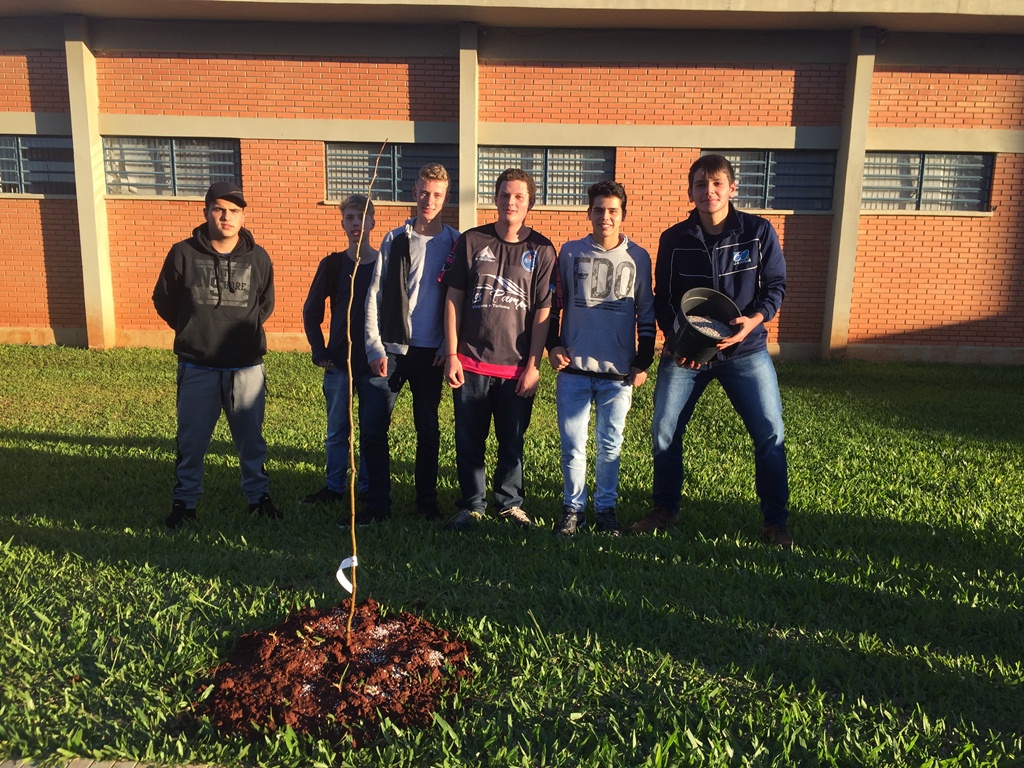 Após a palestra, os estudantes, acompanhados pelos professores Clarinês Hames, Franciele de Oliveira e Ricardo Paraginski, realizaram no gramado que fica ao lado do estacionamento da biblioteca, o plantio de 11 mudas de plátano, doadas pelo estudante do 1º ano, Giovani Weber, filho de Décio Weber, proprietário dos Viveiros Weber, do município de Crissiumal-RS.