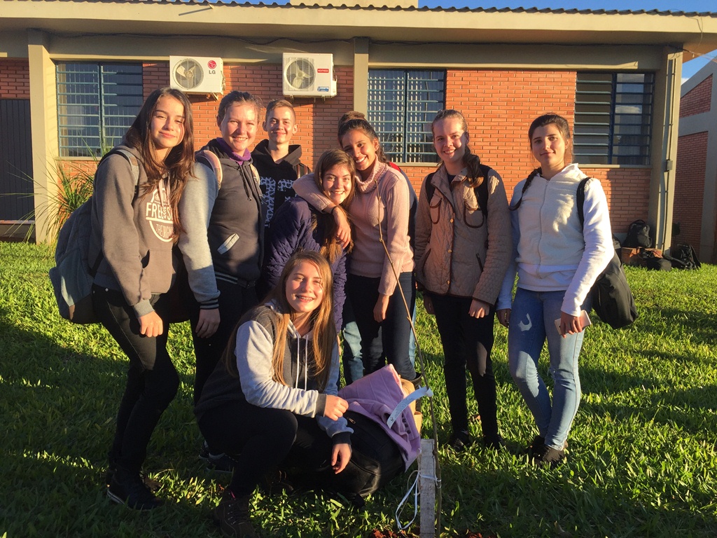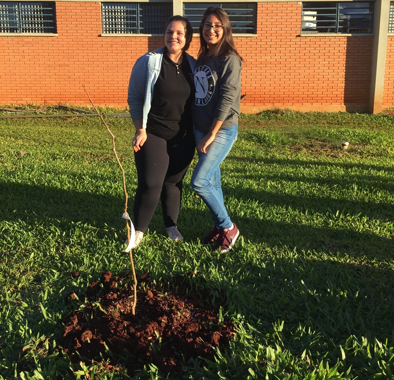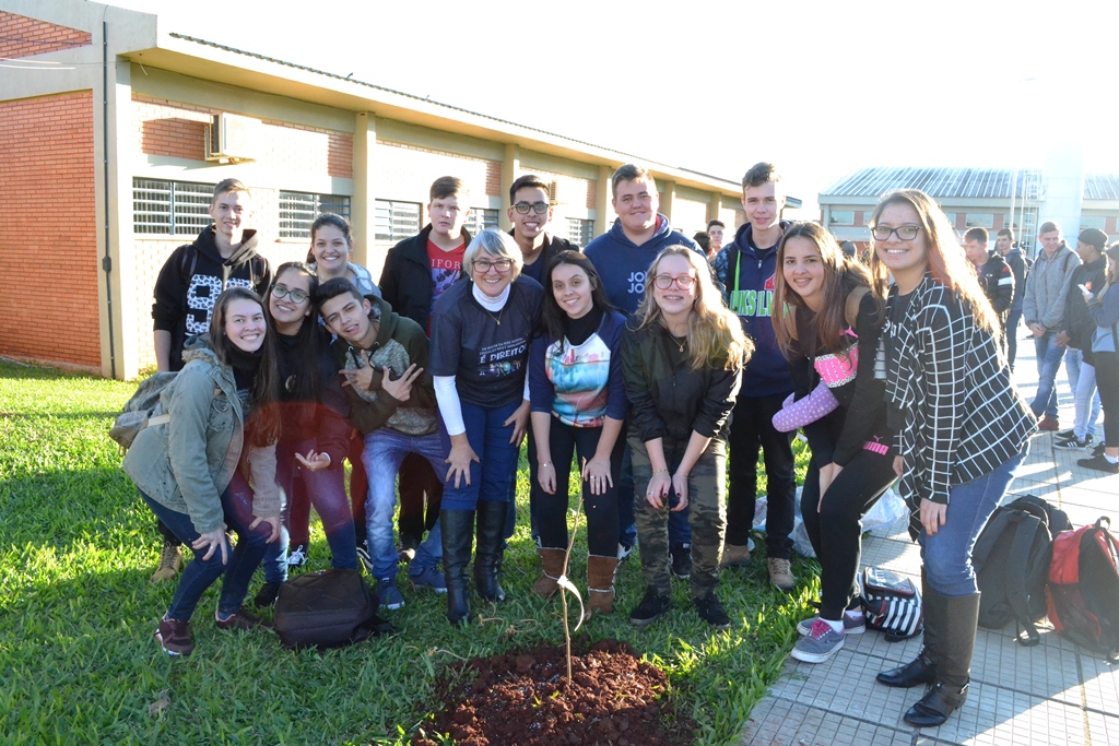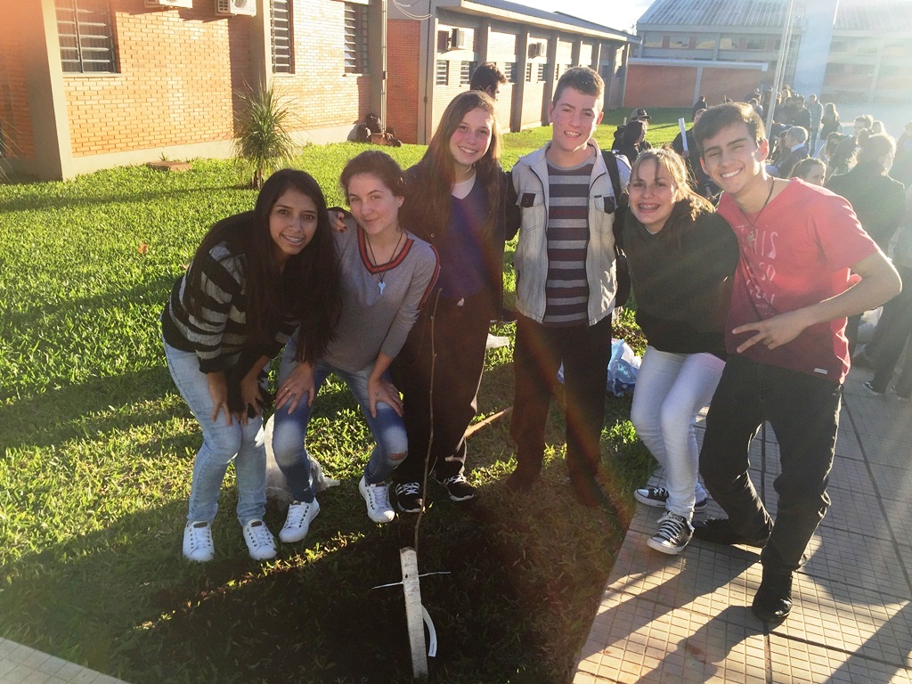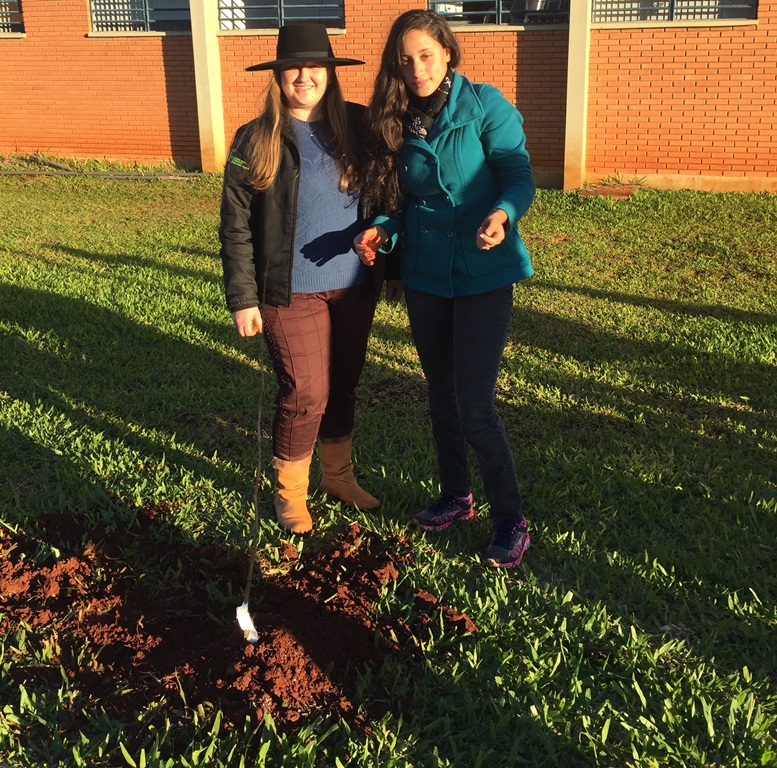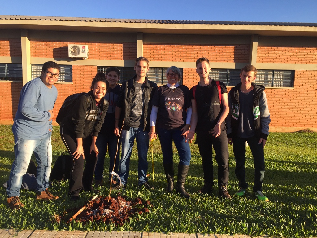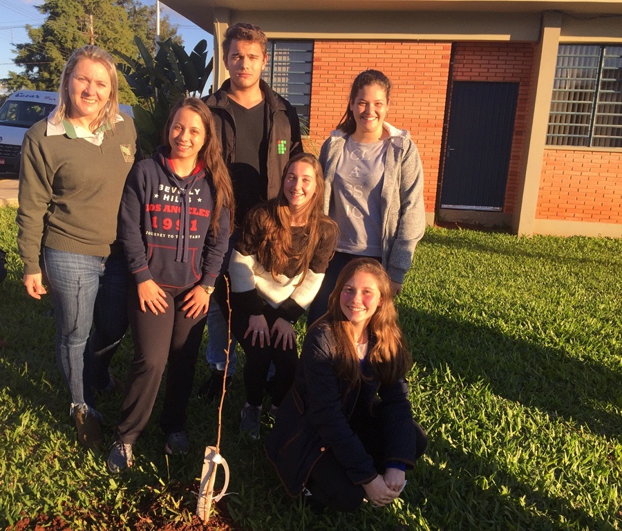 Após a palestra, os estudantes, acompanhados pelos professores Clarinês Hames, Franciele de Oliveira e Ricardo Paraginski, realizaram no gramado que fica ao lado do estacionamento da biblioteca, o plantio de 11 mudas de plátano, doadas pelo estudante do 1º ano, Giovani Weber, filho de Décio Weber, proprietário dos Viveiros Weber, do município de Crissiumal-RS.