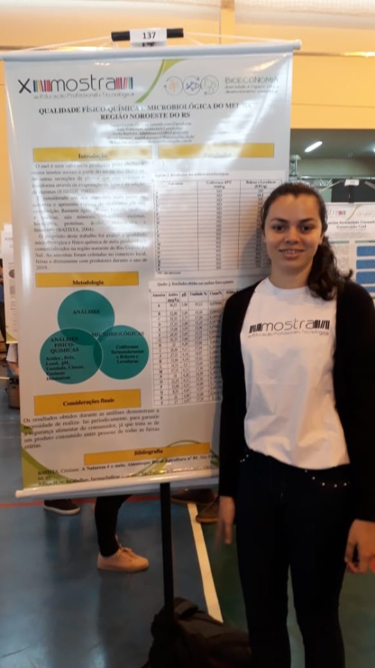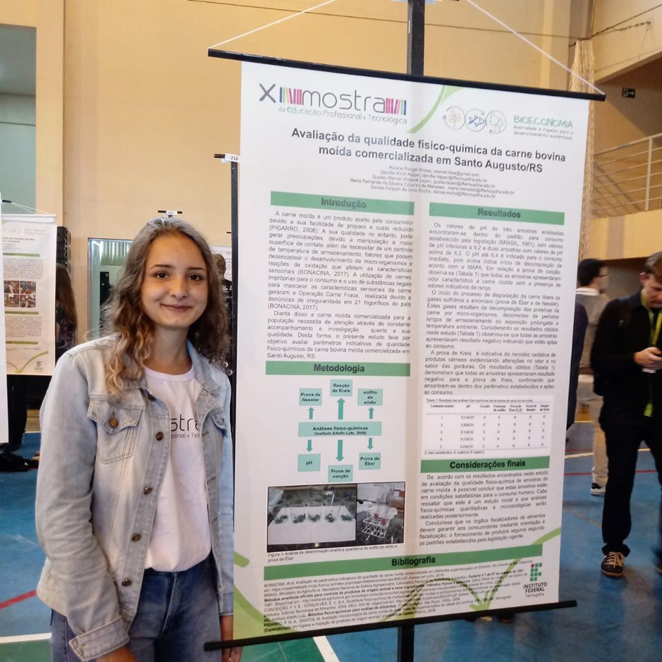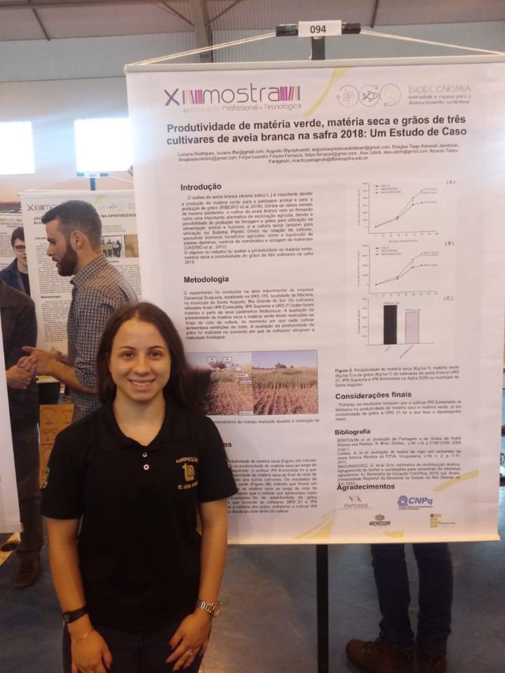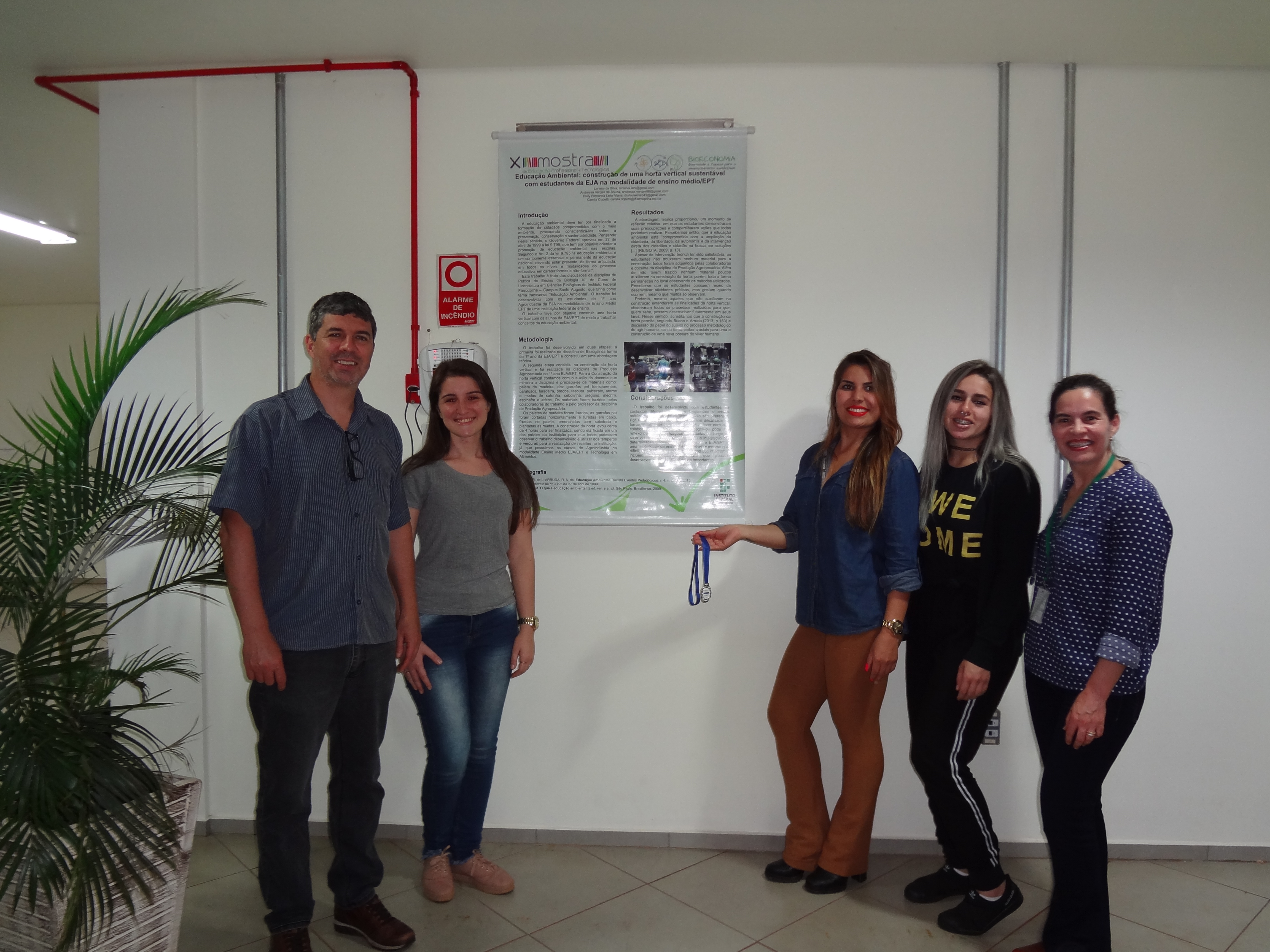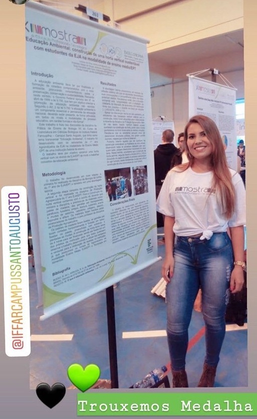 Na modalidade Ensino, a estudante do 8º semestre de Licenciatura em Ciências Biológicas, Larissa da Silva, obteve o 2º lugar, com o trabalho “Educação Ambiental: construção de uma horta vertical sustentável com estudantes da EJA na modalidade de ensino médio/EPT - Campus Santo Augusto”. O trabalho foi produzido juntamente com as colegas Andressa Vargas de Souza e Diuly Fernanda Leite Vianna. O projeto foi desenvolvido com a turma do 1º ano do Curso Técnico em Agroindústria, integrado ao ensino médio na modalidade EJA-EPT, dentro da disciplina de Prática de Ensino Curricular - PEC VII, ministrada pela professora Camila Copetti, que tinha como tema transversal a “Educação Ambiental”, e também da disciplina de Ecologia II, ministrada pela professora Eleonir Diniz, com o apoio do professor Tarcísio Samborski, que ministra a disciplina de Práticas Agrícolas na Agroindústria.