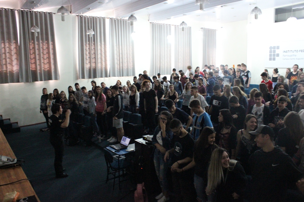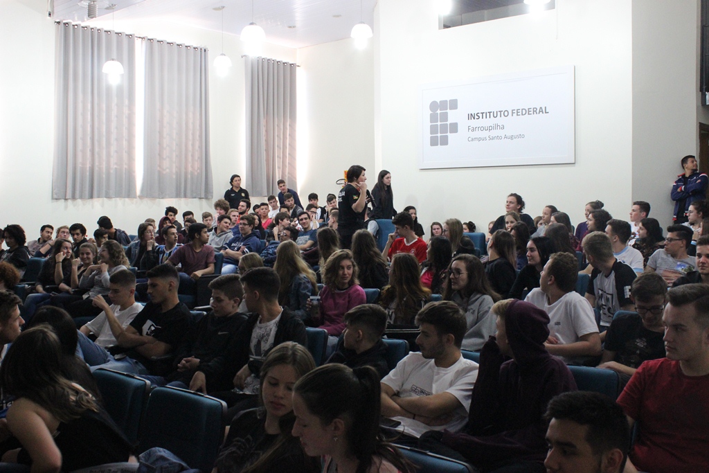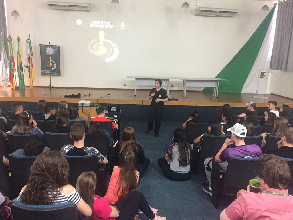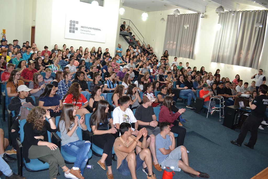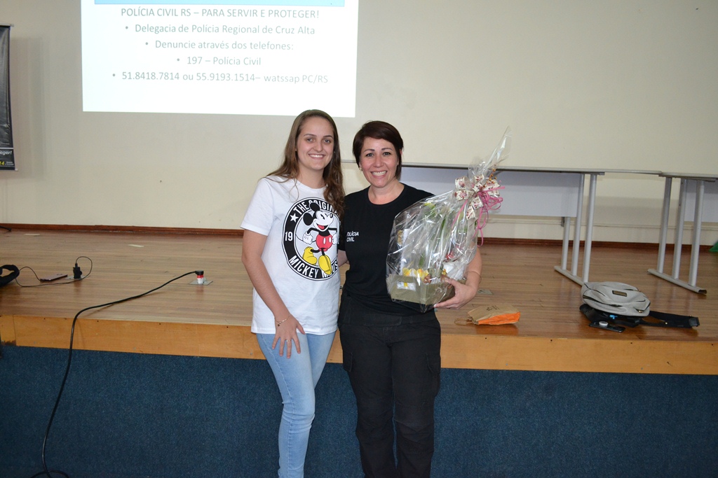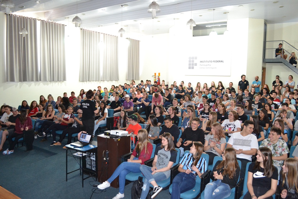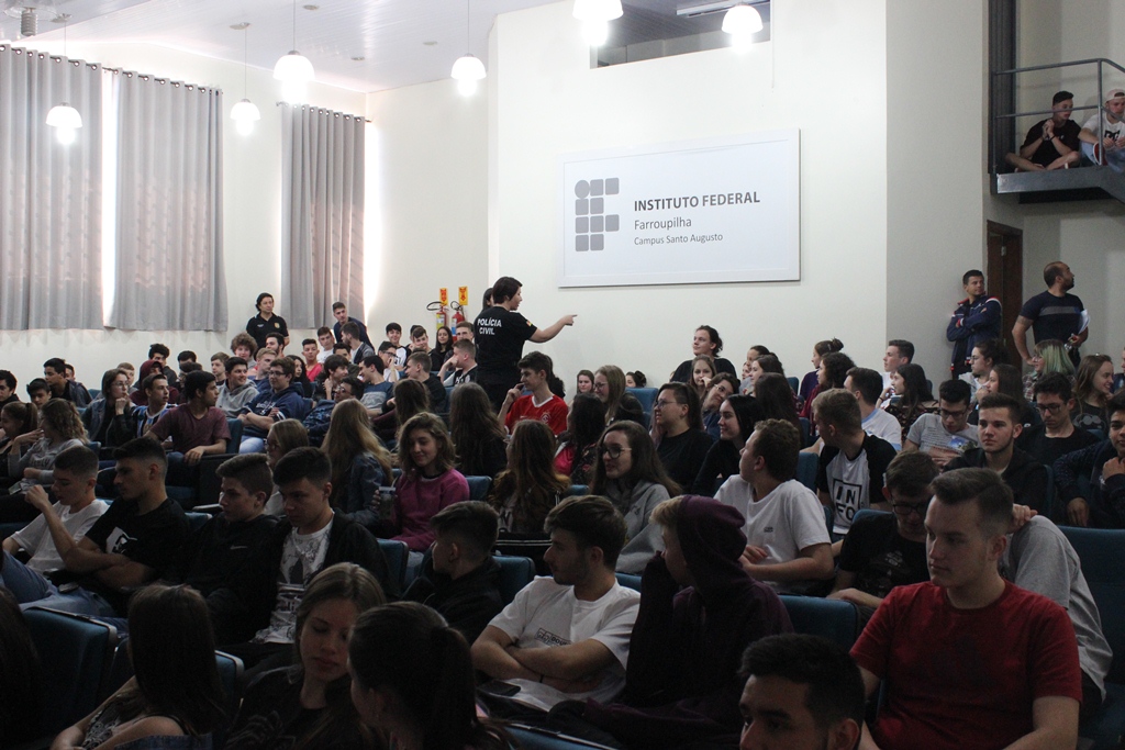 Os estudantes dos cursos técnicos integrados ao ensino médio do IFFar – Campus Santo Augusto receberam nesta quinta-feira, dia 24, a Delegada Caroline Bamberg Machado, responsável pela Delegacia Regional de Cruz Alta, para uma atividade alusiva ao Dia Nacional da Segurança e Saúde nas Escolas (10 de outubro), organizada pela Direção de Ensino, através dos setores de Assessoria Pedagógica e da Coordenação de Assistência Estudantil.