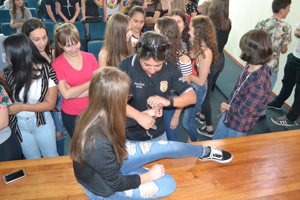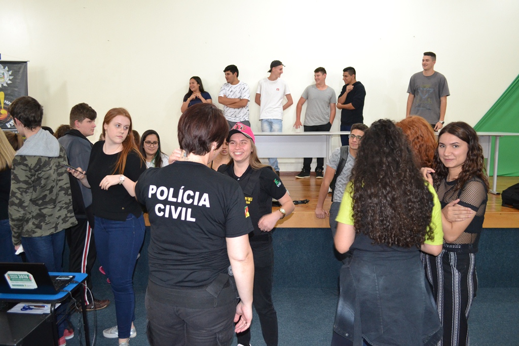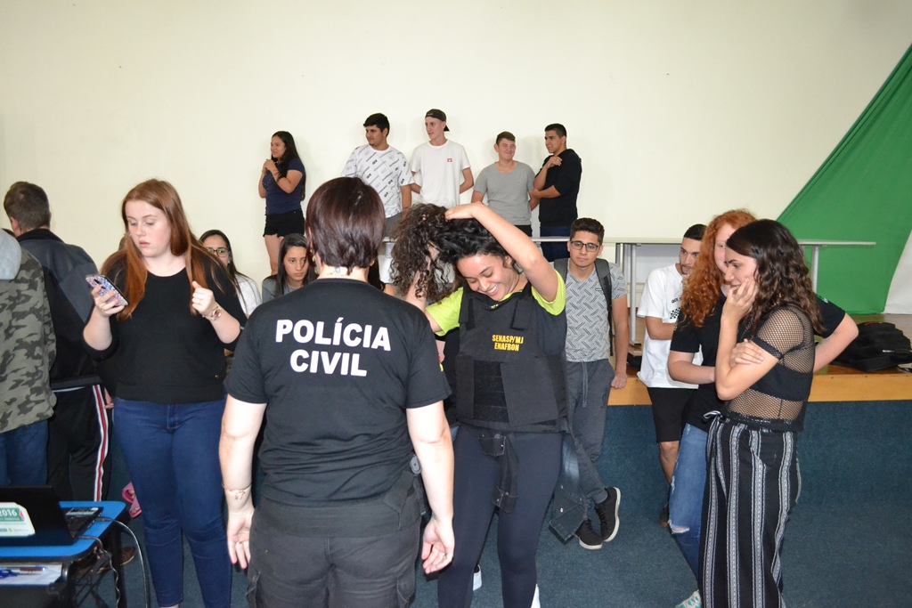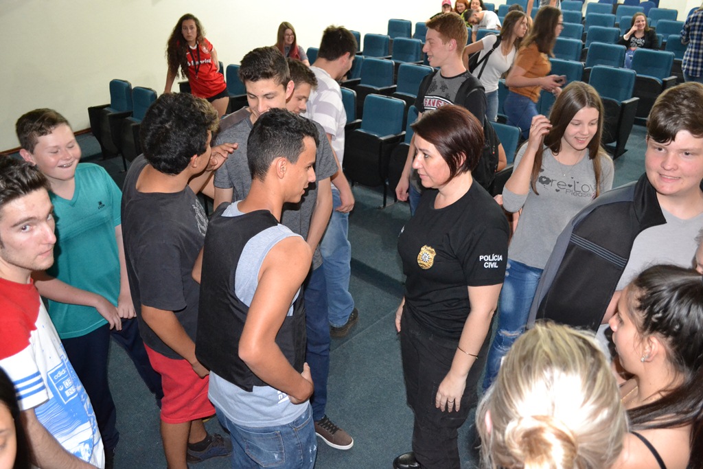 A conversa da Delegada com os estudantes foi bem informativa e descontraída, os quais interagiram bastante, tanto nos momentos de brincadeira, quanto nos assuntos mais sérios, como bullying, drogas e suicídio. No final os estudantes fizeram fila para provar um colete à prova de balas e também puderam brincar de ser algemados pela polícia. Caroline prometeu que em outra oportunidade virá até o campus para uma palestra para os estudantes dos cursos superiores.