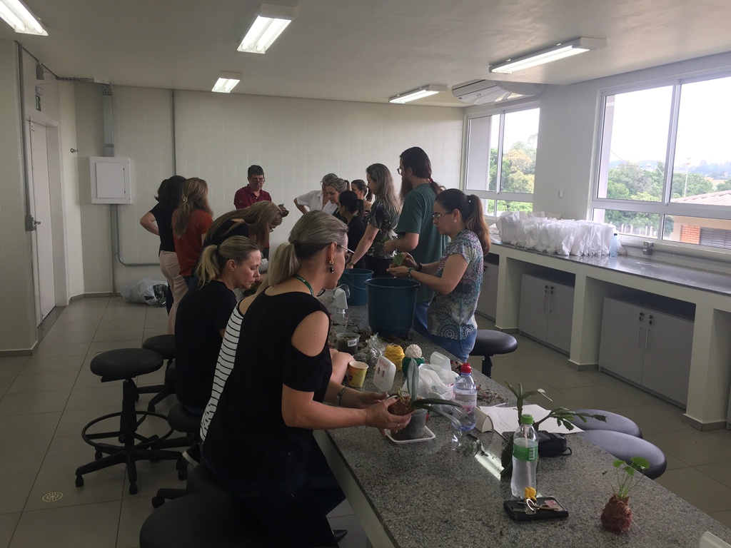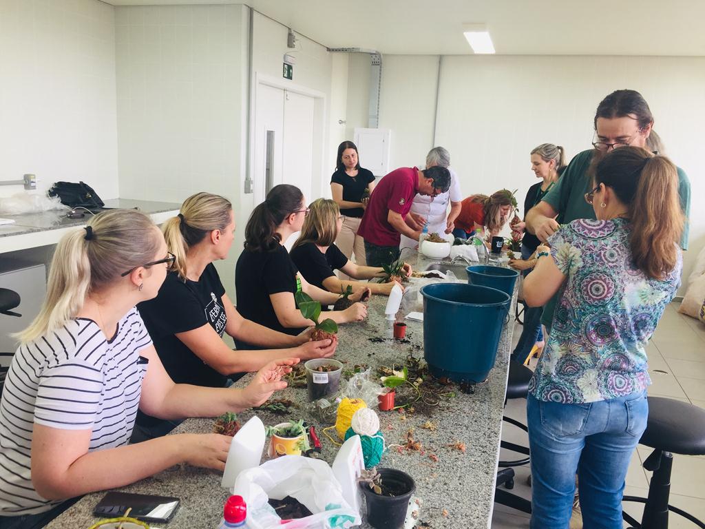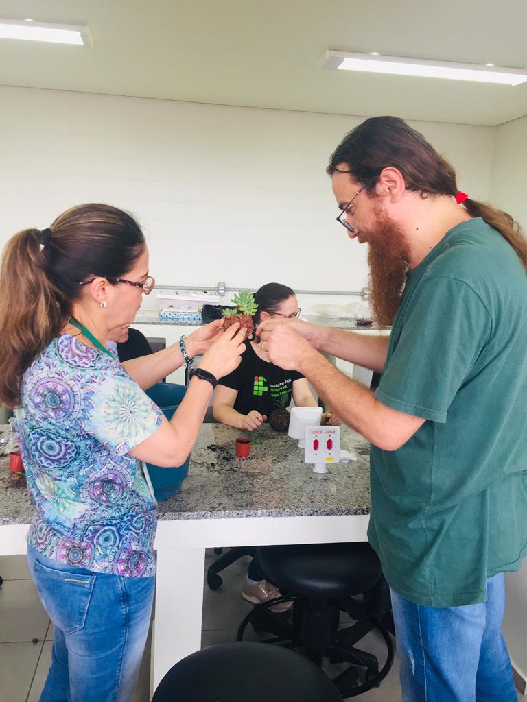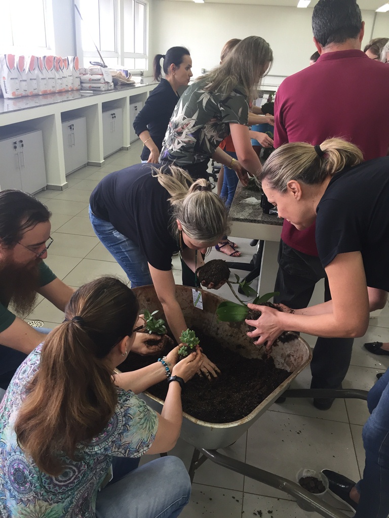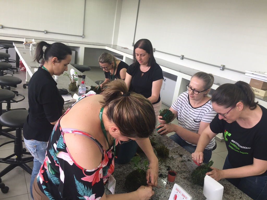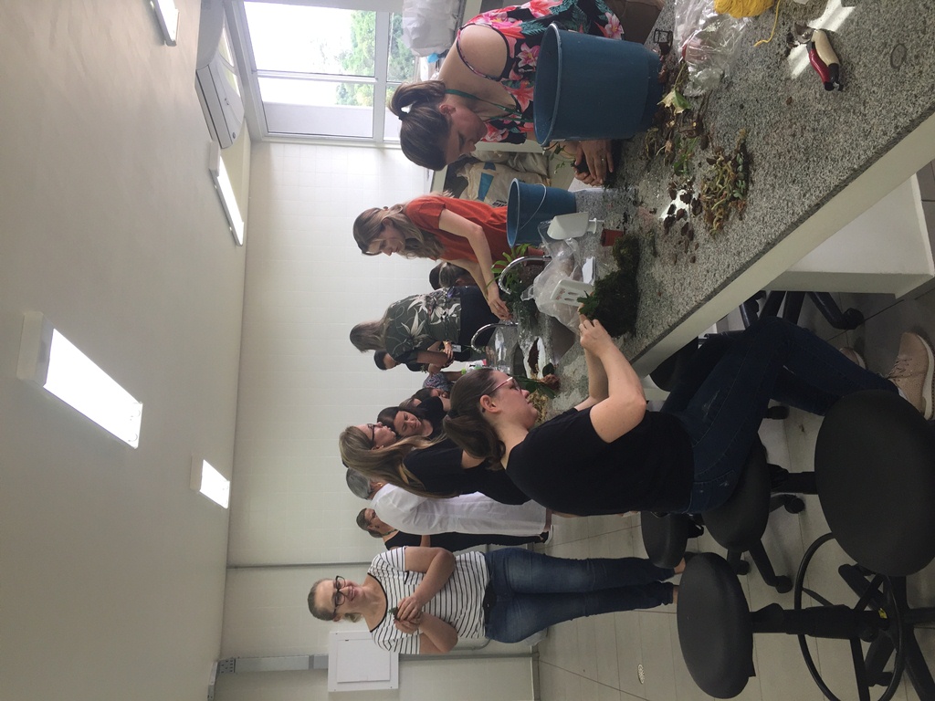 Encerrando as atividades da Quinzena, no dia 30 de outubro, das 13h15 às 14h45, aconteceu a oficina de Kokedamas, ministrada pelo professor Tarcísio Samborski, onde foram produzidos arranjos com plantas de diferentes espécies. Após a oficina, os servidores participaram da reunião geral e ao final foram convidados para uma pequena confraternização pela passagem do Dia do Servidor.
