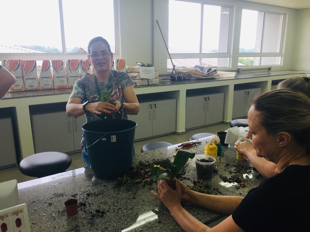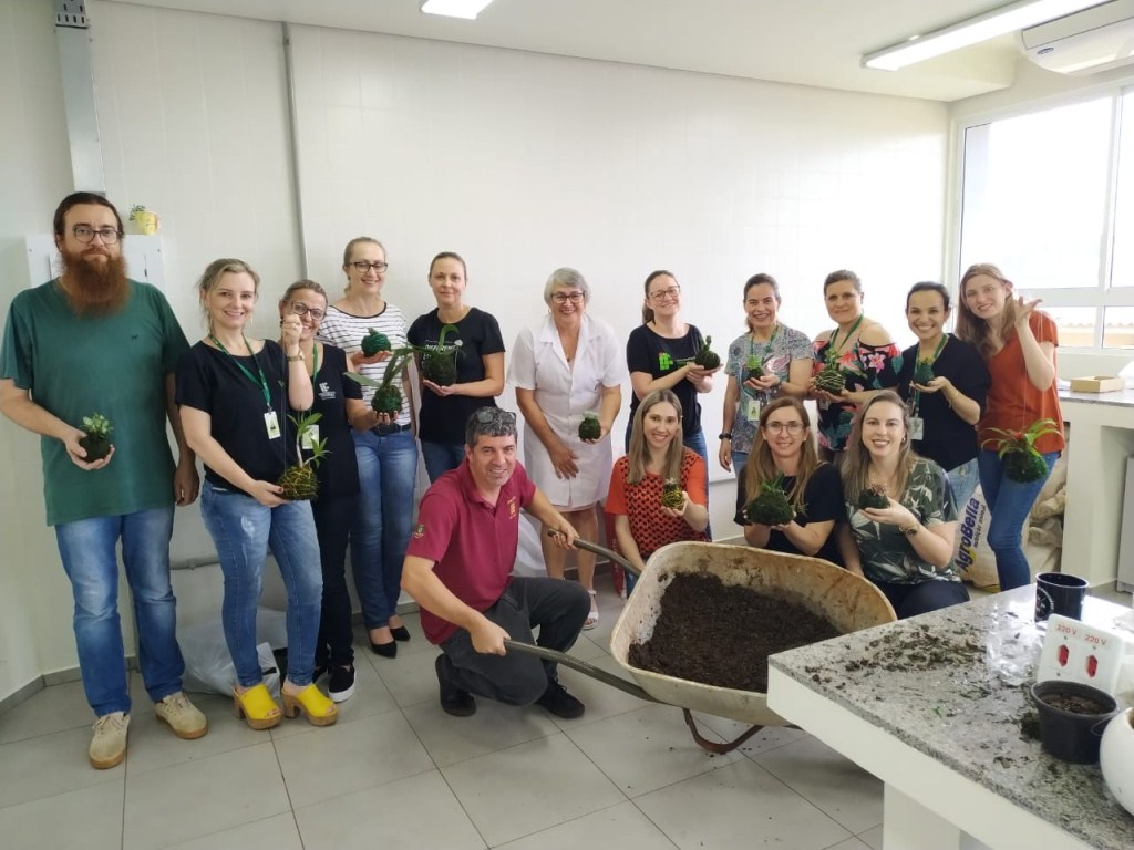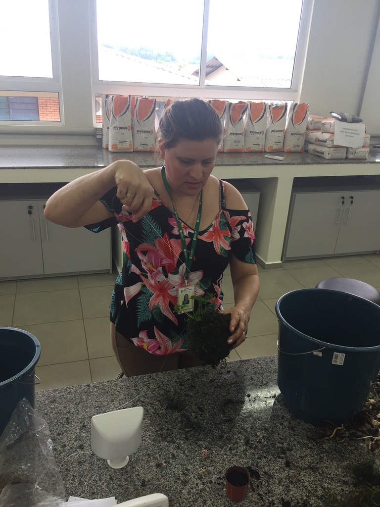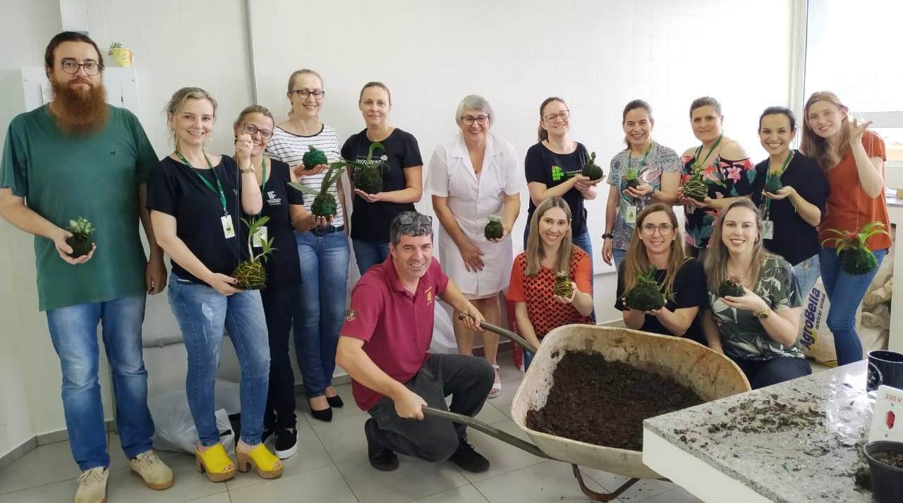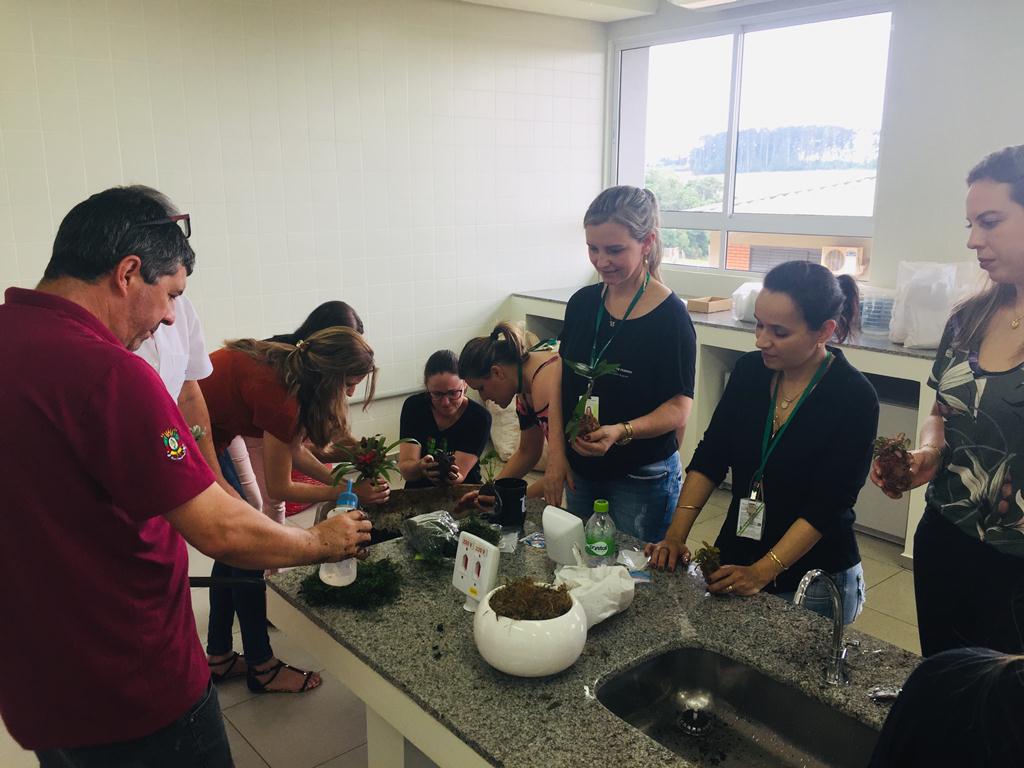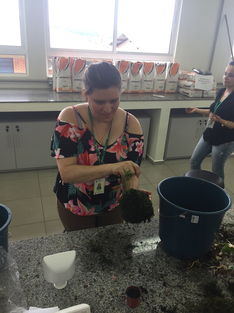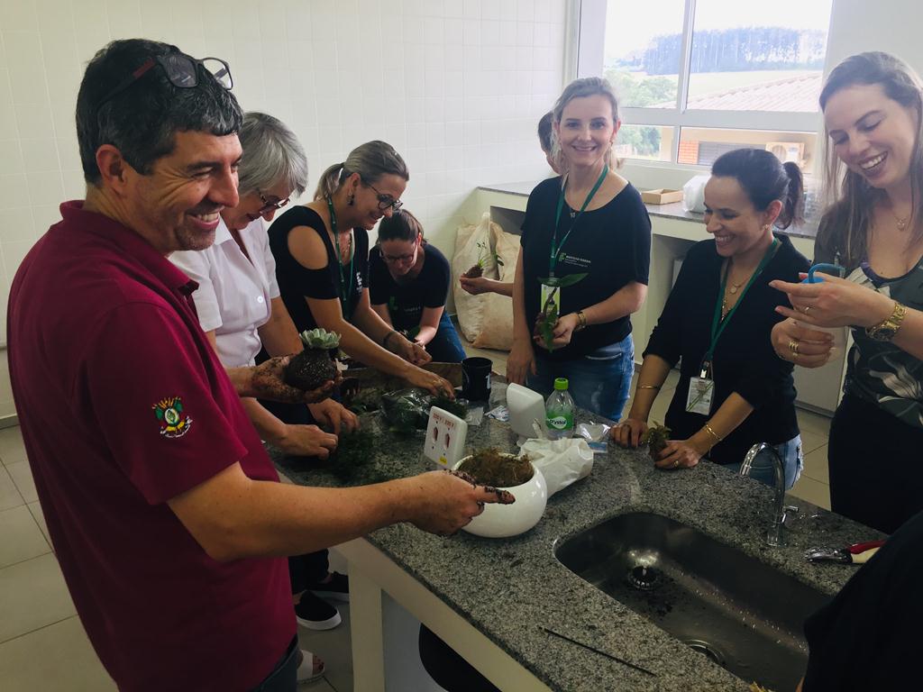 Encerrando as atividades da Quinzena, no dia 30 de outubro, das 13h15 às 14h45, aconteceu a oficina de Kokedamas, ministrada pelo professor Tarcísio Samborski, onde foram produzidos arranjos com plantas de diferentes espécies. Após a oficina, os servidores participaram da reunião geral e ao final foram convidados para uma pequena confraternização pela passagem do Dia do Servidor.