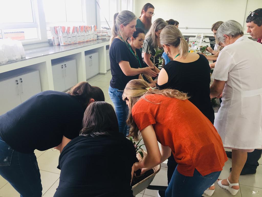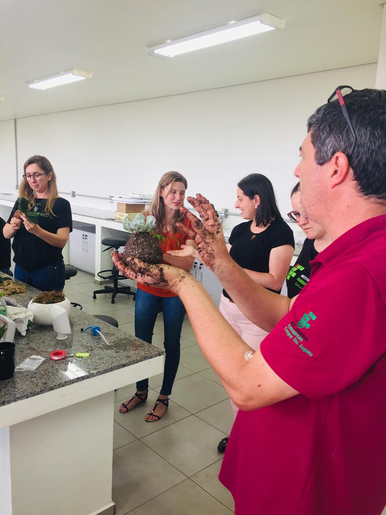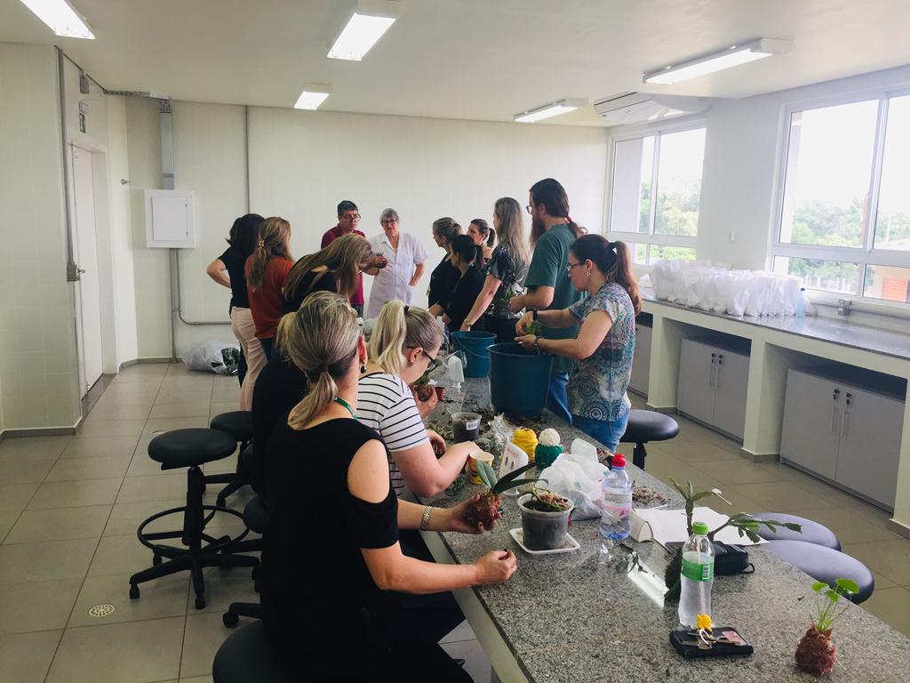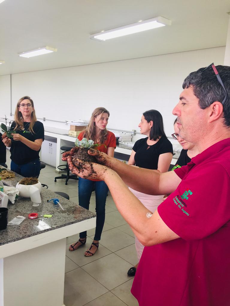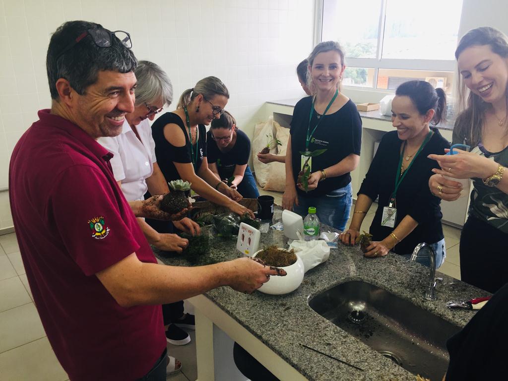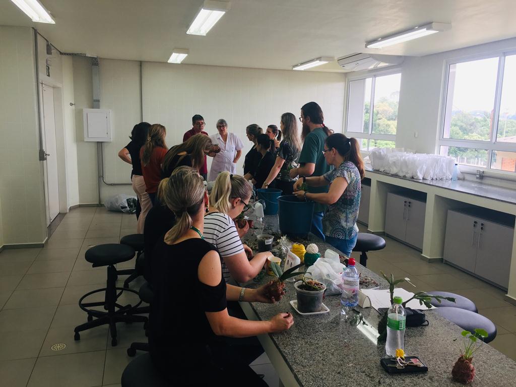 Encerrando as atividades da Quinzena, no dia 30 de outubro, das 13h15 às 14h45, aconteceu a oficina de Kokedamas, ministrada pelo professor Tarcísio Samborski, onde foram produzidos arranjos com plantas de diferentes espécies. Após a oficina, os servidores participaram da reunião geral e ao final foram convidados para uma pequena confraternização pela passagem do Dia do Servidor.