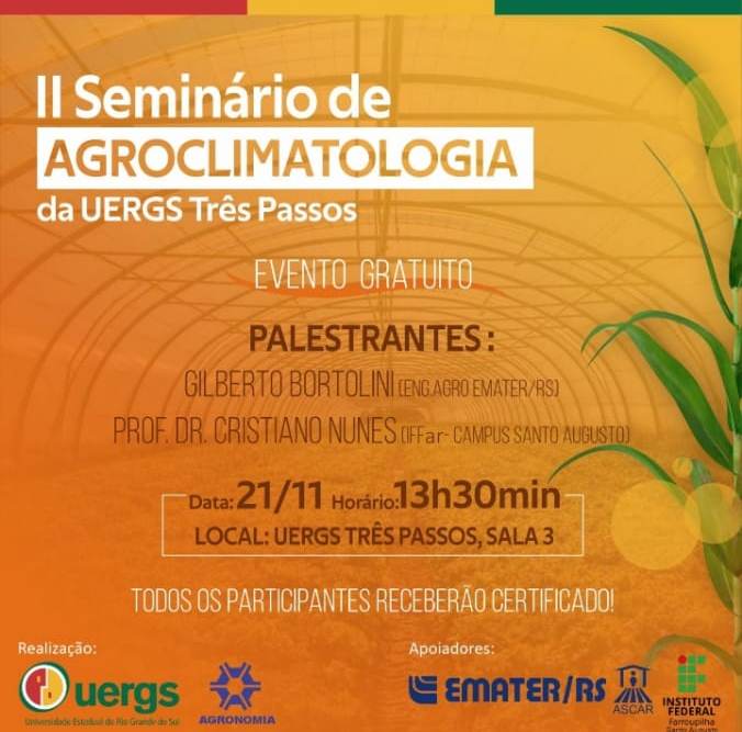 O Seminário de Agroclimatologia é um evento promovido pela disciplina de Extensão Rural do curso de Bacharelado em Agronomia da UERGS, com o apoio da Emater-RS/Ascar e do IFFar – Campus Santo Augusto.