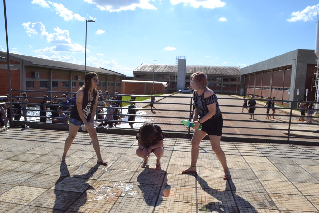 A brincadeira teve como espaço delimitado o gramado em frente ao estacionamento da Biblioteca. Além das bexiguinhas com água, garrafas, baldes e mangueiras foram utilizados para molhar aqueles que desejavam participar da festa.