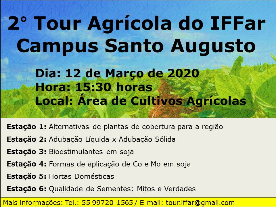 Foi realizado na tarde de ontem, 12 de março, na área de cultivos agrícolas do IFFar – Campus Santo, a segunda edição do Tour Agrícola, com o objetivo de divulgar as pesquisas e projetos de extensão desenvolvidos na instituição para os estudantes do Bacharelado em Agronomia e do Curso Técnico em Agropecuária Integrado ao ensino médio.