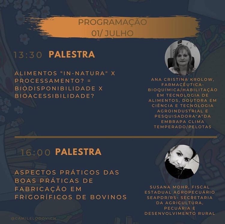 No dia 1º de julho aconteceram as lives, “Alimentos in natura x processamento = biodisponibilidade x bioacessibilidade”, com a pesquisadora da Embrapa Clima Temperado de Pelotas, Drª Ana Cristina Krolow, e “Aspectos práticos das boas práticas de fabricação em frigoríficos de bovinos”, com fiscal estadual agropecuária, Susana Mohr.