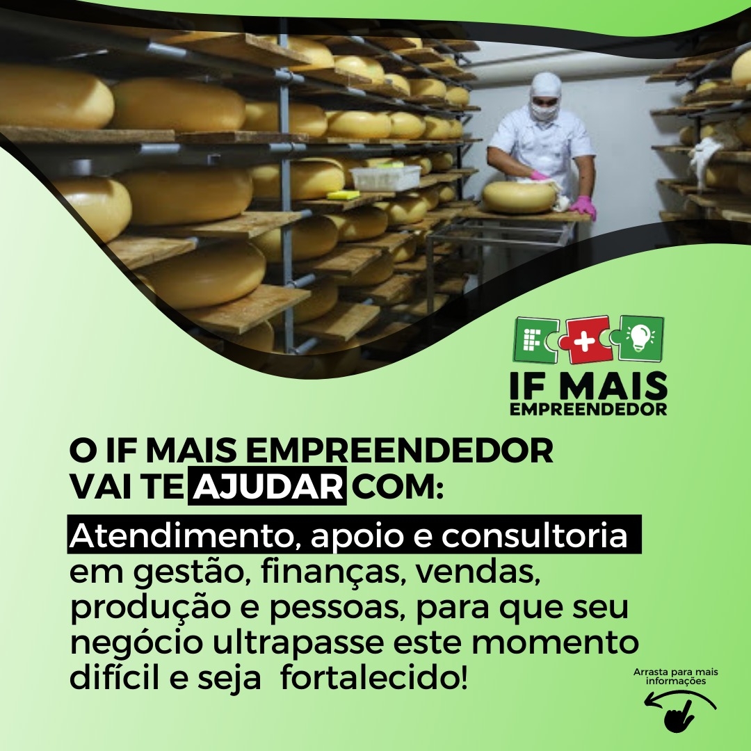 Saiba mais sobre o Programa IF Mais Empreendedor Nacional: é uma iniciativa do Instituto Federal do Sul de Minas Gerais (IFSULDEMINAS) e a Secretaria de Educação Profissional e Tecnológica do Ministério da Educação (SETEC), por meio da Fundação de Apoio ao Desenvolvimento da Extensão, Pesquisa, Ensino Profissionalizante e Tecnológico (FADEMA). É voltado à execução de projetos de extensão tecnológica para o atendimento, apoio e orientação a Micro e Pequenos Empreendedores e Empreendedores Individuais, desde que possuam cadastro nacional de pessoa jurídica (CNPJ), particularmente por meio de ações de remodelagem de negócios que foram afetados negativamente pela Pandemia da Covid-19.