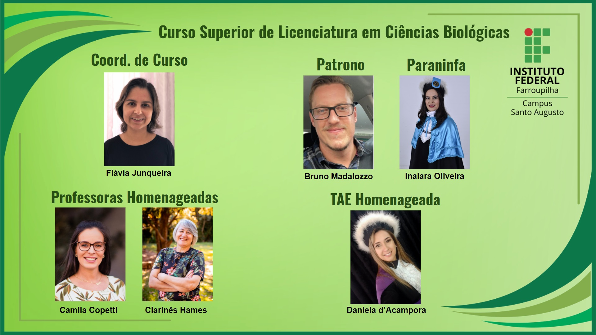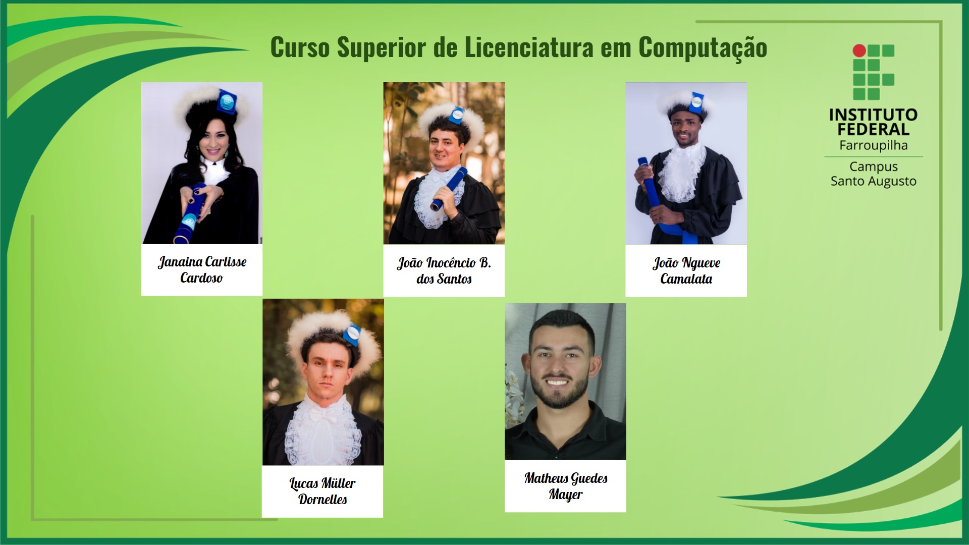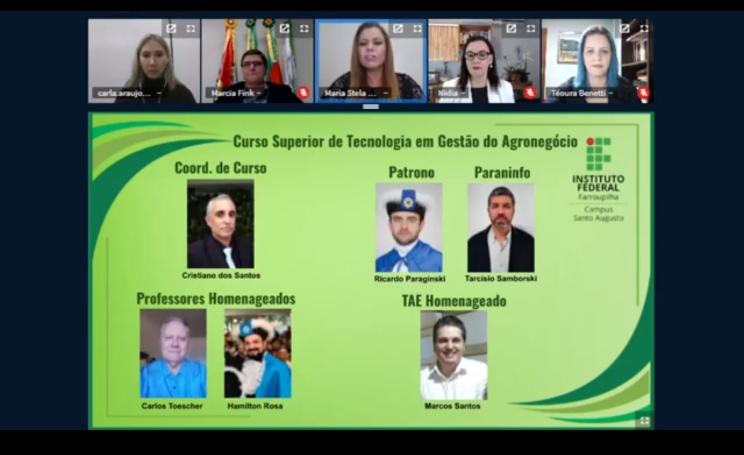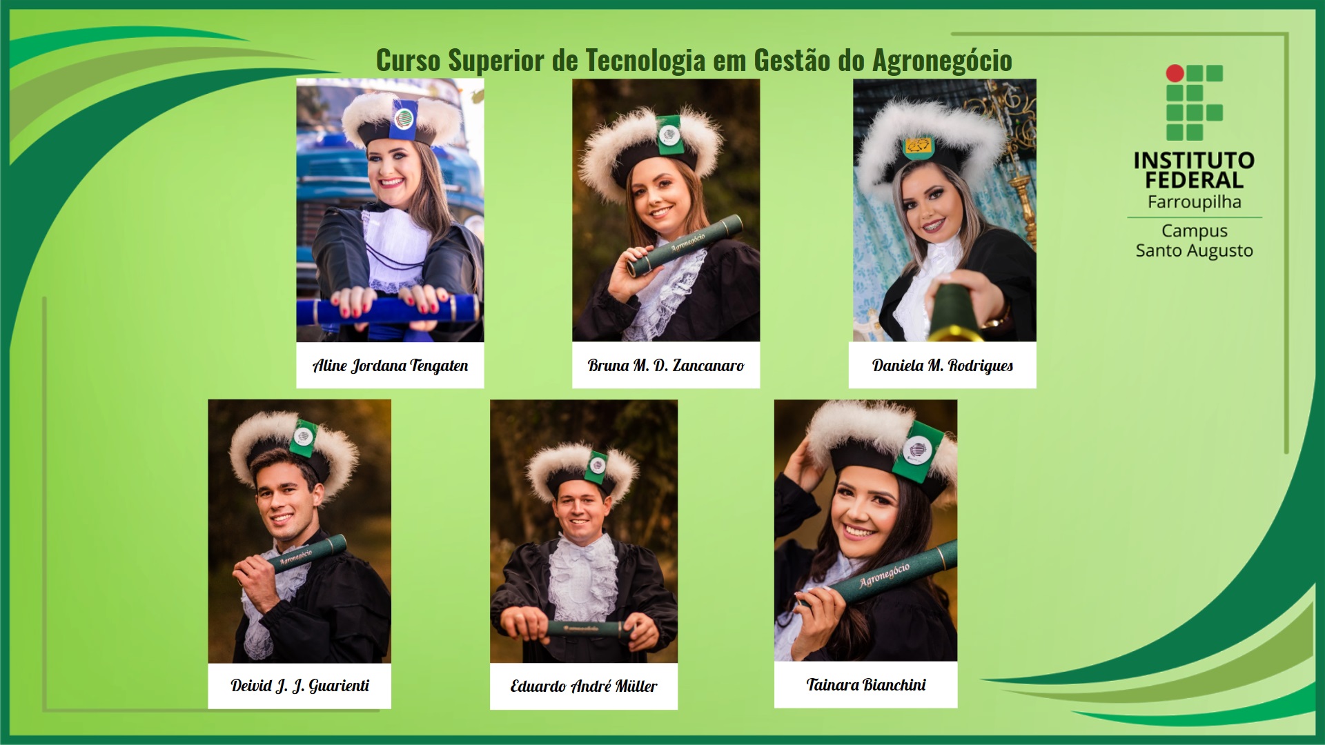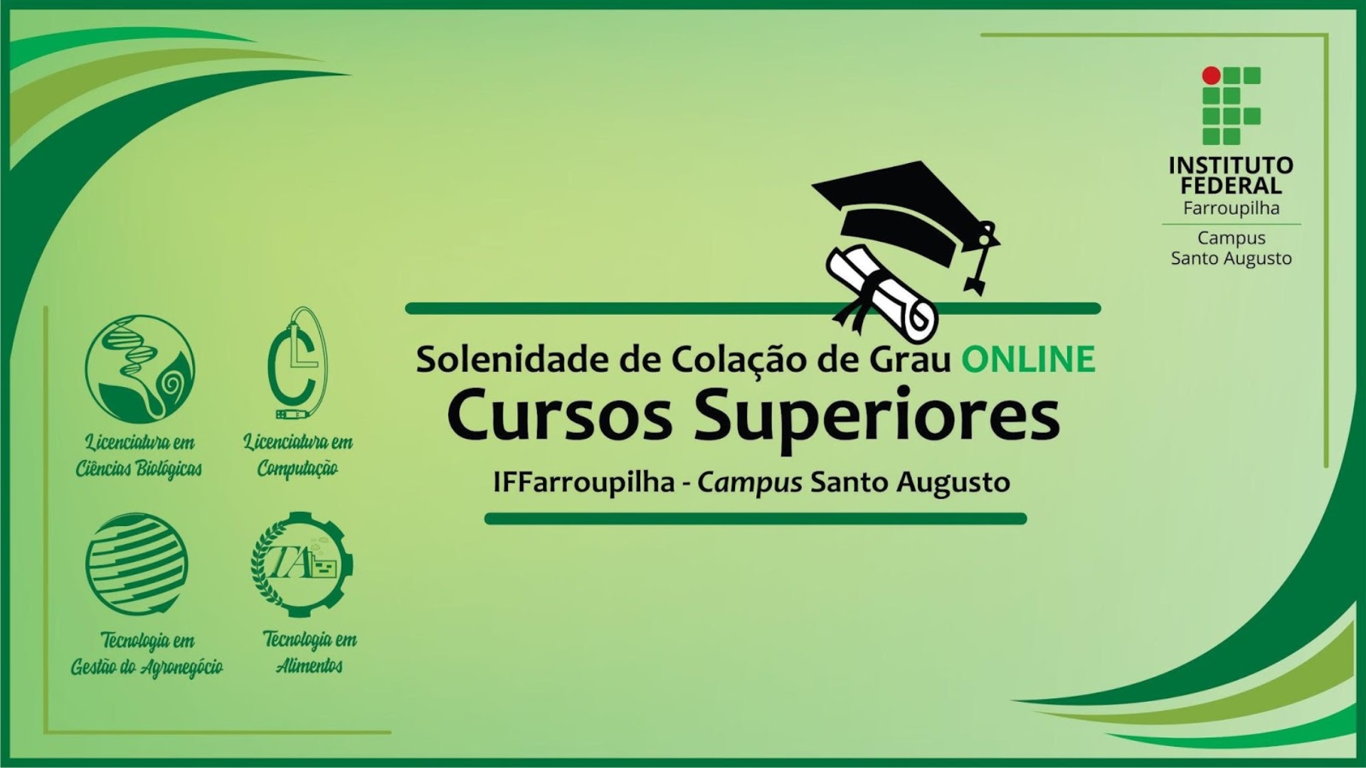 O IFFar - Campus Santo Augusto realizou na noite de ontem, às 19h, a solenidade de Colação de Grau dos cursos superiores de Licenciatura em Ciências Biológicas, Licenciatura em Computação, Tecnologia em Alimentos e Tecnologia em Gestão do Agronegócio. A solenidade foi online, devido a pandemia de COVID 19, sendo transmitida pelo canal do IFFar - Campus Santo Augusto no You Tube ( https://youtu.be/W1naqNMXST8) .