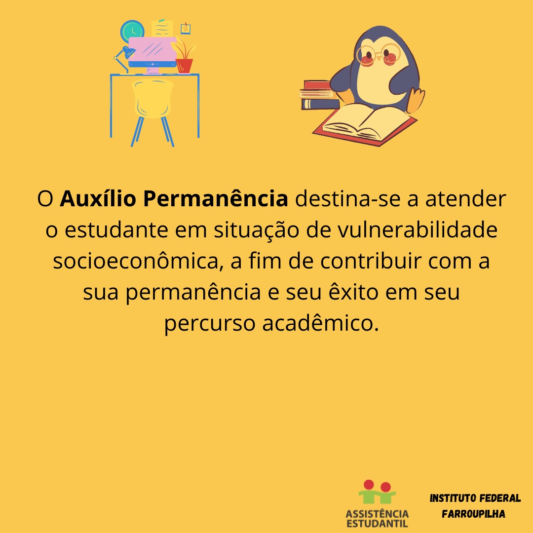 Os auxílios financeiros da Assistência Estudantil, previstos no Regulamento de Concessão de Auxílios do IFFar, tem como finalidade contribuir para a permanência e êxito dos estudantes regularmente matriculados em cursos presenciais do IFFar que vivenciam situação de vulnerabilidade social. O Auxílio Permanência destina-se a atender o estudante em situação de vulnerabilidade socioeconômica, a fim de contribuir com a sua permanência e seu êxito em seu percurso acadêmico.