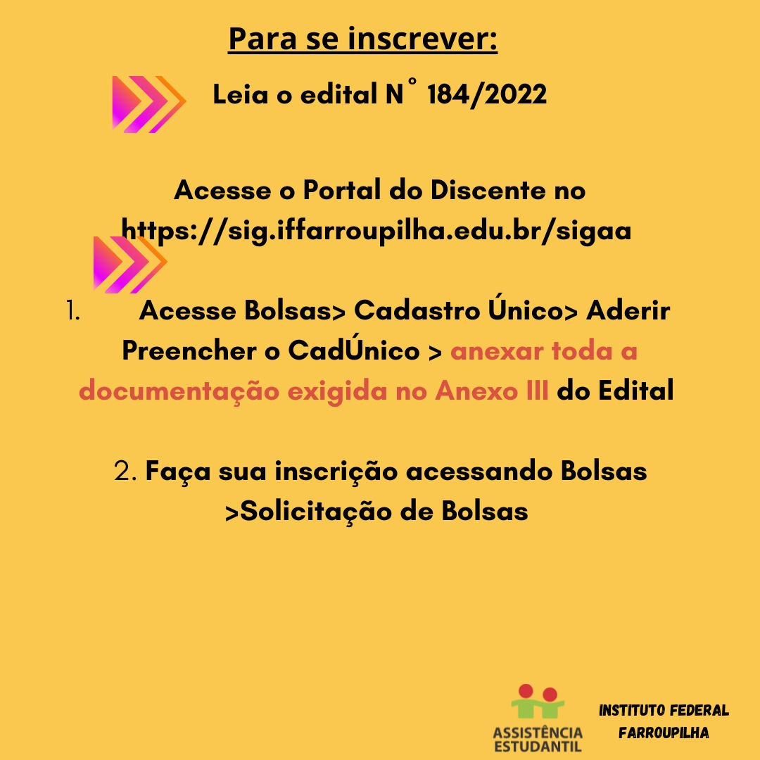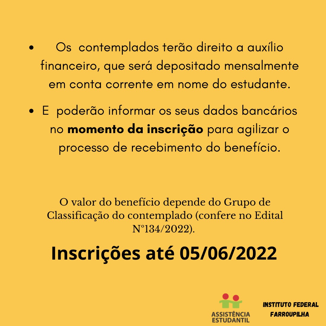 Os estudantes que ficaram em fila de espera/suplentes no processo 2022/1 não precisam se inscrever novamente, pois serão reclassificados juntos com os novos contemplados deste edital complementar. Mais informações no edital nº 184.2022.