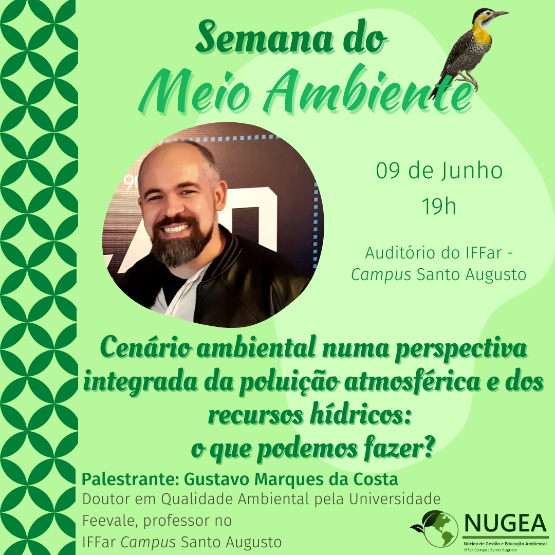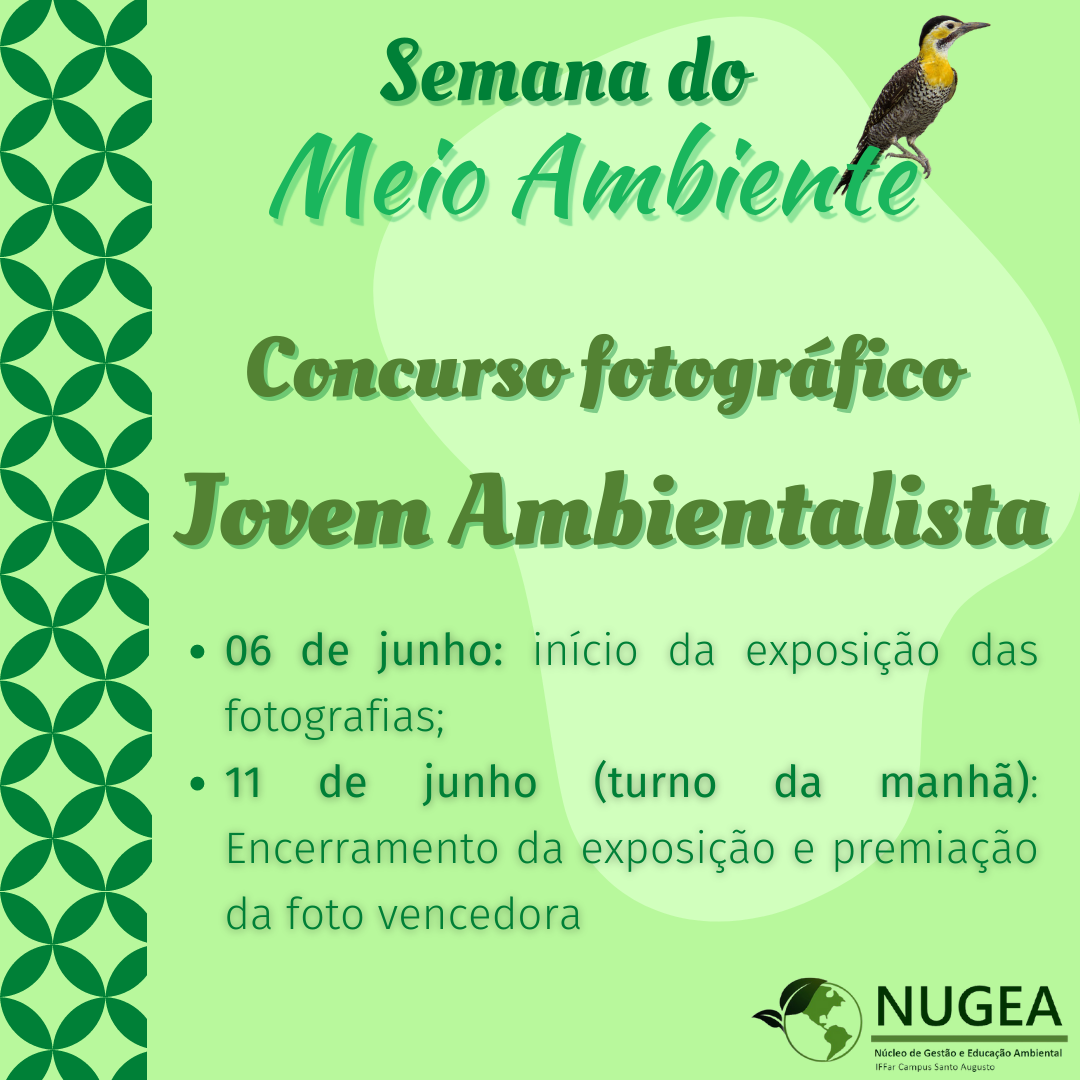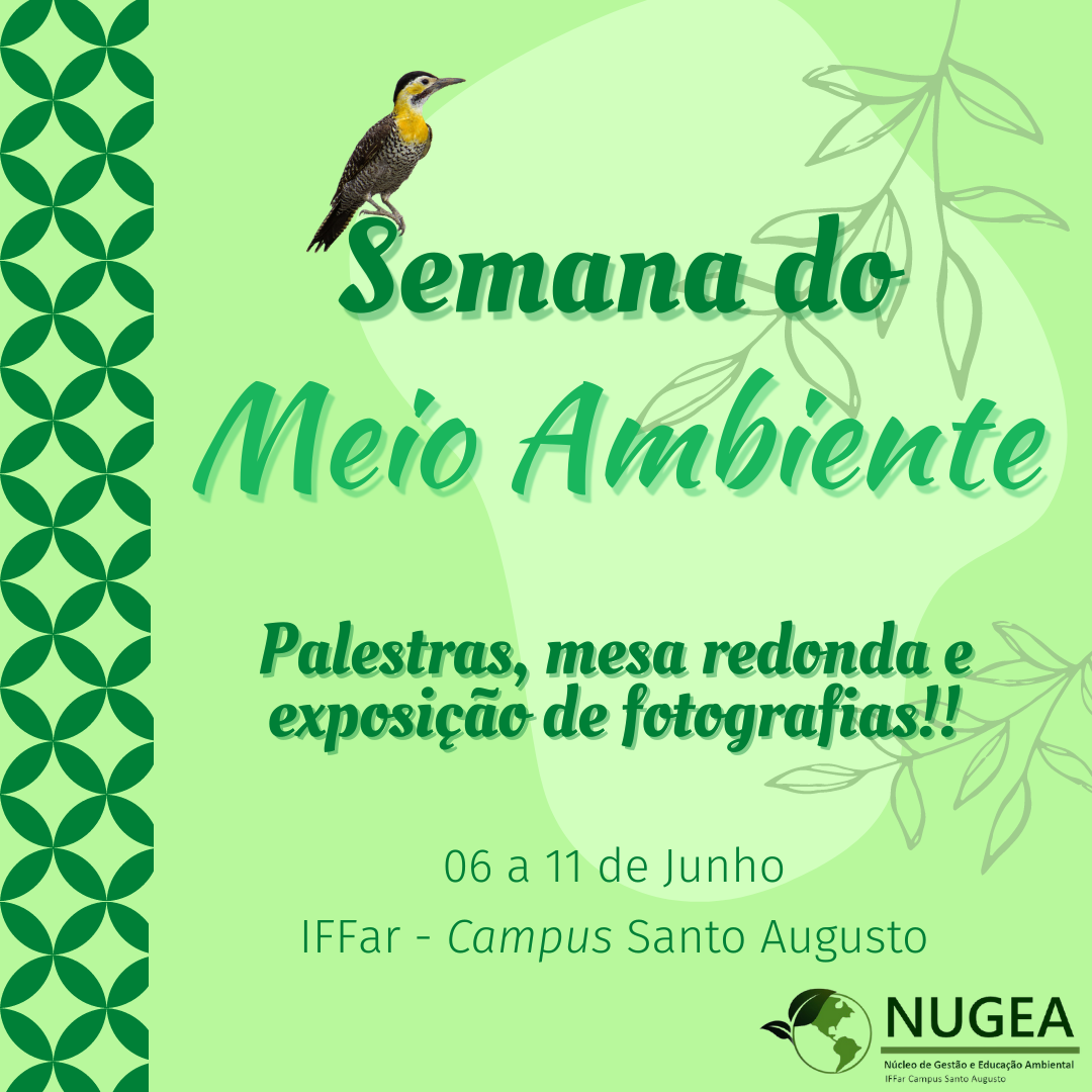 O Núcleo de Gestão e Educação Ambiental – NUGEA do IFFar – Campus Santo Augusto promove, de 06 a 11 de junho, a Semana do Meio Ambiente, em comemoração ao Dia Mundial do Meio Ambiente comemorado no dia 05 de junho.