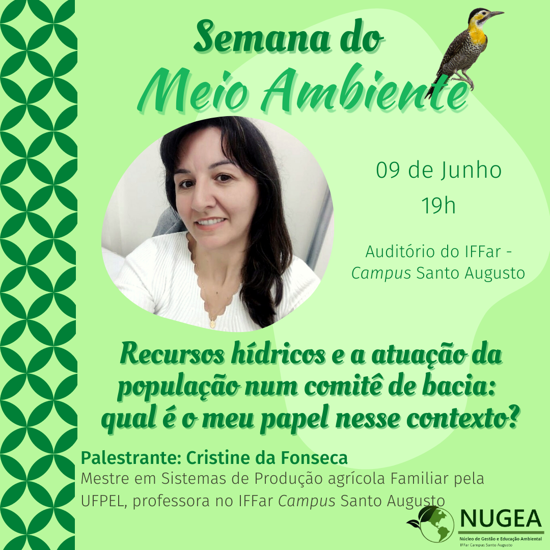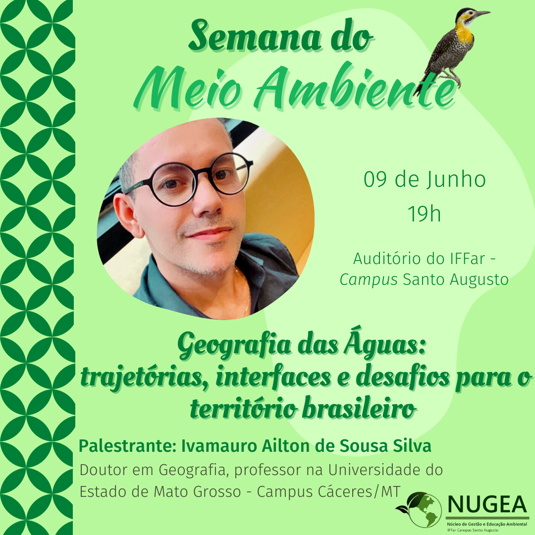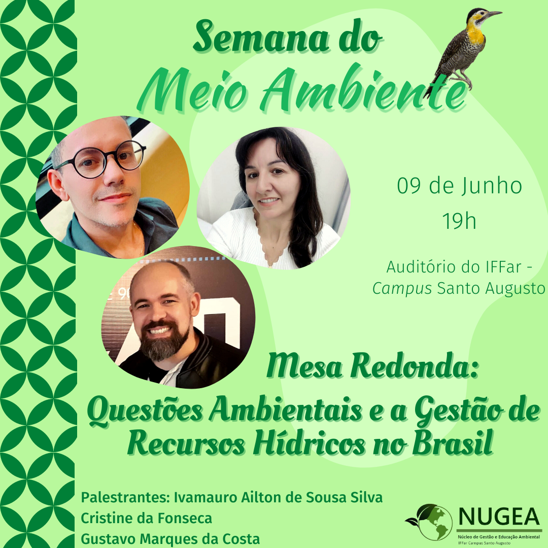 Na quinta-feira, 09 de junho, às 19h, acontece no auditório da instituição a mesa redonda, sobre “Questões ambientais e a Gestão de recursos hídricos no Brasil”, com a participação dos professores do IFFar – Campus Santo Augusto, Ma. Cristine da Fonseca e Dr. Gustavo Marques da Costa e do professor da Universidade do Estado do Mato Grosso – Campus Cáceres, Dr. Ivamauro Ailton de Souza e Silva.