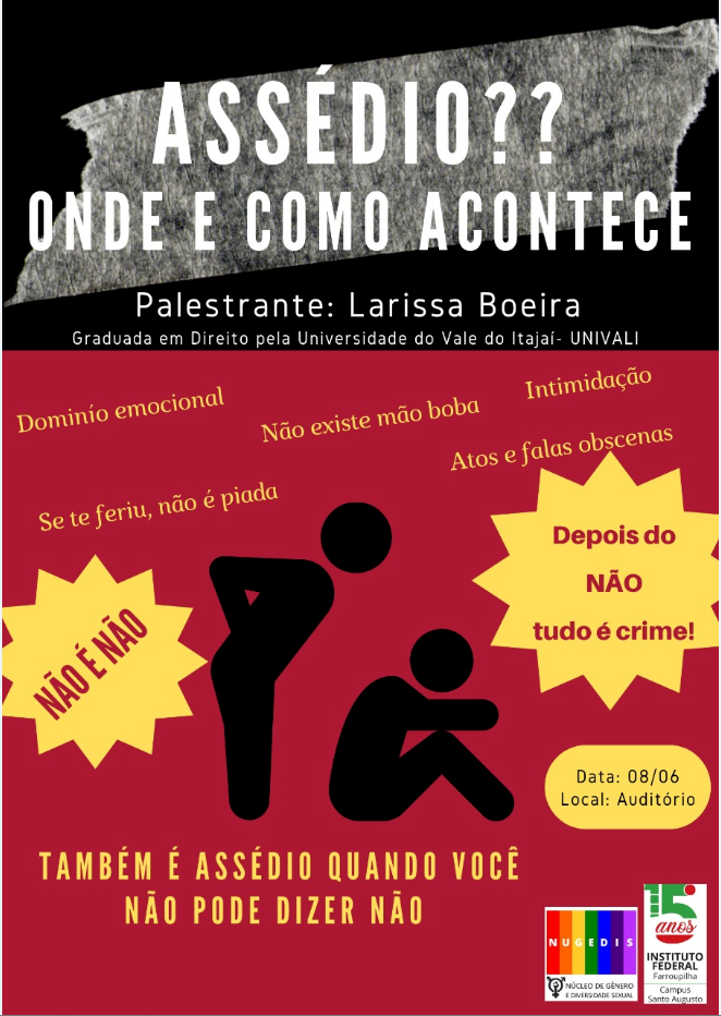 O Núcleo de Gênero e Diversidade Sexual do IFFar – Campus Santo Augusto promoveu na manhã de quarta-feira, 08 de junho, uma palestra com o tema “Assédio? Onde e como acontece”, ministrada pela advogada Larissa Boeira, voltada aos estudantes dos cursos técnicos integrados ao ensino médio. A atividade foi divida em dois momentos, nos dias 08 e 15 de junho, de forma que todos os estudantes dos cursos diurnos pudessem participar.