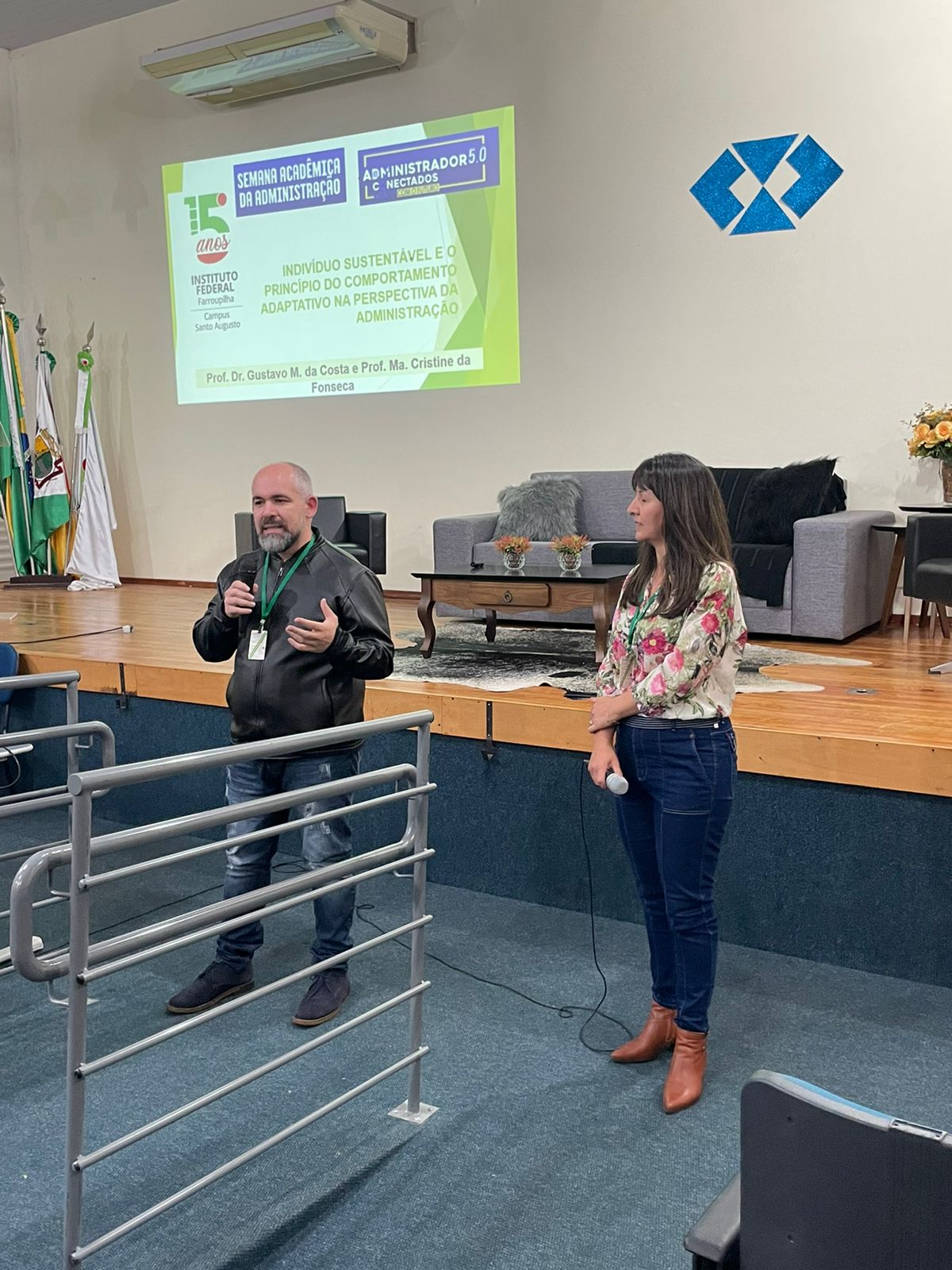 Na quinta-feira à noite, dia 08, os professores, Dr. Gustavo Marques da Costa e Ma. Cristine Fonseca, ministraram palestra com o tema “Indivíduo Sustentável e o Princípio do Comportamento Adaptativo na Perspectiva da Administração”.