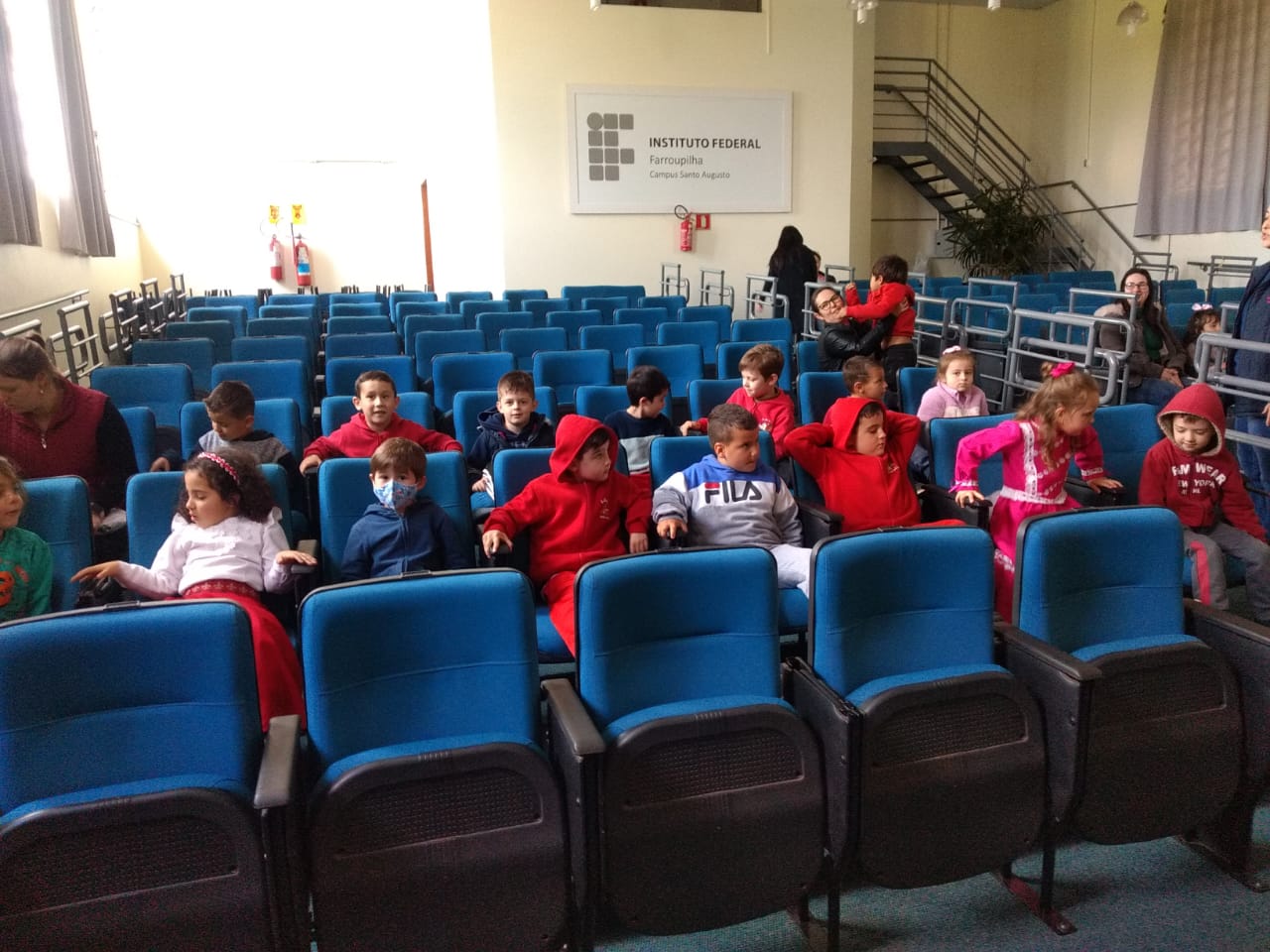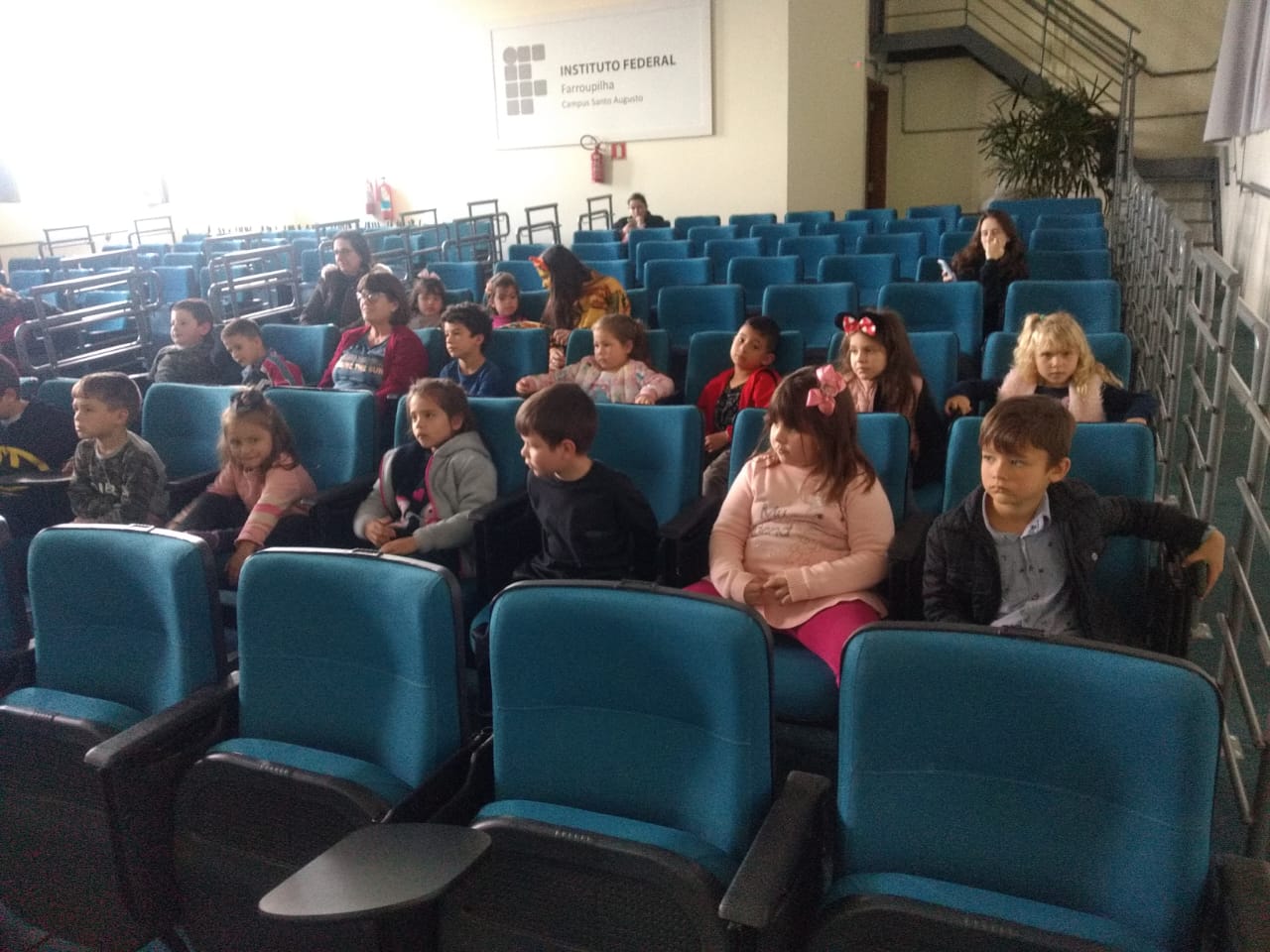 As crianças foram recebidas no auditório da instituição pelo coordenador do projeto no campus, professor Edevandro Sabino da Silva e pelas bolsistas, Allana Gehm, Eduarda Stroeher Schons, Júlia Luisa Morgesntern, Luana Benites, Maria Eduarda Trindade e Sabrina Caetano.