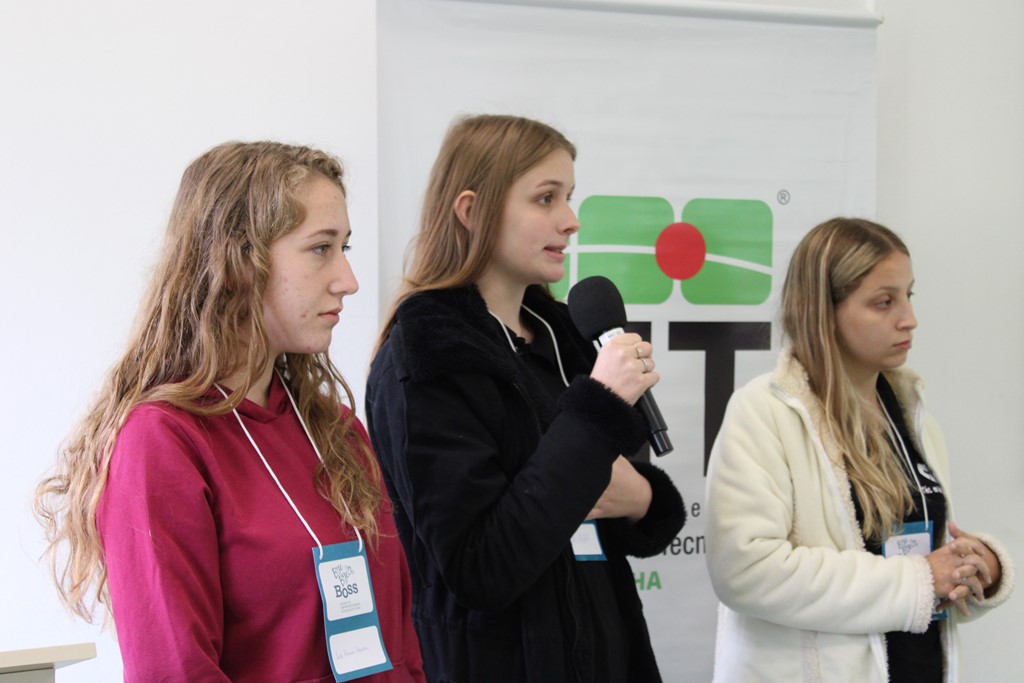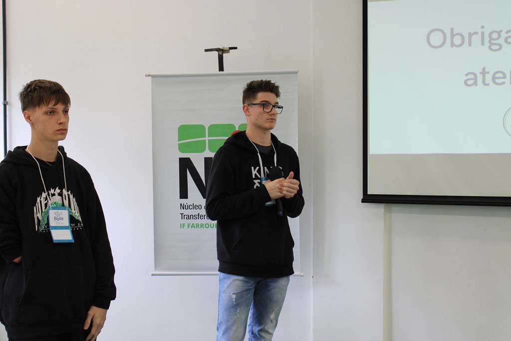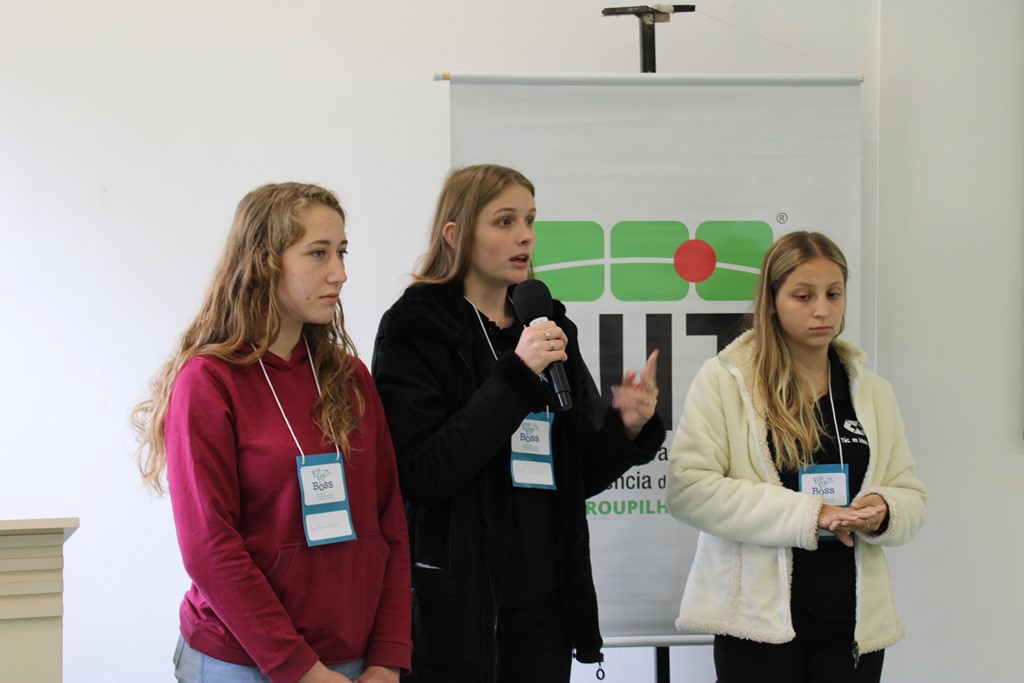 Bye Bye Boss - equipe Shark Boss: aplicativo de orientação de estudos para alunos do ensino fundamental (Ana Julia Trasel, Suele Mariane Schneider e Ana Laura Rockenbach) e equipe Bioempreendimento: Intermediação e Assistência Técnica para instalação de biodigestores em propriedades rurais (Alberto Veit e Arthur Bremm).