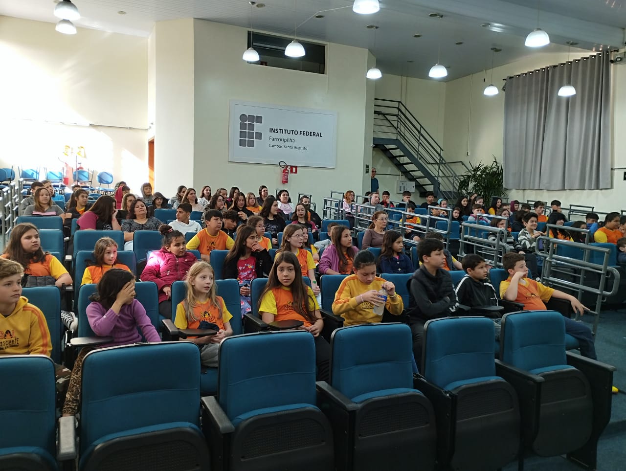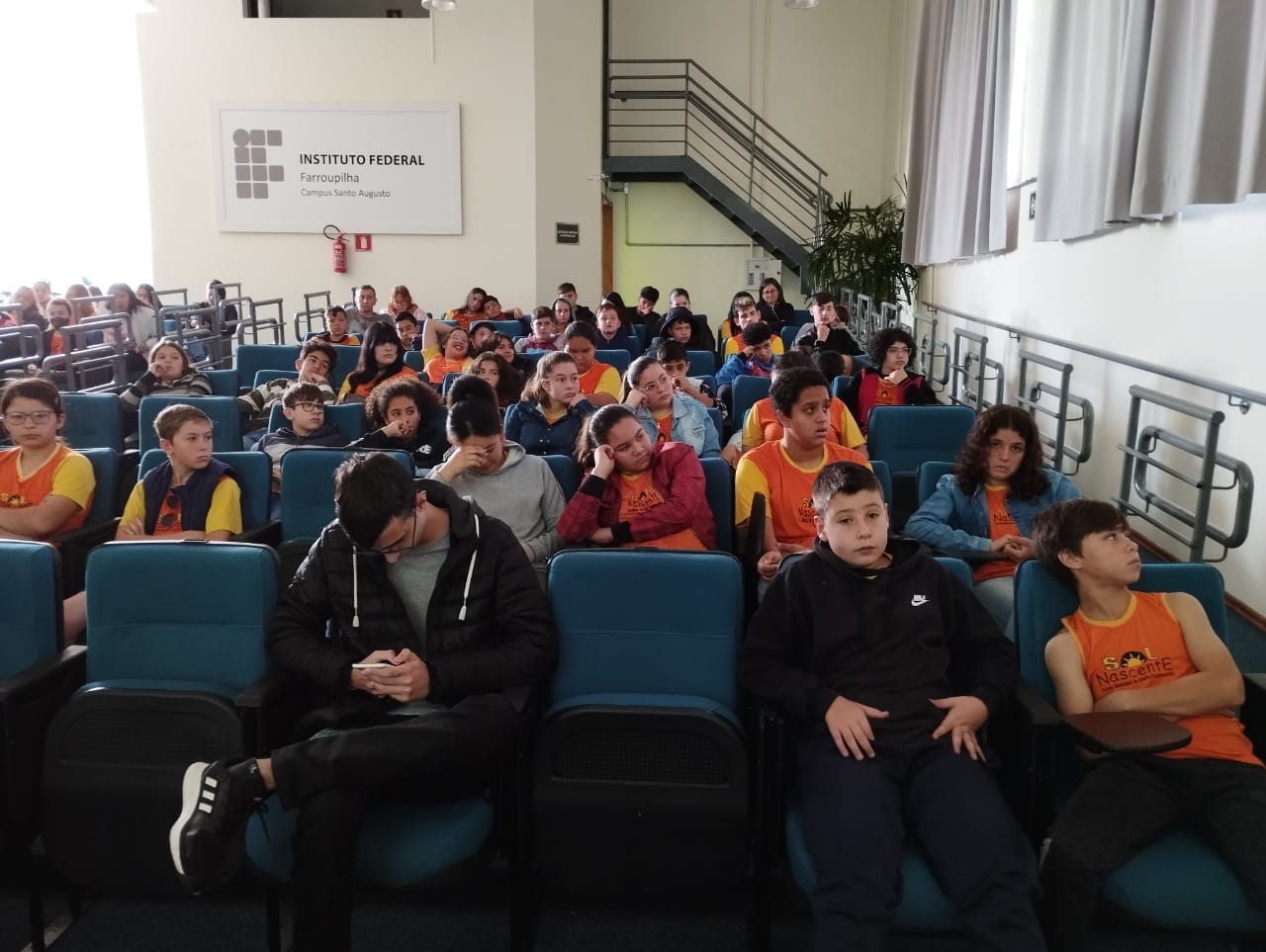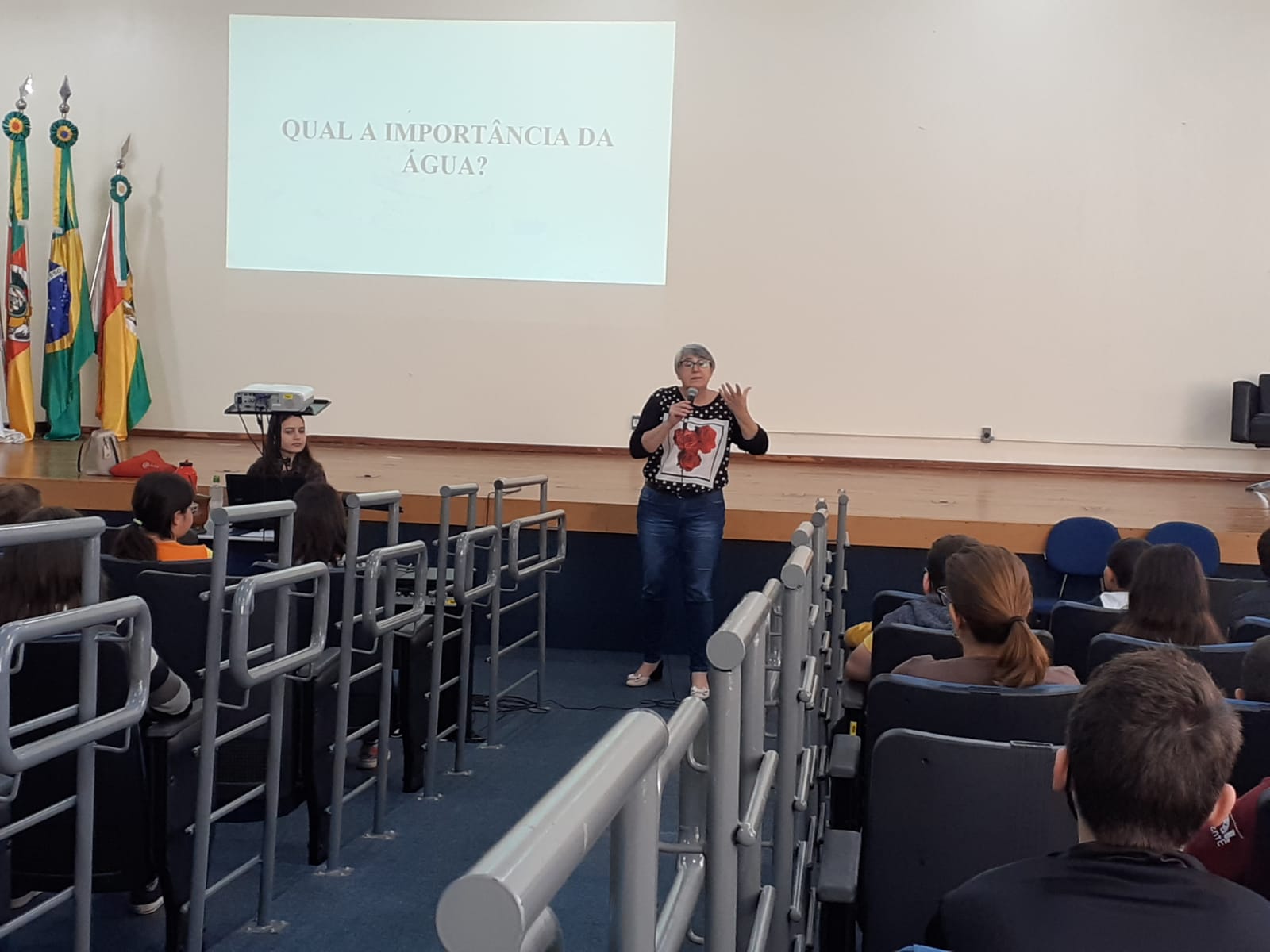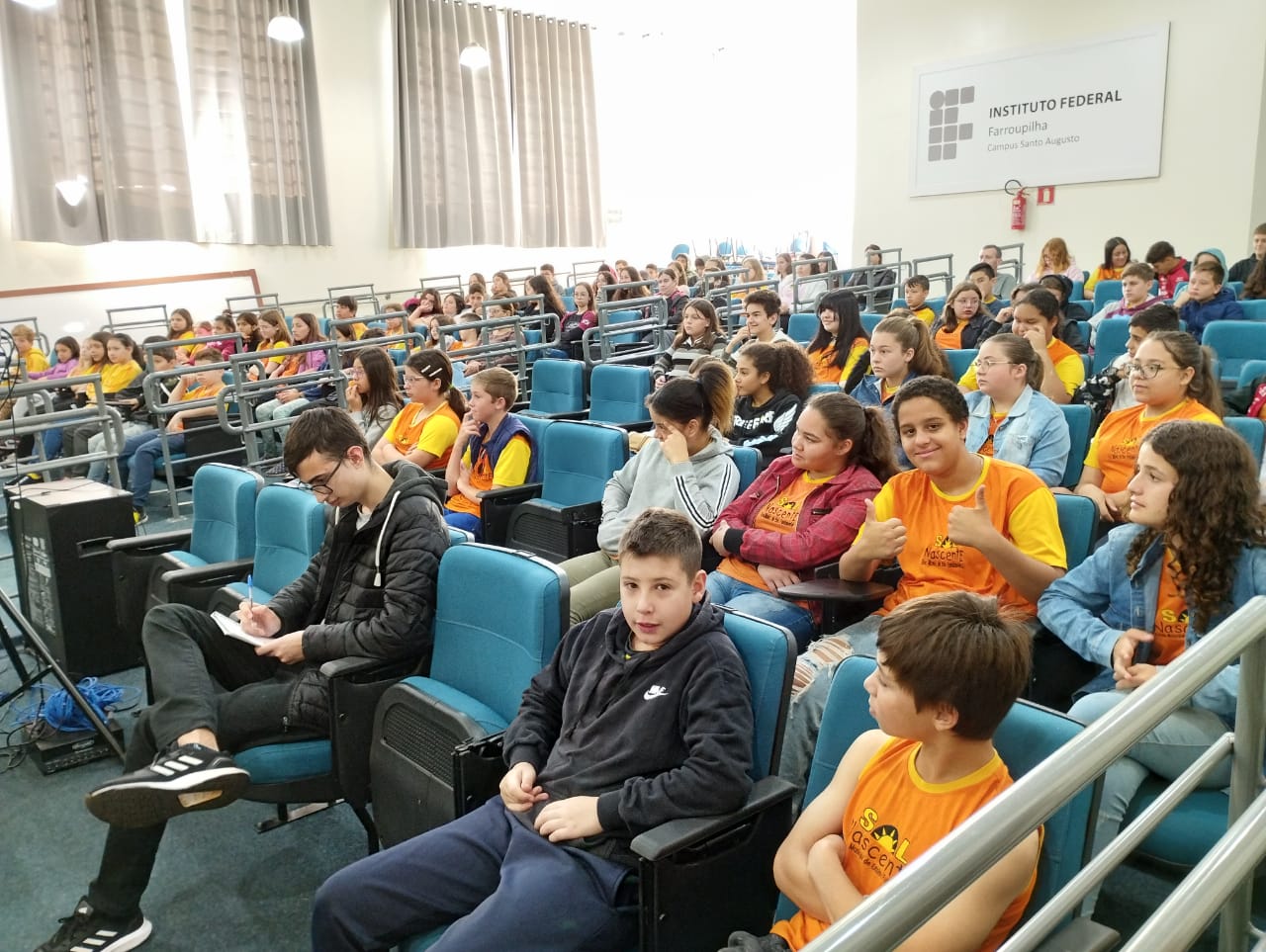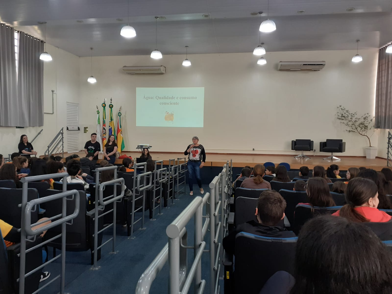 Na manhã desta quarta-feira, 19 de outubro, os acadêmicos de Licenciatura em Ciências Biológicas do IFFar – Campus Santo Augusto, Andressa Machado, Danieli Bueno Schreiber, Guilherme Faustino Boelter, Ricardo Johann e Thaís Luciane Morgenstern, ministraram uma palestra no auditório da instituição, com o tema “Água: qualidade e consumo consciente”, para cerca de 100 alunos e professores, do 5º ao 9º ano da Escola Municipal de Ensino Fundamental Sol Nascente. A atividade contou com a presença do servidor da Companhia Riograndense de Saneamento – CORSAN, Jeferson Oliveira.
