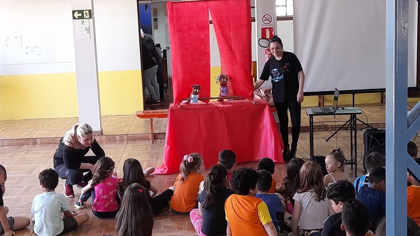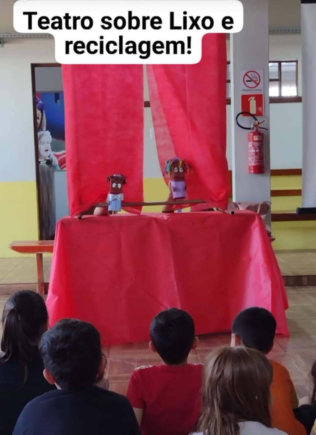 À tarde os acadêmicos foram até a Escola Sol Nascente, onde apresentaram, para os alunos do Pré- Nível 2 até a 4ª série, um teatro de fantoches e uma palestra com a temática “Lixo e Meio Ambiente”.