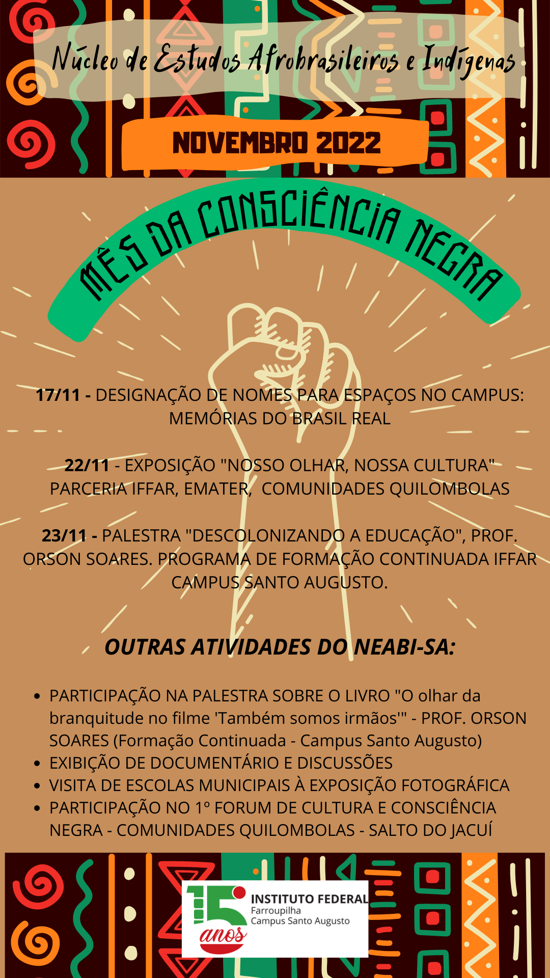 O Núcleo de Estudos Afrobrasileiros e Indígenas do IFFar – Campus Santo Augusto – Neabi está promovendo uma série de atividades alusivas ao Dia da Consciência Negra, comemorado no dia 20 de novembro.