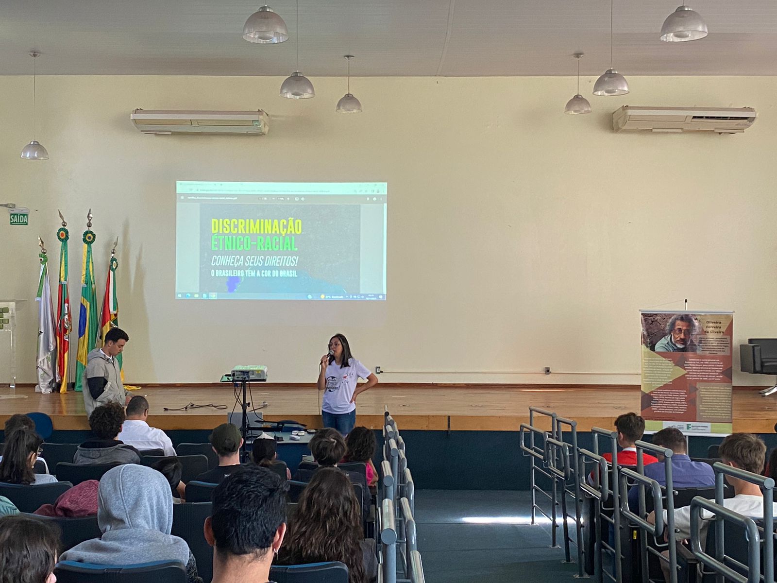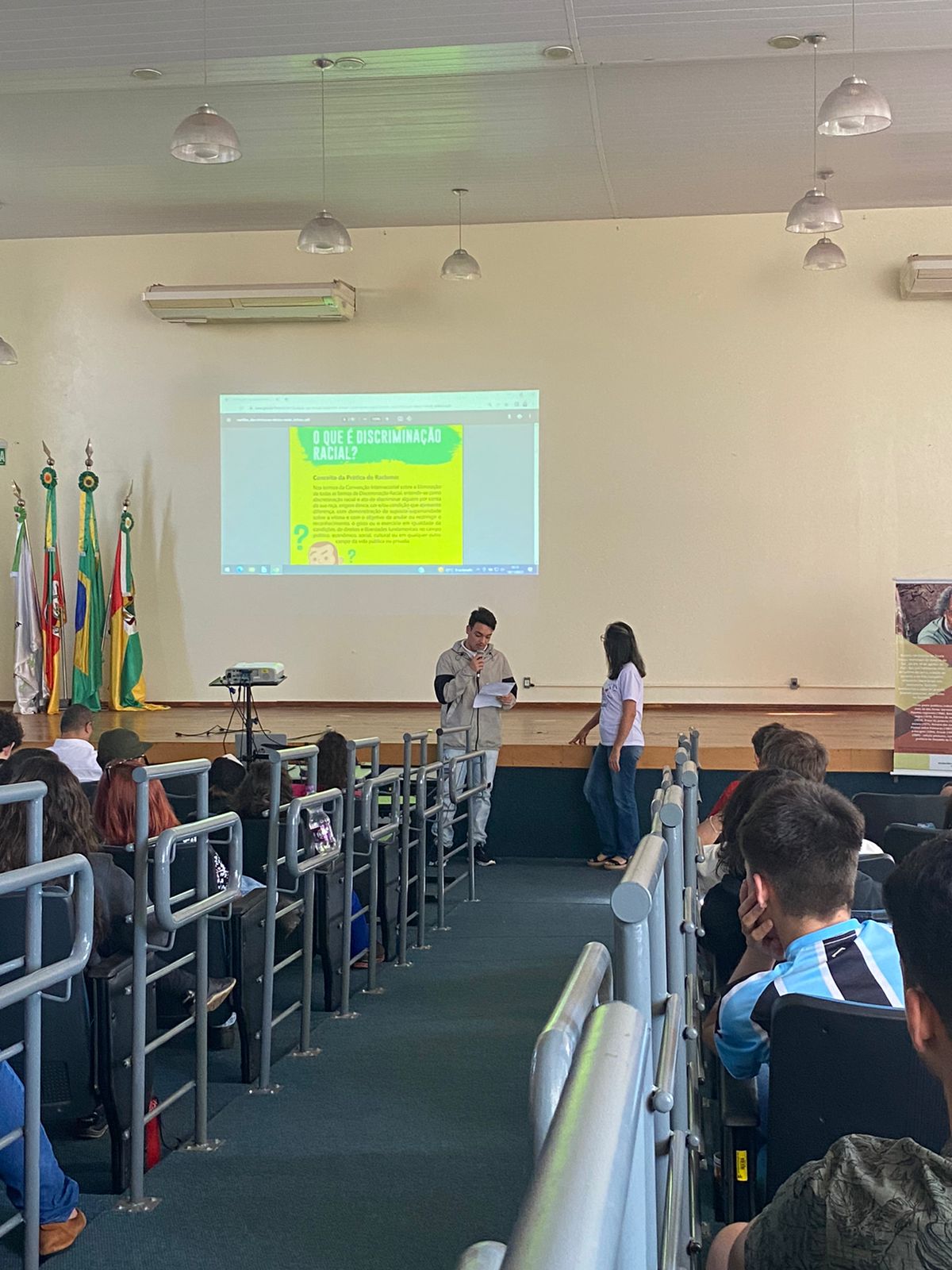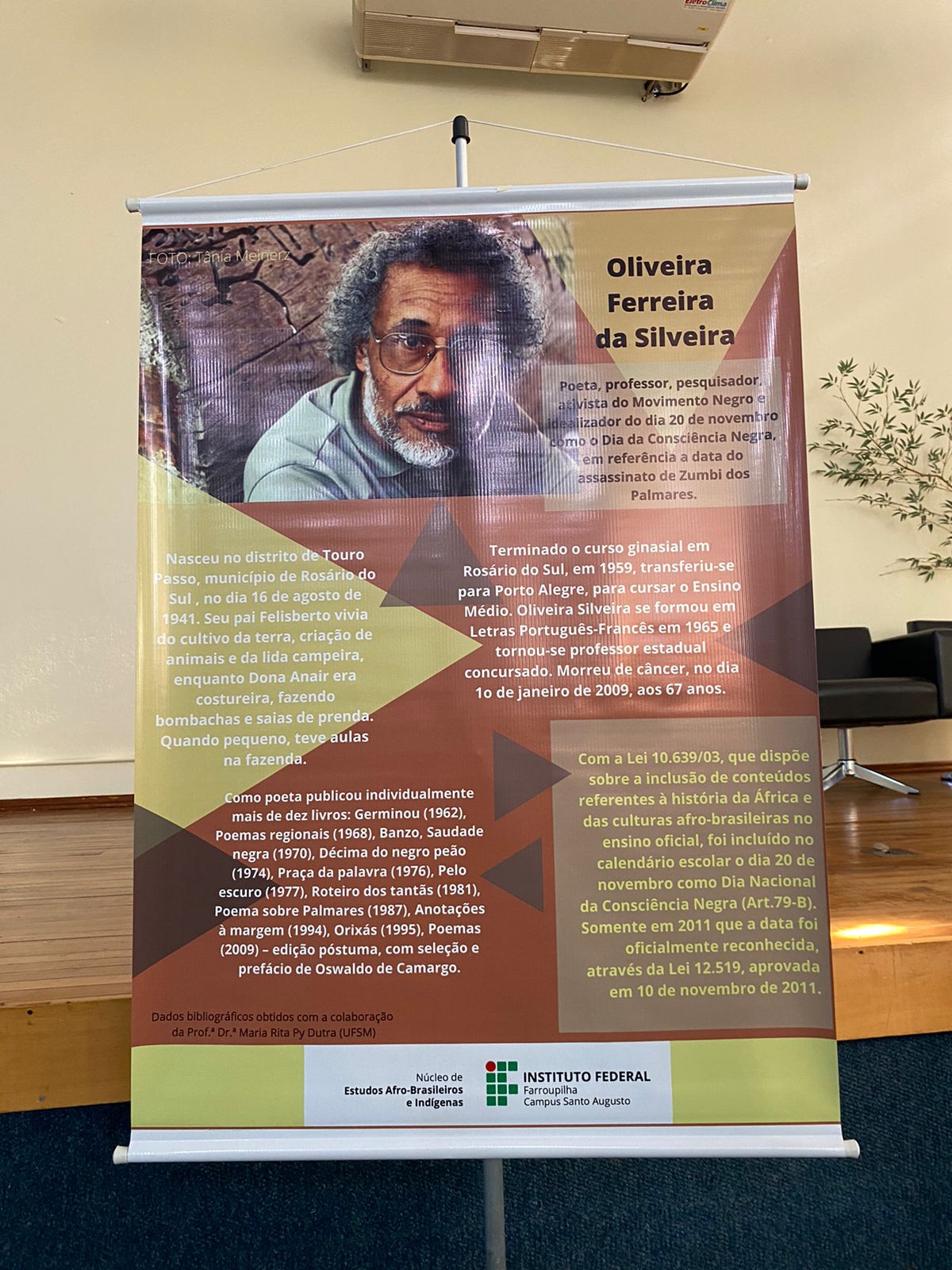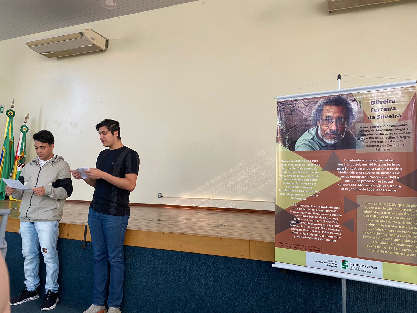 Na manhã desta sexta-feira, dia 18 de novembro, os estudantes dos cursos técnicos integrados ao ensino médio, assistiram no auditório do campus, o documentário “Sou”, que retrata a vida e obra do poeta gaúcho Oliveira Ferreira Silveira. Na sequência, integrantes do Neabi realizaram um debate com os estudantes sobre a temática, também foram lidas poesias de Oliveira Ferreira Silveira.