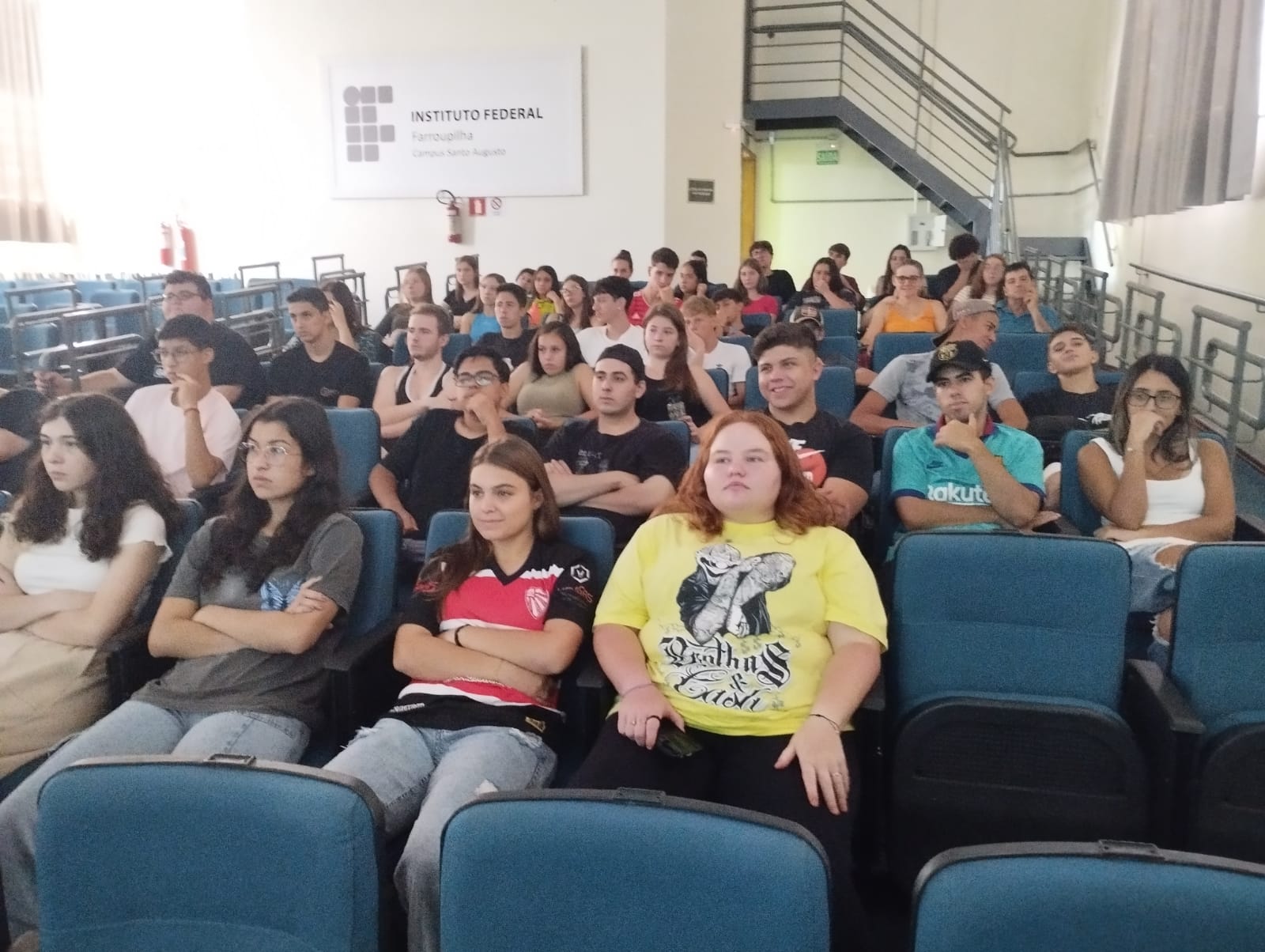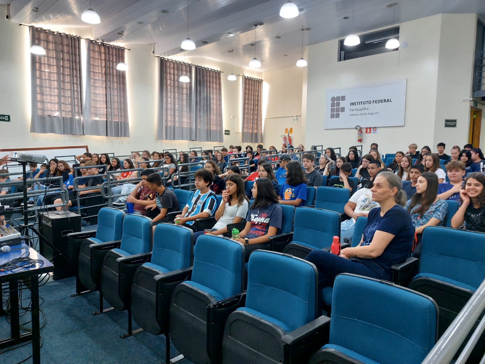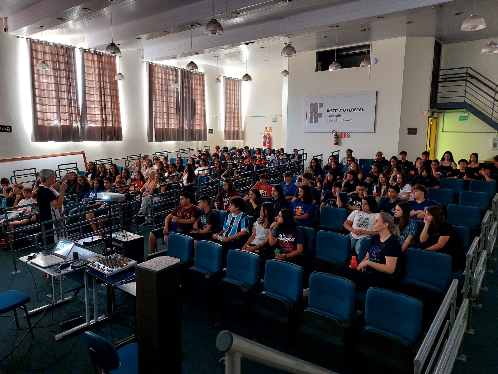 Participaram da palestra, no turno da manhã, estudantes dos anos finais do ensino fundamental e do 3º ano do ensino médio da Escola Estadual de Ensino Médio Santo Augusto (Ginásio), e à noite, participaram os estudantes do ensino médio noturno da escola, totalizando cerca de 250 participantes.