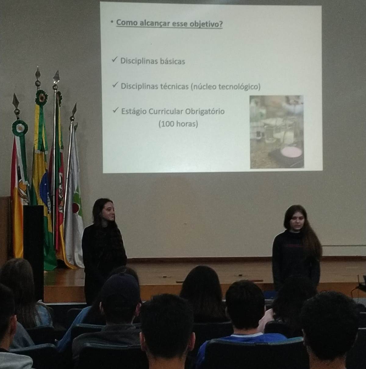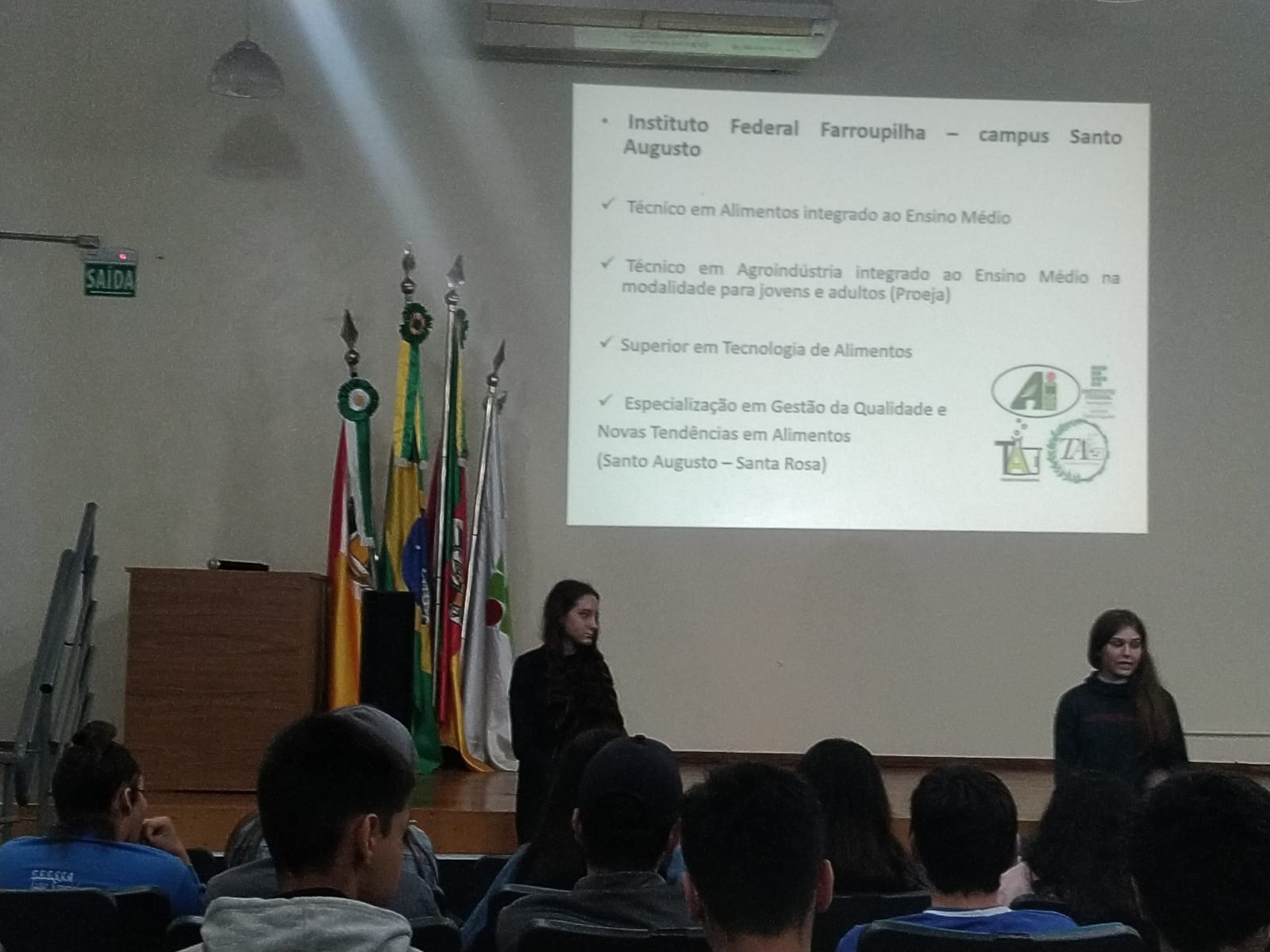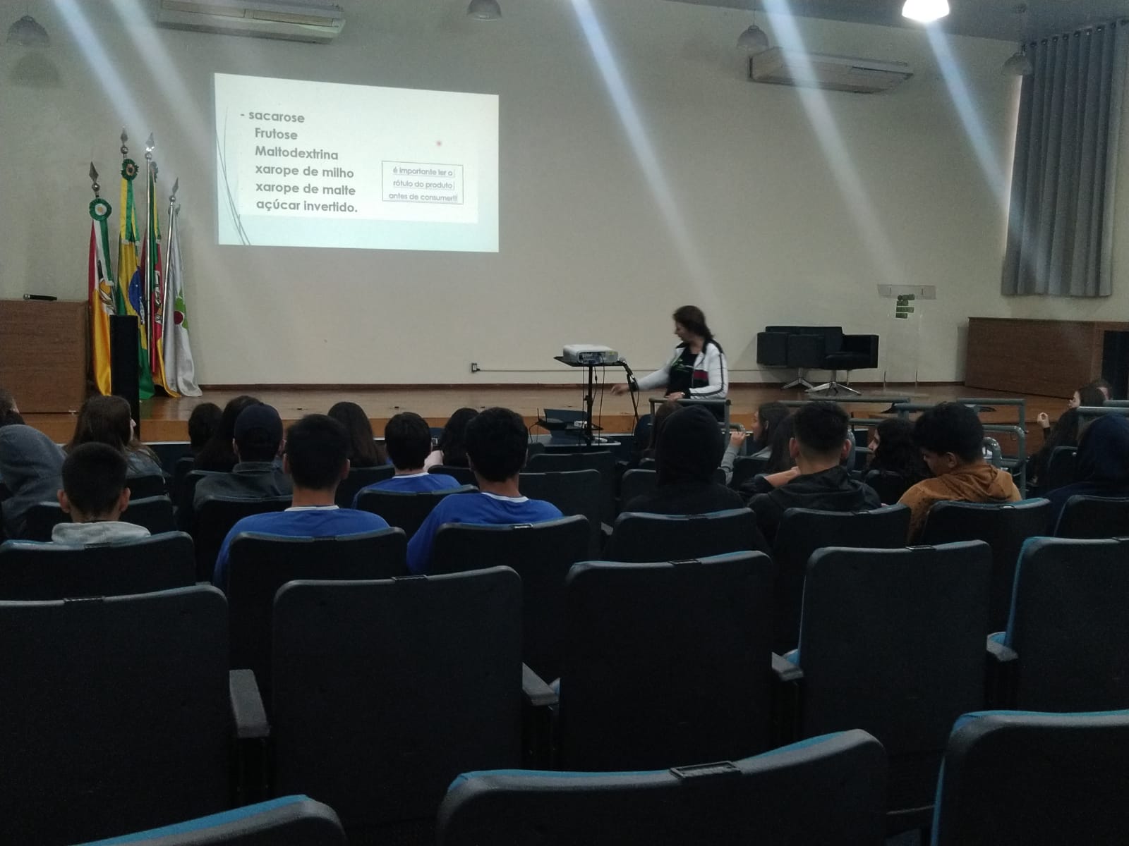 O grupo foi conduzido primeiramente ao auditório do Campus, onde a professora Melissa falou sobre Produtos Industrializados e os Mitos e Verdades dos Alimentos, depois alunos do 3º ano do Técnico em Alimentos falaram sobre o curso e apresentaram trabalhos produzidos nas Práticas Profissionais Integradas –PPI sobre Alimentação Saudável.
