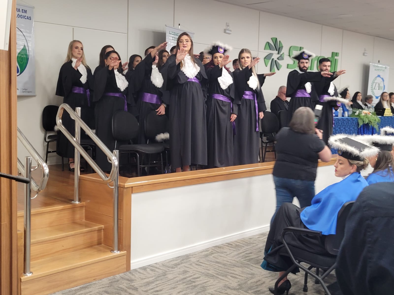 O evento contou com a presença, além dos 44 formandos, da Pró-Reitora de Extensão do IFFar, Ângela Maria Andrade Marinho, representando a Reitora, Nídia Heringer; da Diretora Geral do Campus Santo Augusto, Márcia Fink; da Diretora de Ensino, Téoura Benetti; da Coordenadora do Curso Superior de Bacharelado em Administração e Patronesse da 2ª turma, Maira Fátima Pizolotto e da paraninfa, Simone Beatriz Nunes; do Conselheiro Administrativo do Conselho Regional de Administração - CRA, Alceu De Oliveira Lopes; da Coordenadora do curso superior de Licenciatura em Ciências Biológicas, Flávia de Oliveira Junqueira; da paraninfa da 4ª turma, Clarinês Hames, e do patrono, Gustavo Marques Da Costa; da Coordenadora do curso superior de Licenciatura em Computação e Paraninfa da 10ª turma, Renira Carla Soares e da patronesse, Marcia Adriana Rosmann; da Coordenadora do curso superior de Tecnologia em Alimentos, Melissa Dos Santos Oliveira, da paraninfa da 12ª turma, Mauriceia Greice Oliveira; e da patronesse, Leidi Daiana Preichardt, da Secretária Municipal de Educação, Eliane Paier, professores homenageados, servidores e familiares.