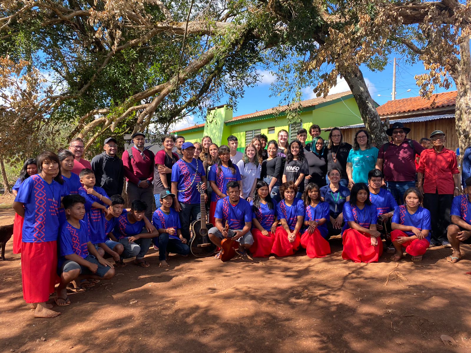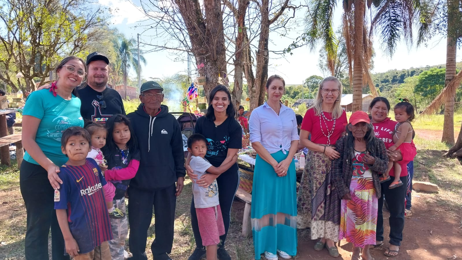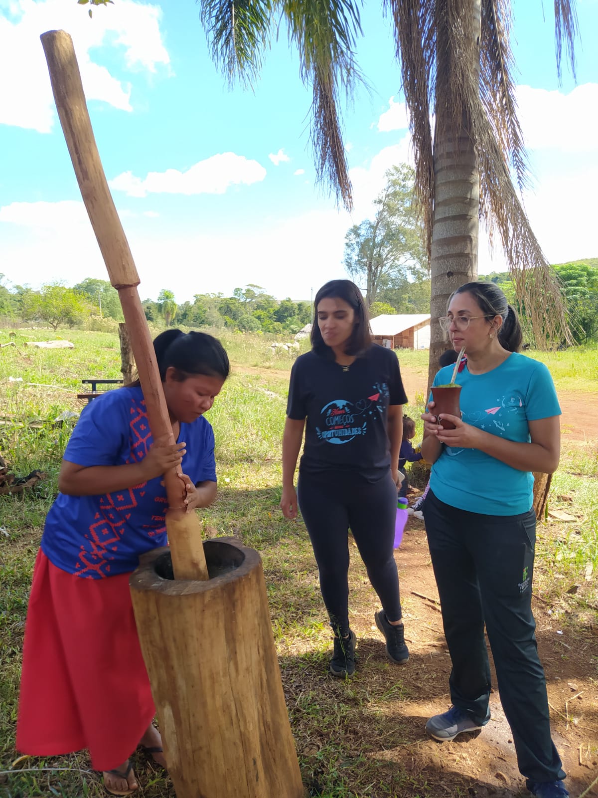 Janice, Marciano e Laís com indígenas Mbyá Guarani e professoras que atuam na aldeia