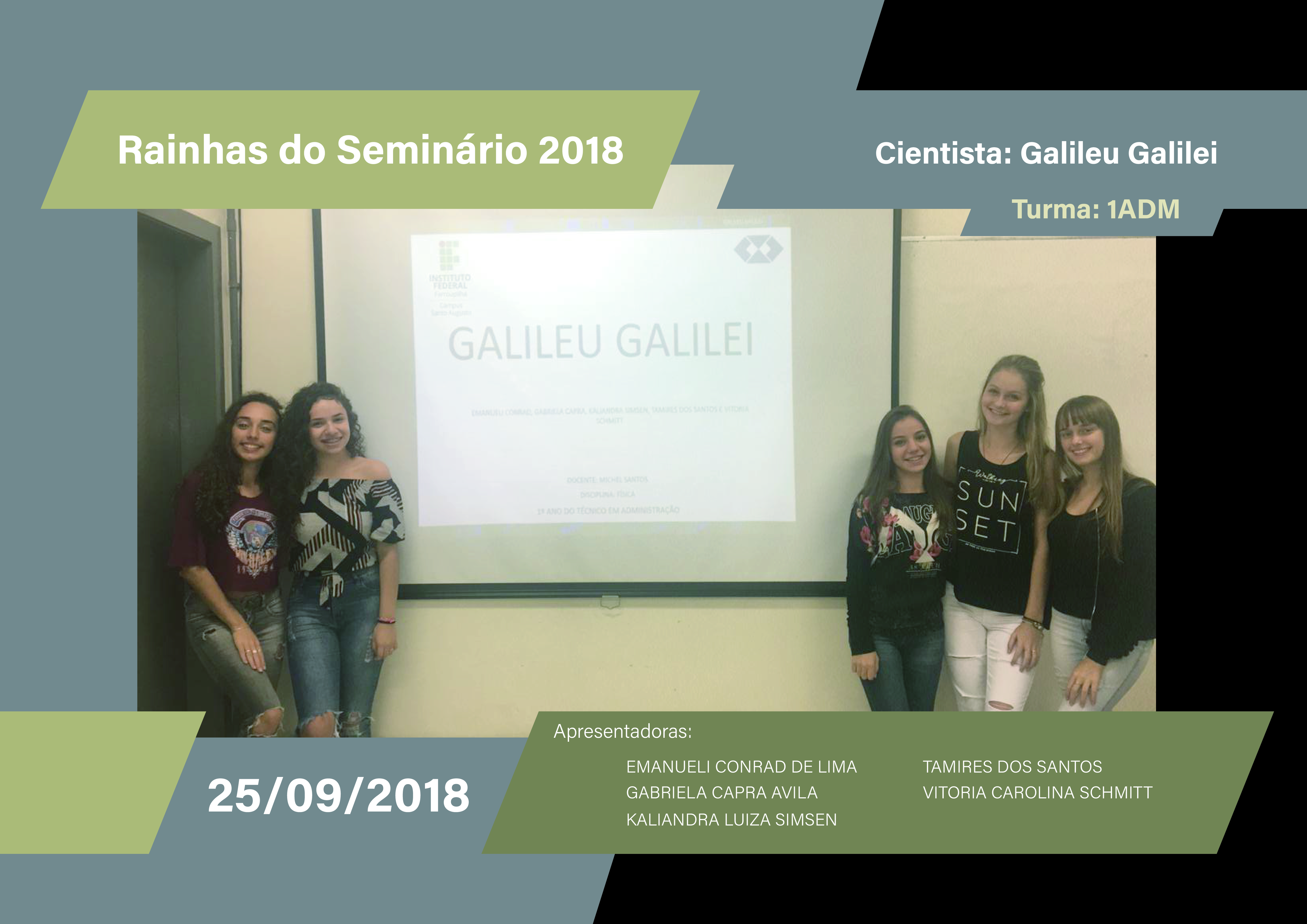2018 - Emanueli Conrad de Lima, Gabriela Capra Avila, Kaliandra Luiza Simsen, Tamires dos Santos e Vitoria Carolina Schmitt com o seminário sobre Galileu Galilei;