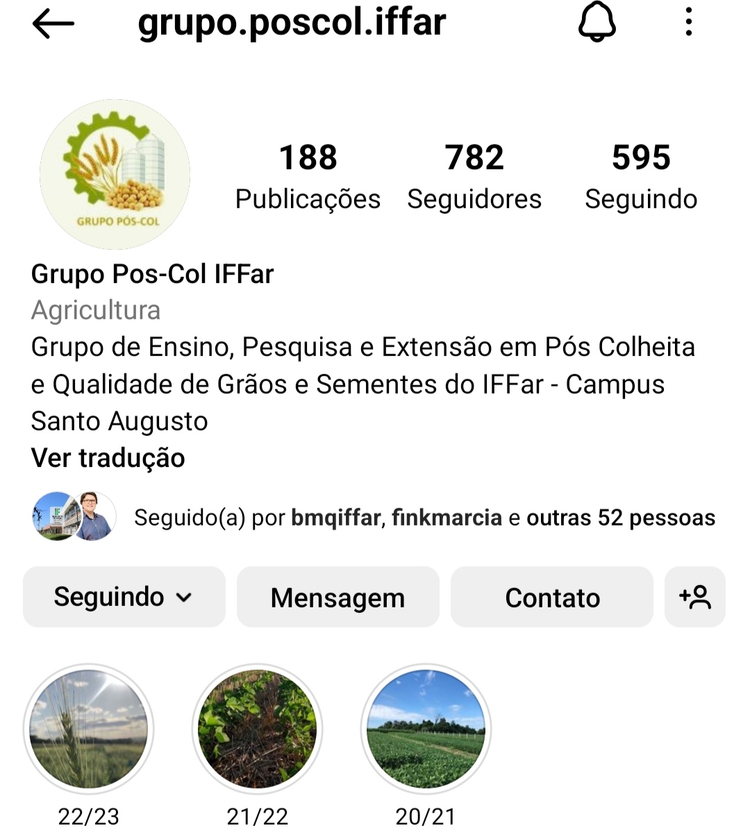 O Projeto de Extensão “Segurança e Qualidade na Utilização de Grãos e Sementes”, desenvolvido no IFFar – Campus Santo Augusto, sob a coordenação do professor Dr. Ricardo Paraginski, em 2023 esteve em sua 6ª edição, tendo como colaboradores os servidores, Lessandro de Conti, Marlo Pinto, Hamilton Rosa, Jarbas Melo, Fernando Schreiber e Sander Adams e os acadêmicos de Agronomia, Darlan Dörtelmann, Alessandra Ströher, Luiz Juliani, Alencar Zanella, Hernan Stumm, Andressa Bandeira e Vitor Muller.