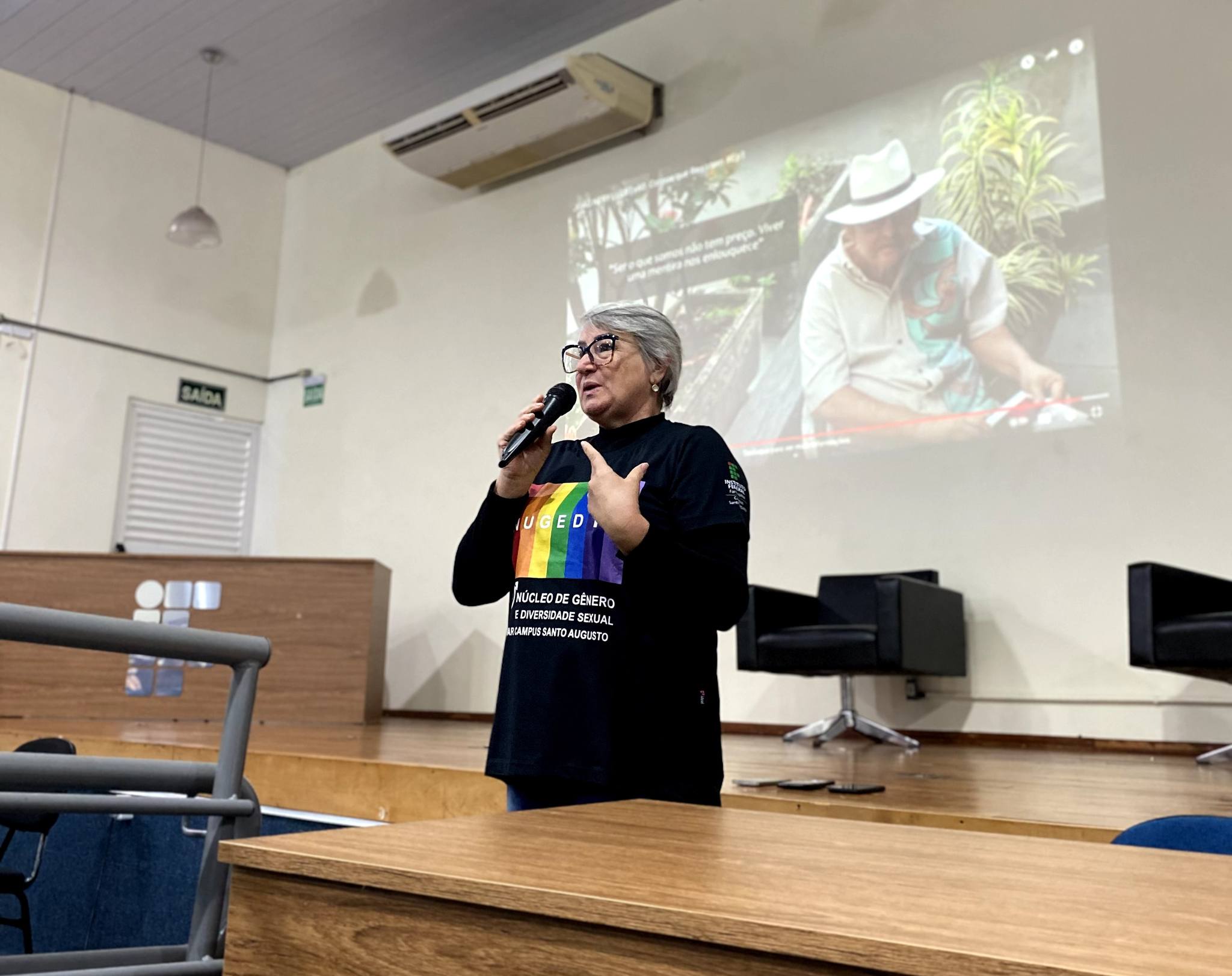 Outra ação foi a exibição de um vídeo para os estudantes dos cursos técnicos e superiores, gravado pelo professor da Universidade Federal da Bahia - UFBA, Leandro Colling, a convite da professora do IFFar- Campus Santo Augusto e presidente do Nugedis, Clarinês Hames. No vídeo Leandro fala sobre a origem do Dia Internacional do Orgulho LGBTQIAPN+, na revolta do bar Stonewall Inn em Nova York nos Estados Unidos, em 28 de junho de 1969, quando lésbicas, gays, travestis e drags, pessoas negras e migrantes, cansaram de se submeter ao preconceito e se rebelaram contra uma abordagem policial violenta. O vídeo completo pode ser assistido no canal do YouTube do Campus no link https://www.youtube.com/watch?v=Fpx-gf_zPlo