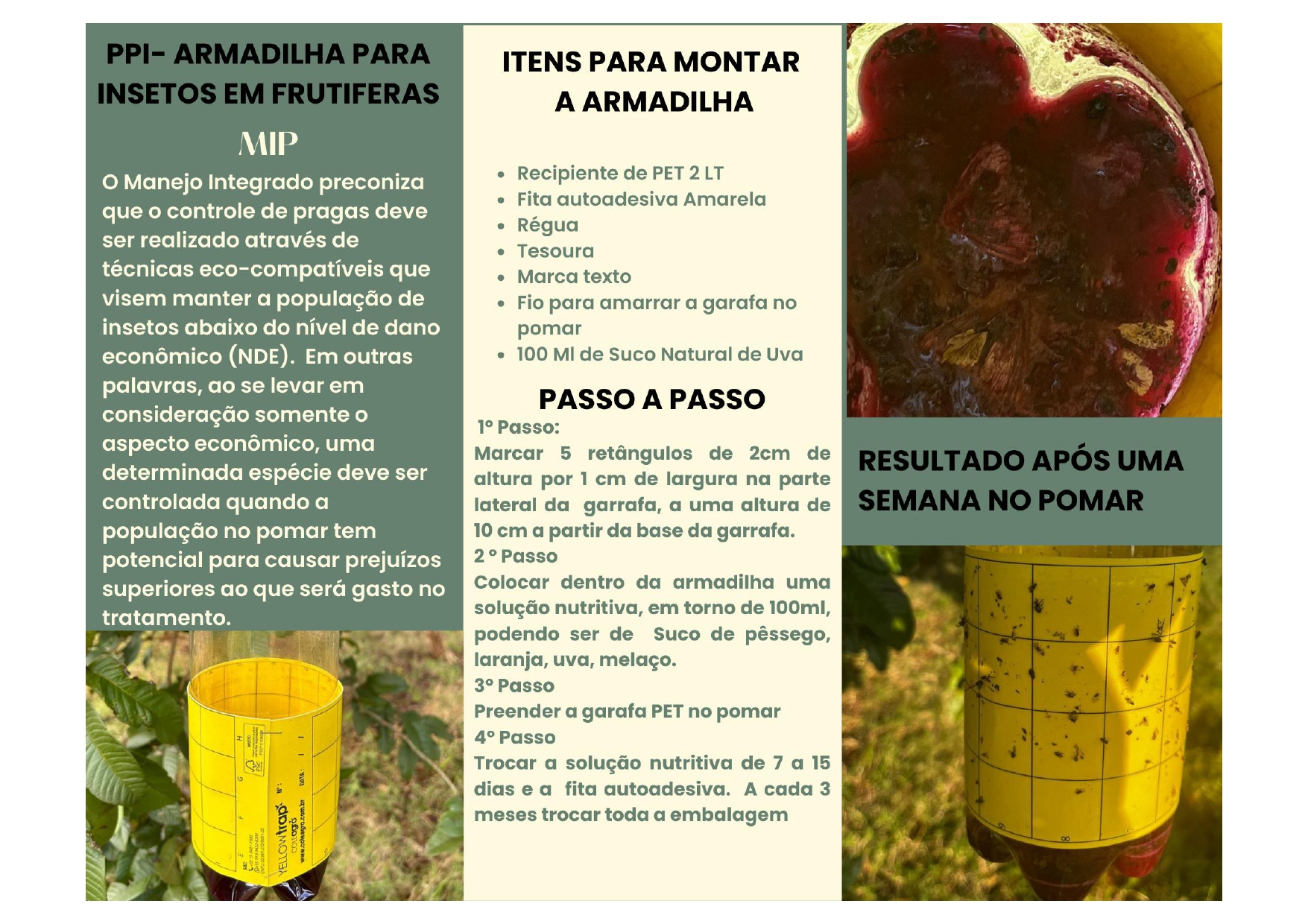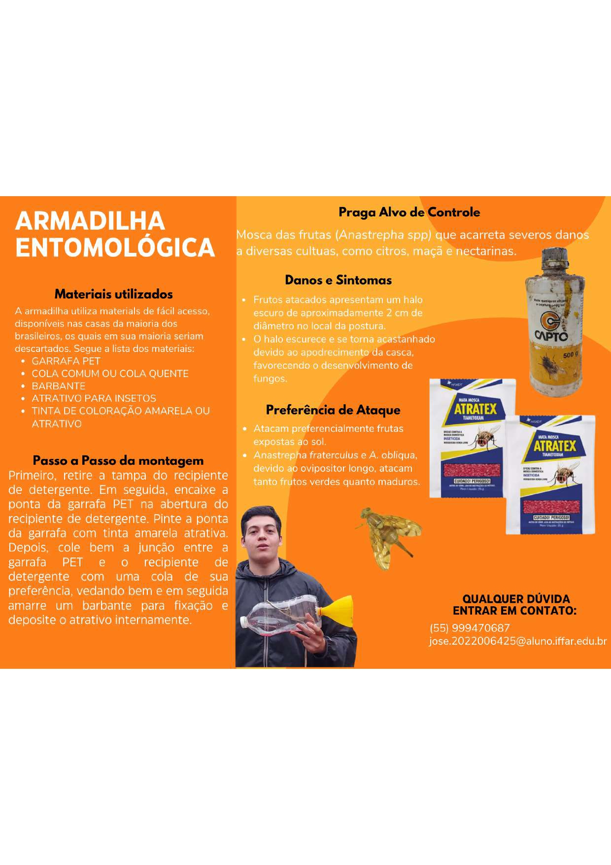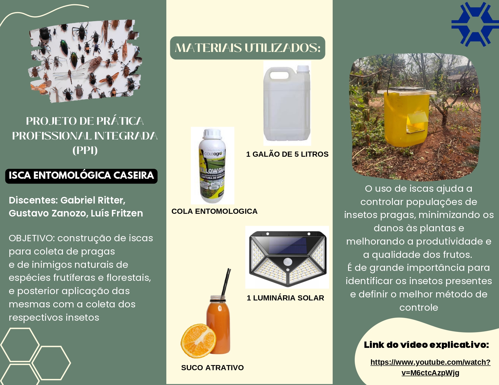 A turma do 5º semestre do curso superior de Bacharelado em Agronomia do IFFar –Campus Santo Augusto, finalizou o projeto de Prática Profissional Integrada (PPI) denominada “Construção de Sistema de Coleta de Pragas e Inimigos Naturais”, desenvolvida dentro das disciplinas de Entomologia (Rafael Bonadiman), Fruticultura (Ricardo Paraginski) e Agricultura de Base Ecológica(Tarcísio Samborski).