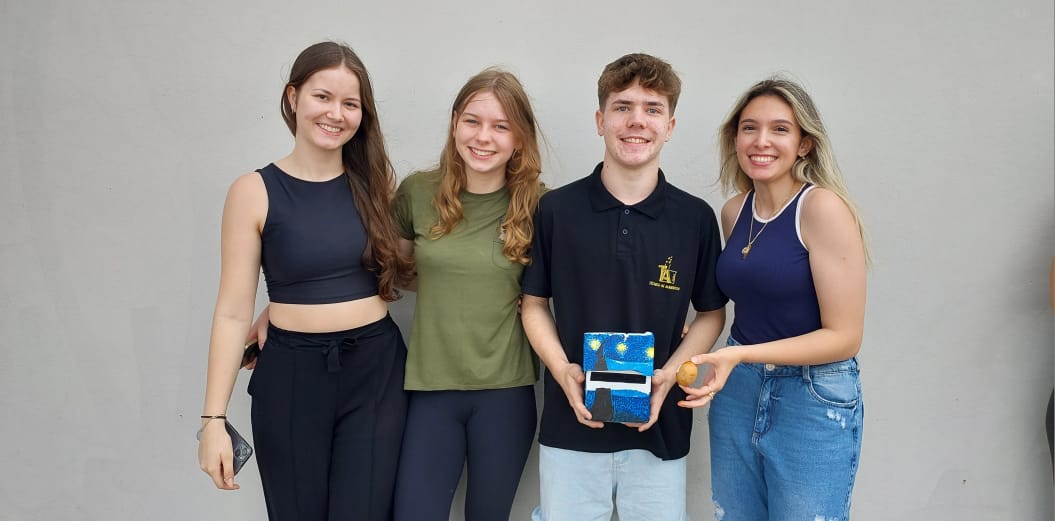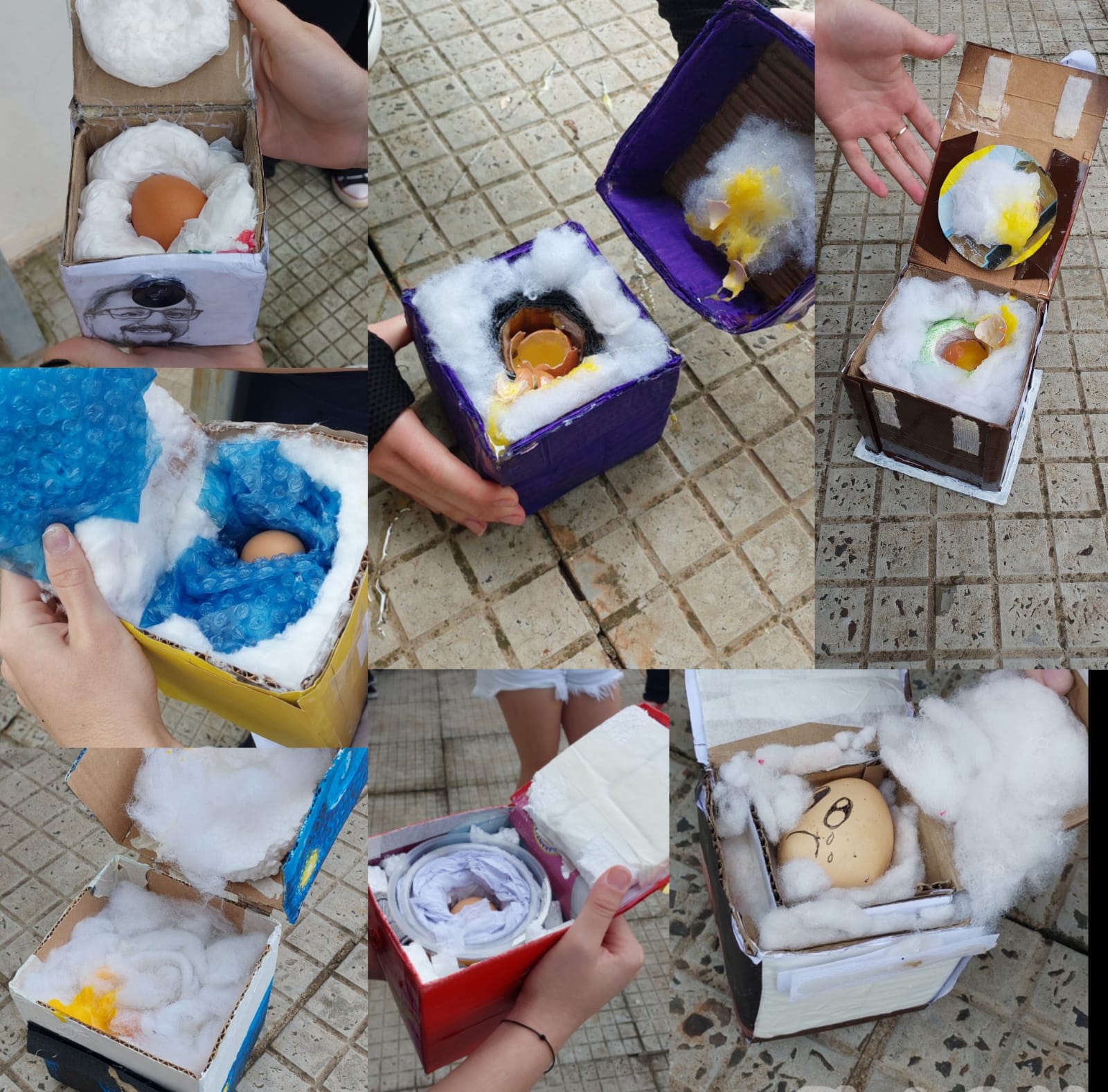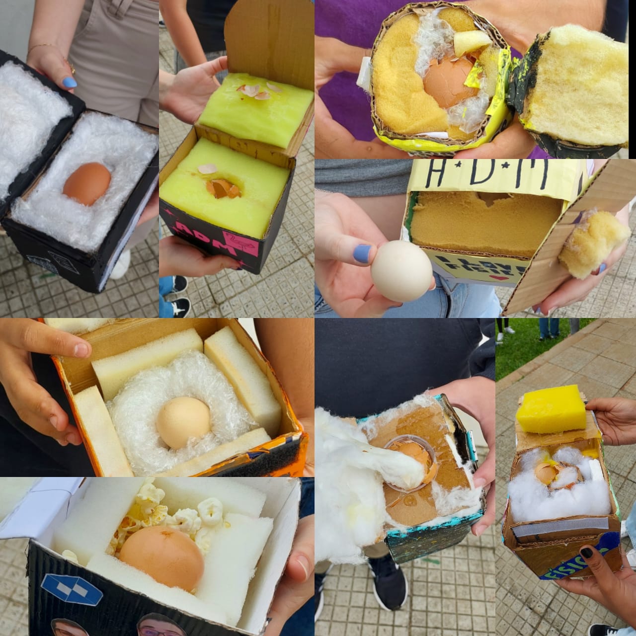 Divididos em grupos de até cinco pessoas, eles tiveram a tarefa de construir uma embalagem protetora para um ovo cru, utilizando materiais recicláveis. O objetivo era evitar que o ovo quebrasse ao ser largado de uma altura específica, aplicando conhecimentos de física aprendidos em sala de aula, como queda livre, leis de Newton e impacto, oferecendo uma oportunidade prática para os estudantes explorarem os efeitos da gravidade e o comportamento dos objetos em movimento.