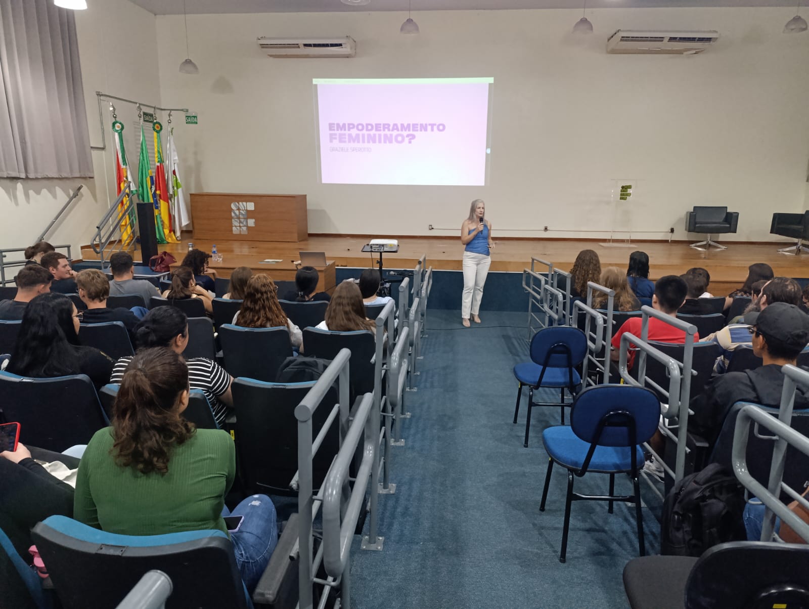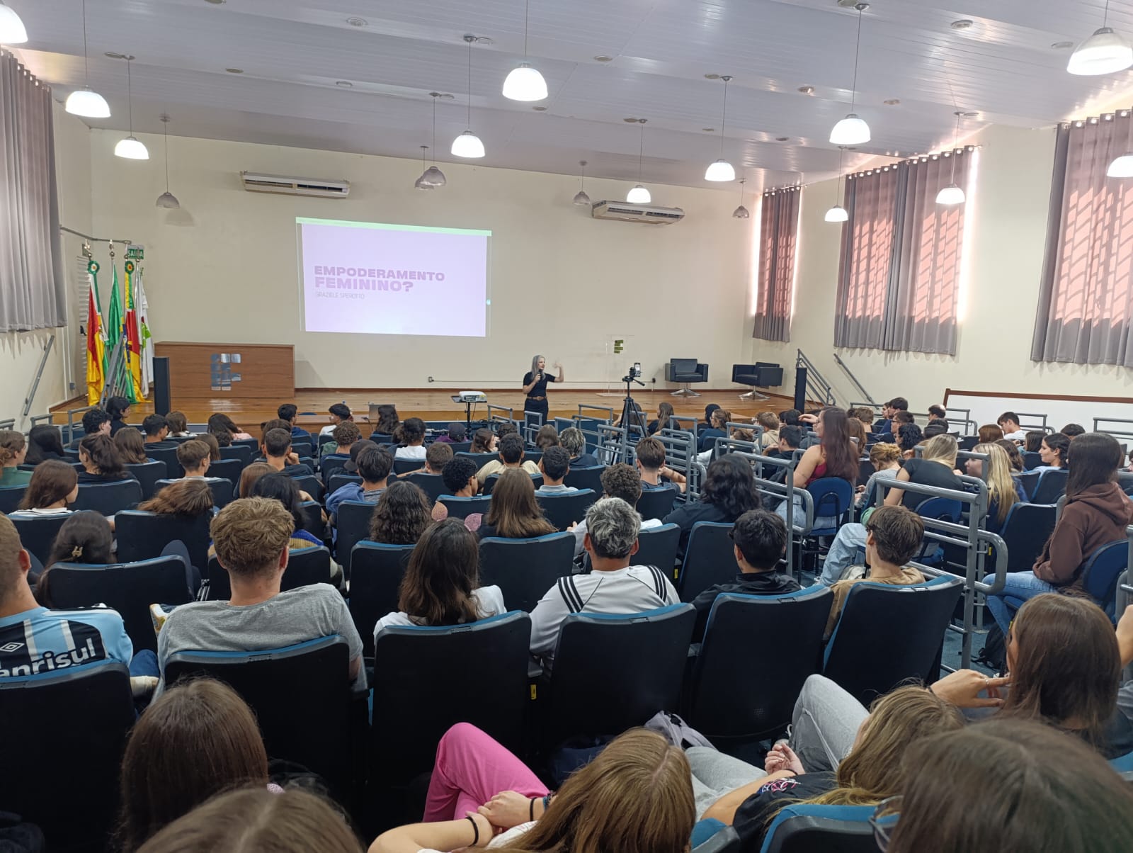 O Núcleo de Gênero e Diversidade Sexual do IFFar – Campus Santo Augusto – NUGEDIS, promoveu na última sexta-feira, dia 28 de março, as 10h, no auditório da instituição, uma palestra com a publicitária e criadora de conteúdo digital, Grazieli Sperotto, sobre Empoderamento Feminino, com a participação dos estudantes dos 1º anos dos cursos técnicos integrados ao ensino médio e os 2ºs anos do técnico em Administração e de Alimentos.