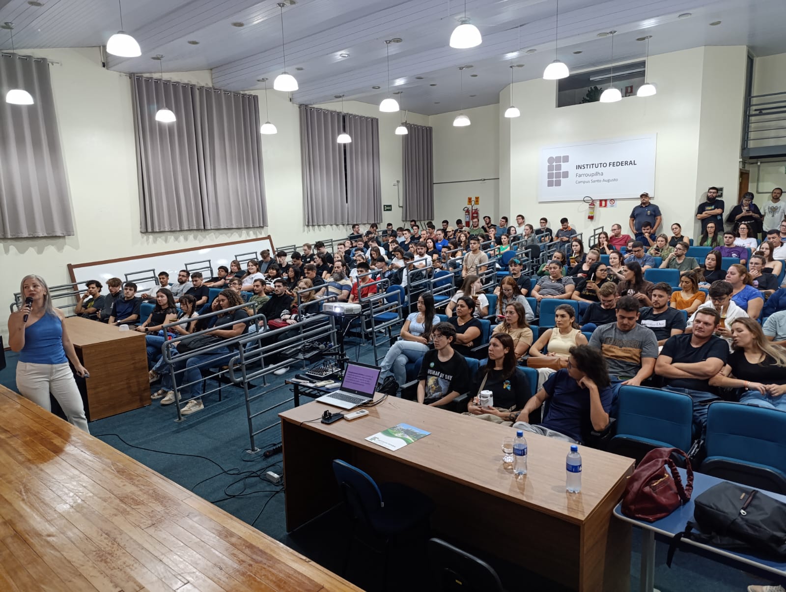 À noite, às 19h, Grazi ministrou a palestra para os acadêmicos dos cursos superiores de Licenciatura em Computação e Licenciatura em Ciências Biológicas e para as turmas de 5º semestre de Administração, Agronomia, Tecnologia em Alimentos e Gestão do Agronegócio.