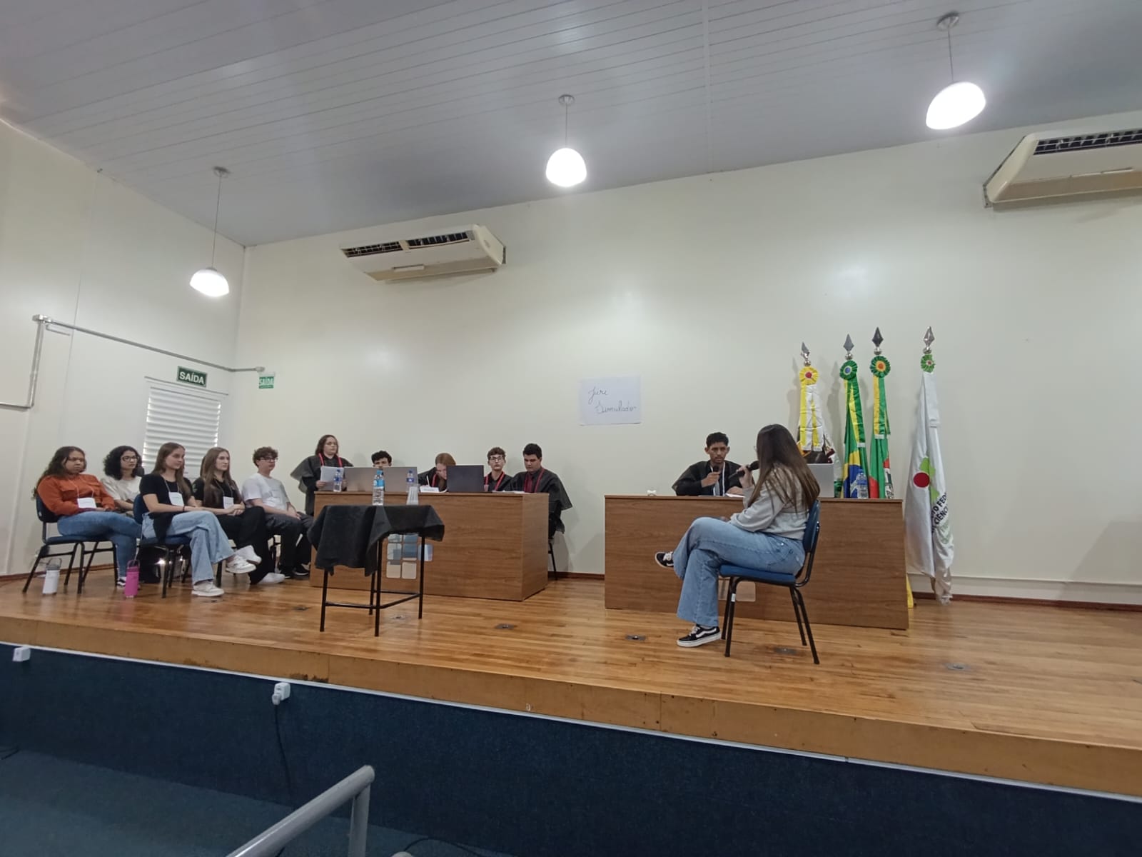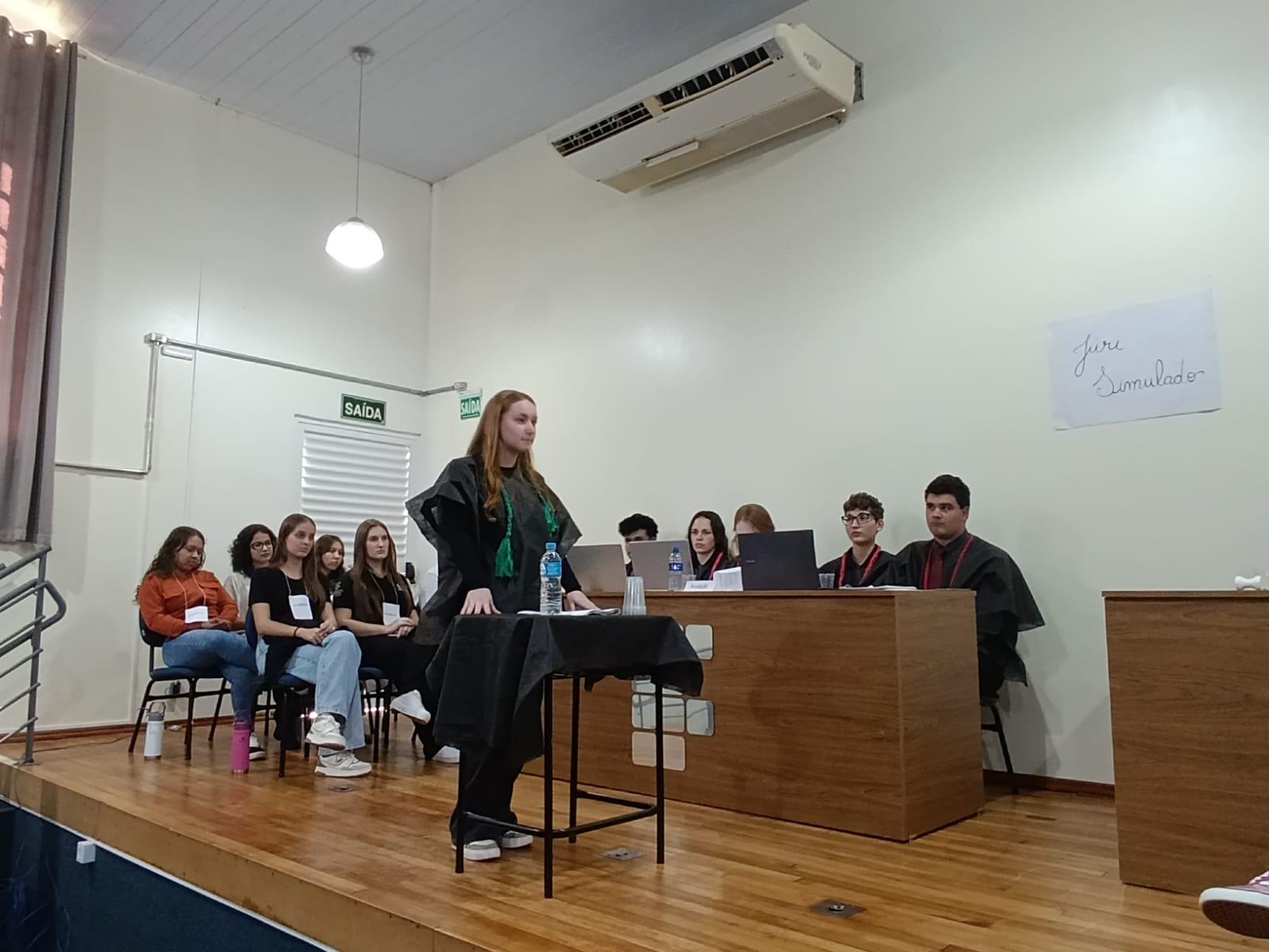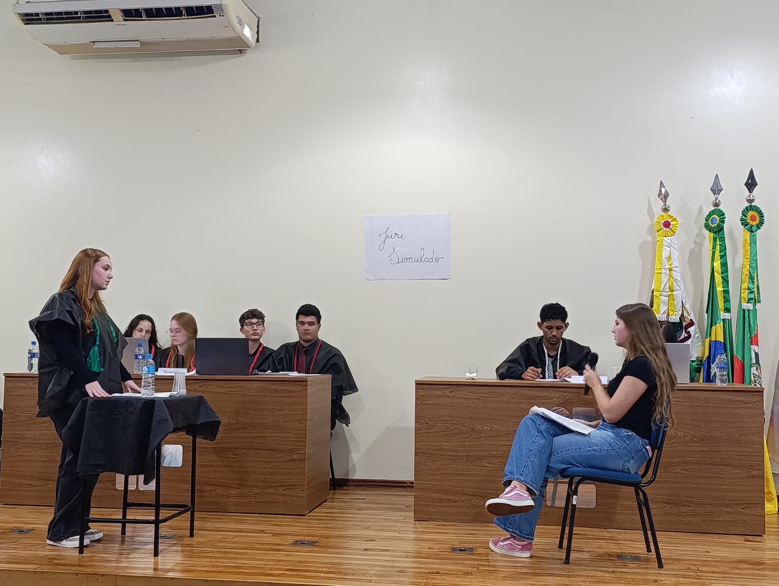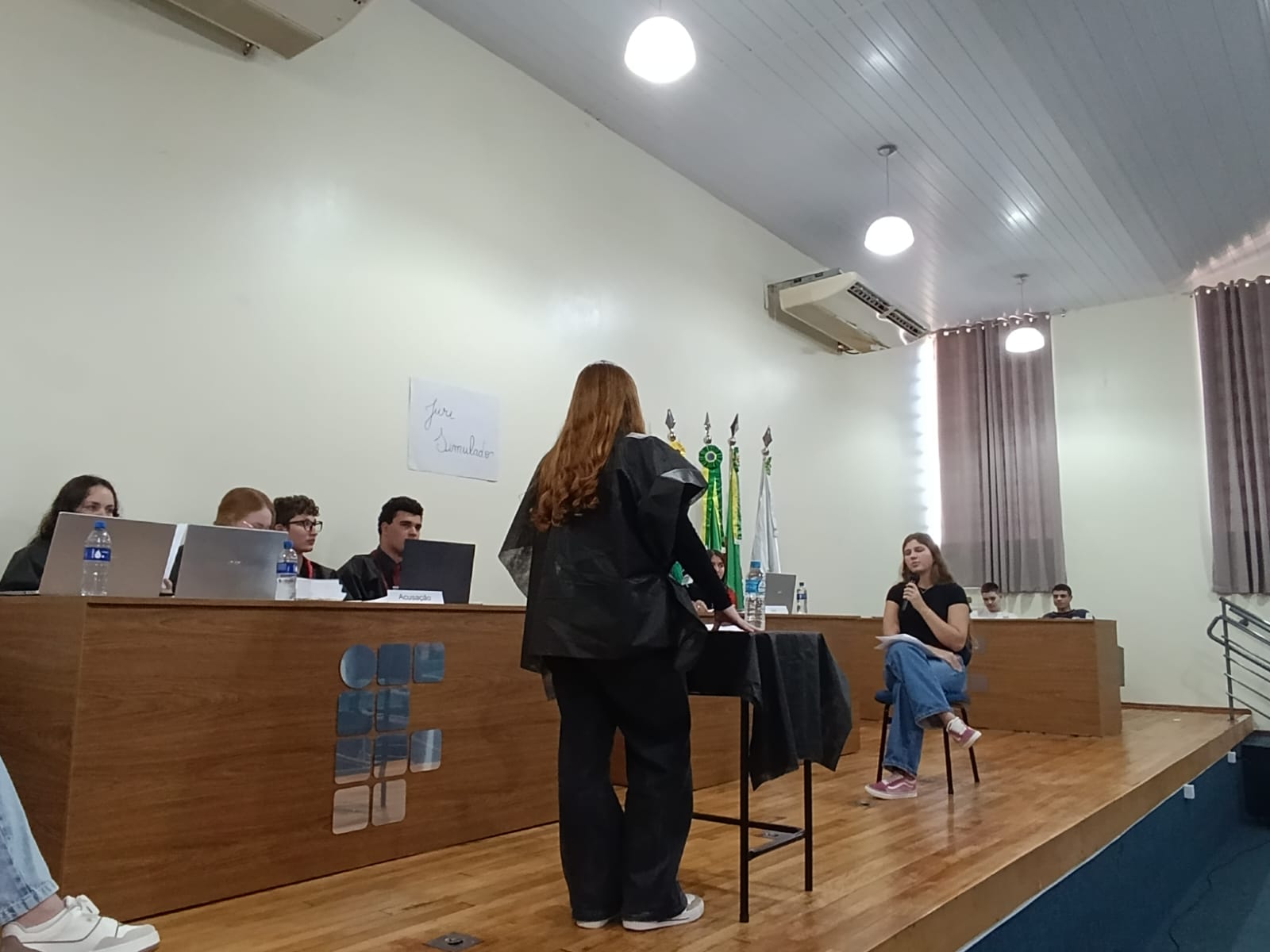 Na ocasião, os estudantes assumiram os papéis de juiz, promotor, defensor, réu, testemunhas e jurados, encenando um julgamento completo, com base em um caso fictício elaborado para estimular o debate jurídico e moral. A atividade contou com a presença dos alunos do 1º e 2º ano do mesmo curso, que participaram como ouvintes, acompanhando o processo e observando a argumentação desenvolvida pelos colegas.