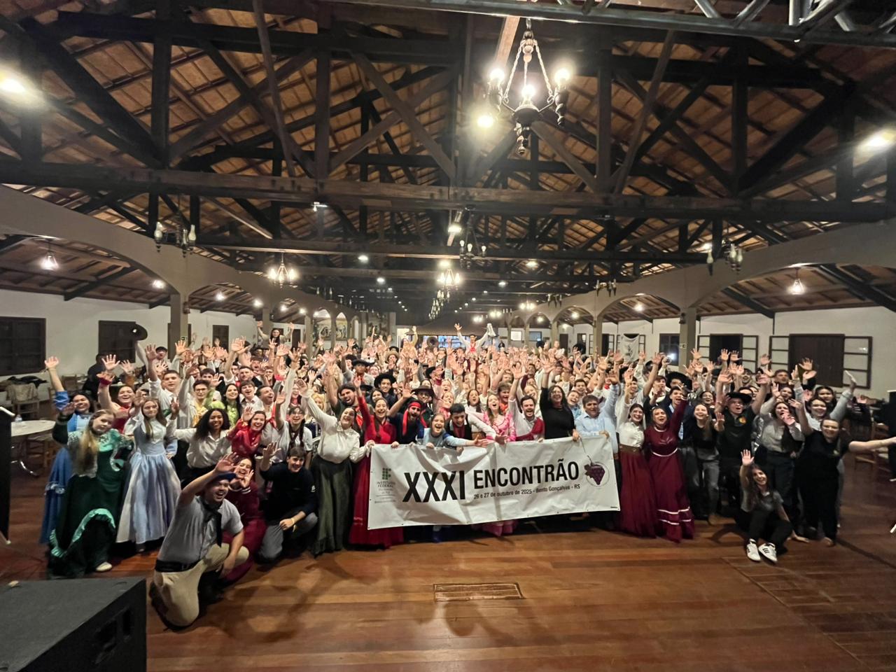 Entre os dias 26 e 27 de outubro, o DTG Sinuelo Farroupilha, do IFFar - Campus Santo Augusto, por meio do projeto de extensão “Tradição em Movimento: cultuando o passado”, coordenado pelo professor Edevandro Sabino da Silva, participou do XXXI Encontro Tradicionalista das Instituições Federais da Região Sul do Brasil realizado no Instituto Federal do Rio Grande do Sul - IFRS - Campus Bento Gonçalves. O projeto conta ainda com a colaboração da assistente de alunos, Daniele Uhlmann Anacleto e do técnico em enfermagem, Lázaro Souza Santos, os quais acompanharam a delegação formada por 24 estudantes.