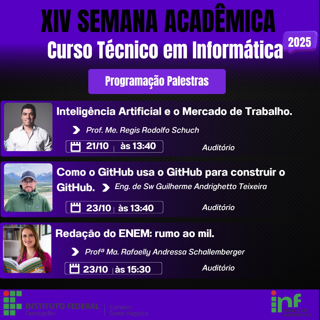 O Dia do Técnico de Informática é comemorado em 19 de outubro, data também conhecida como Dia do Profissional de Tecnologia da Informação (TI), em celebração a data os estudantes do Curso Técnico em Informática integrado ao ensino médio do IFFar – Campus Santo Augusto promoveram de 20 a 24 de outubro a Semana do Técnico em Informática, com o objetivo de integrar alunos, professores e profissionais da área, visando ampliar conhecimentos, estimular a troca de experiências e fortalecer a formação prática e teórica dos participantes.