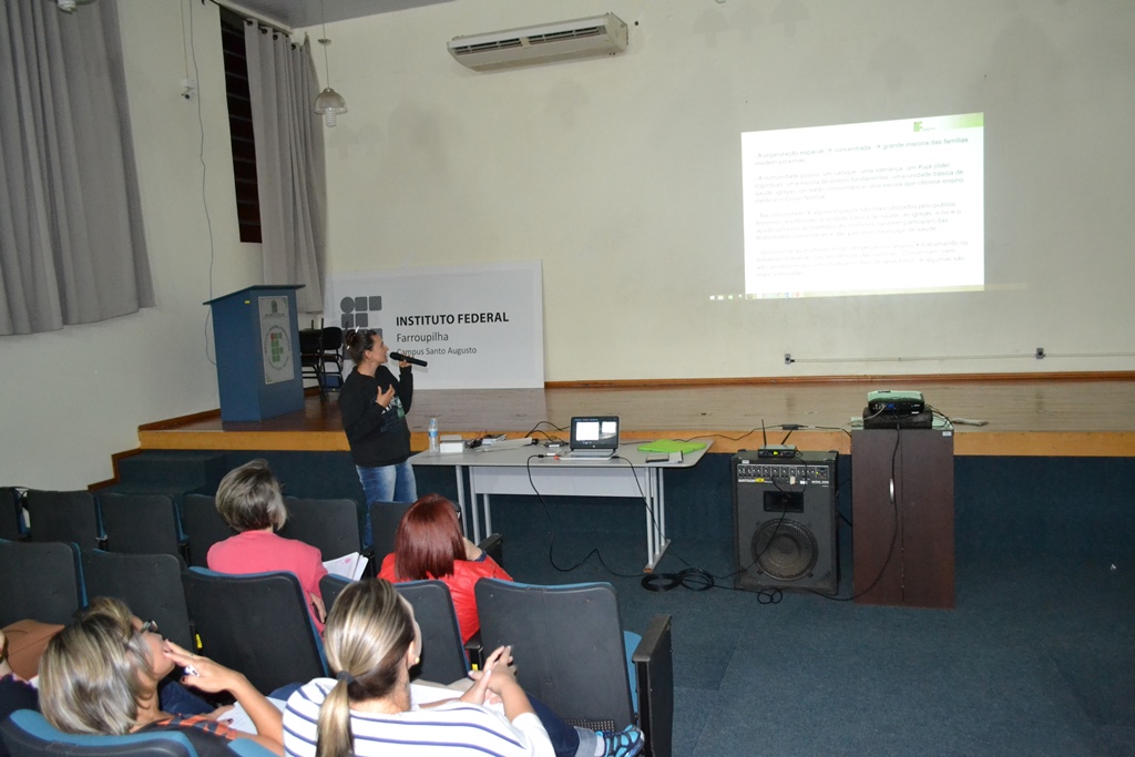 Antes do debate, a aluna Verena Strada, que é professora do Instituto Estadual de Educação Indígena Ângelo Manhká Miguel, apresentou seu trabalho de conclusão da Especialização em Espaços Alternativos do Ensino e da Aprendizagem, sobre “Os diferentes espaços de atuação das mulheres Kaingang na organização sociocultural e na manutenção da cultura na comunidade indígena Inhacorá de São Valério do Sul - RS”.