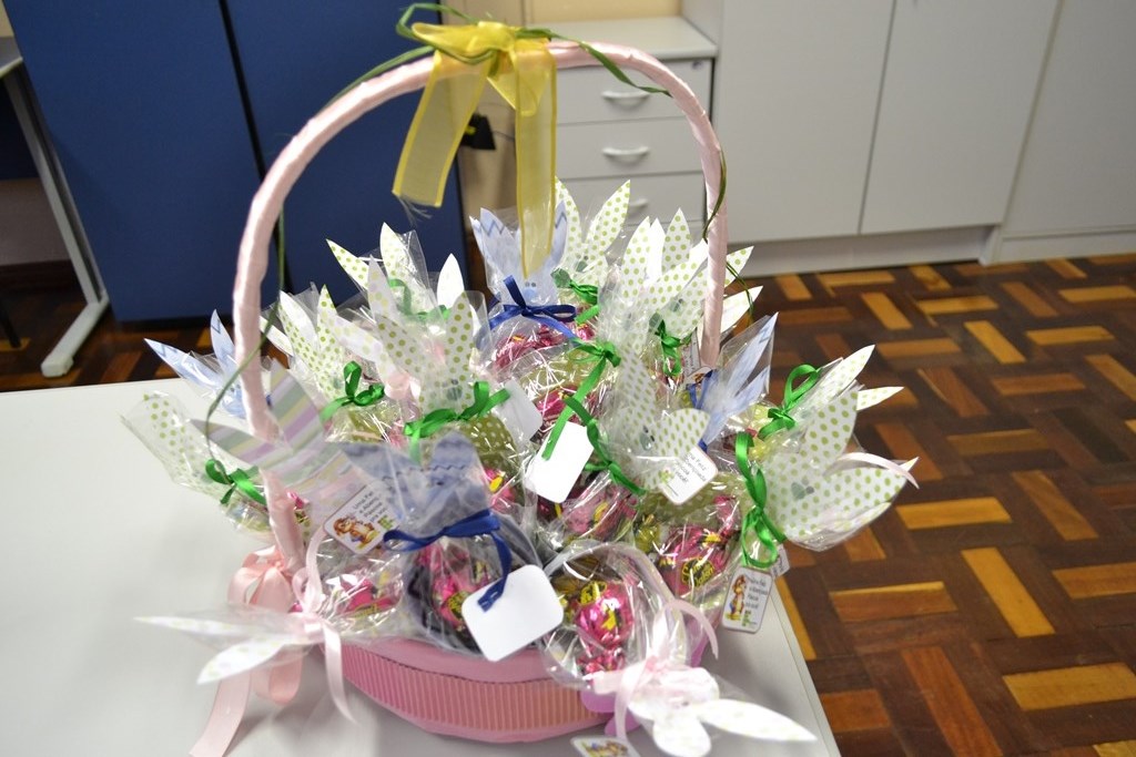 Stela também produziu um coelho de papel, com balas e bombons que está sendo entregue a todos os servidores. O mimo foi oferecido pela Equipe Diretiva.