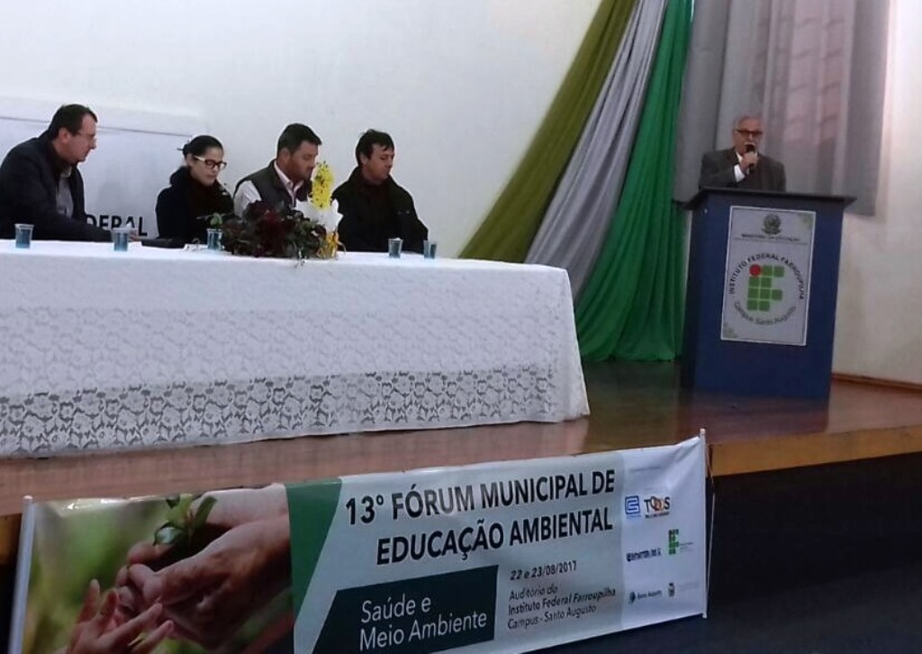 A abertura oficial foi realizada no dia 22, às 9h, com a presença do Prefeito Municipal, Naldo Wiegert; do vice-prefeito e Secretário Municipal de Desenvolvimento Econômico e Meio Ambiente, Marcelo Both;da Diretora de Ensino do IFFar - Campus Santo Augusto, Márcia Fink; a representante da Câmara Municipal de Vereadores de Santo Augusto, vereadora Dione Sperotto; da presidente da Comissão Executiva do 13º Fórum Municipal de Educação Ambiental, a professora do IFFar -Campus Santo Augusto, Clarissa Ricalde Gervásio; da Secretária Municipal de Educação e Cultura, Ana Paula da Rosa Reis; o representante do Escritório local da Emater-RS/Ascar, Carlos Alberto Weiller; o Chefe do Escritório da Corsan, Darci Schumann.